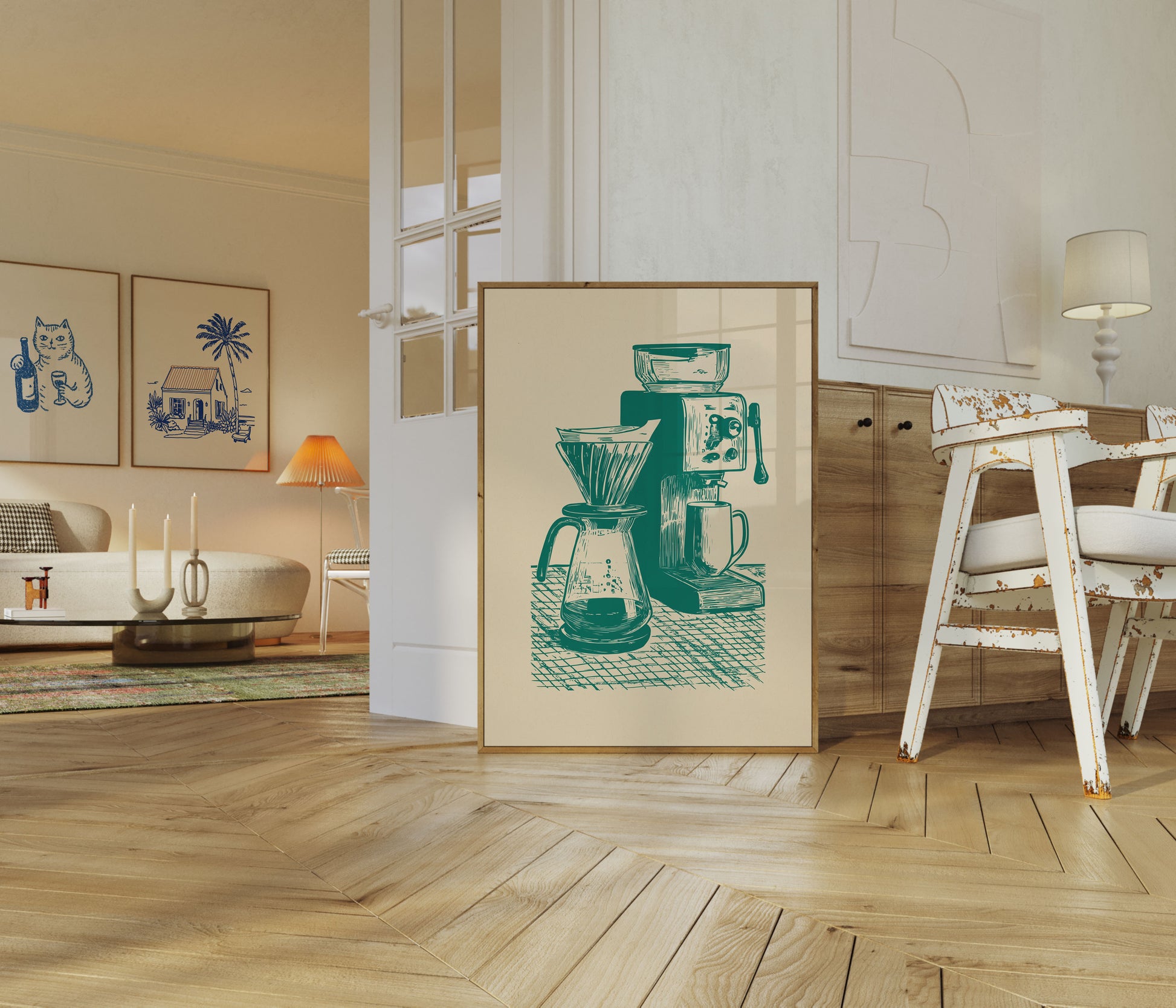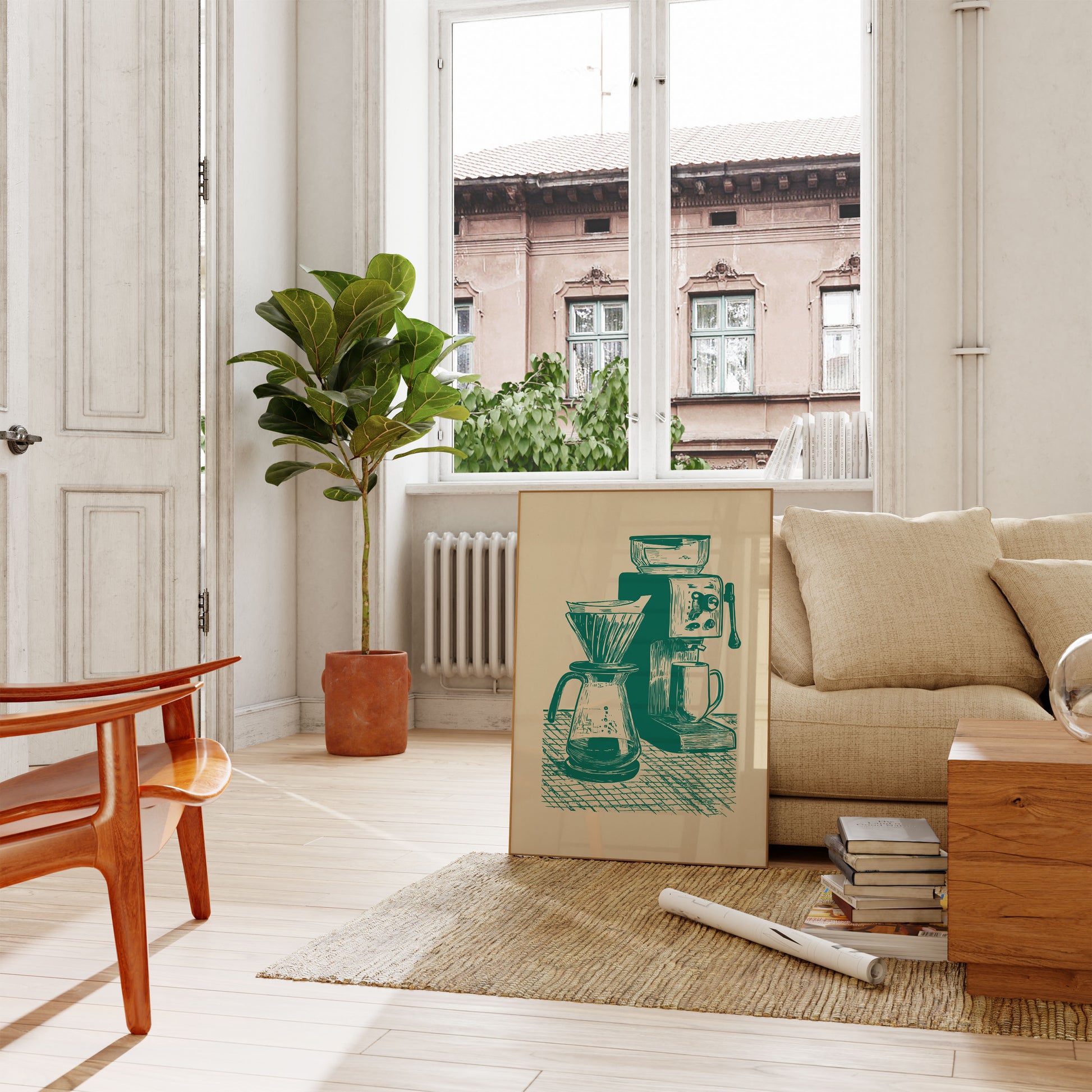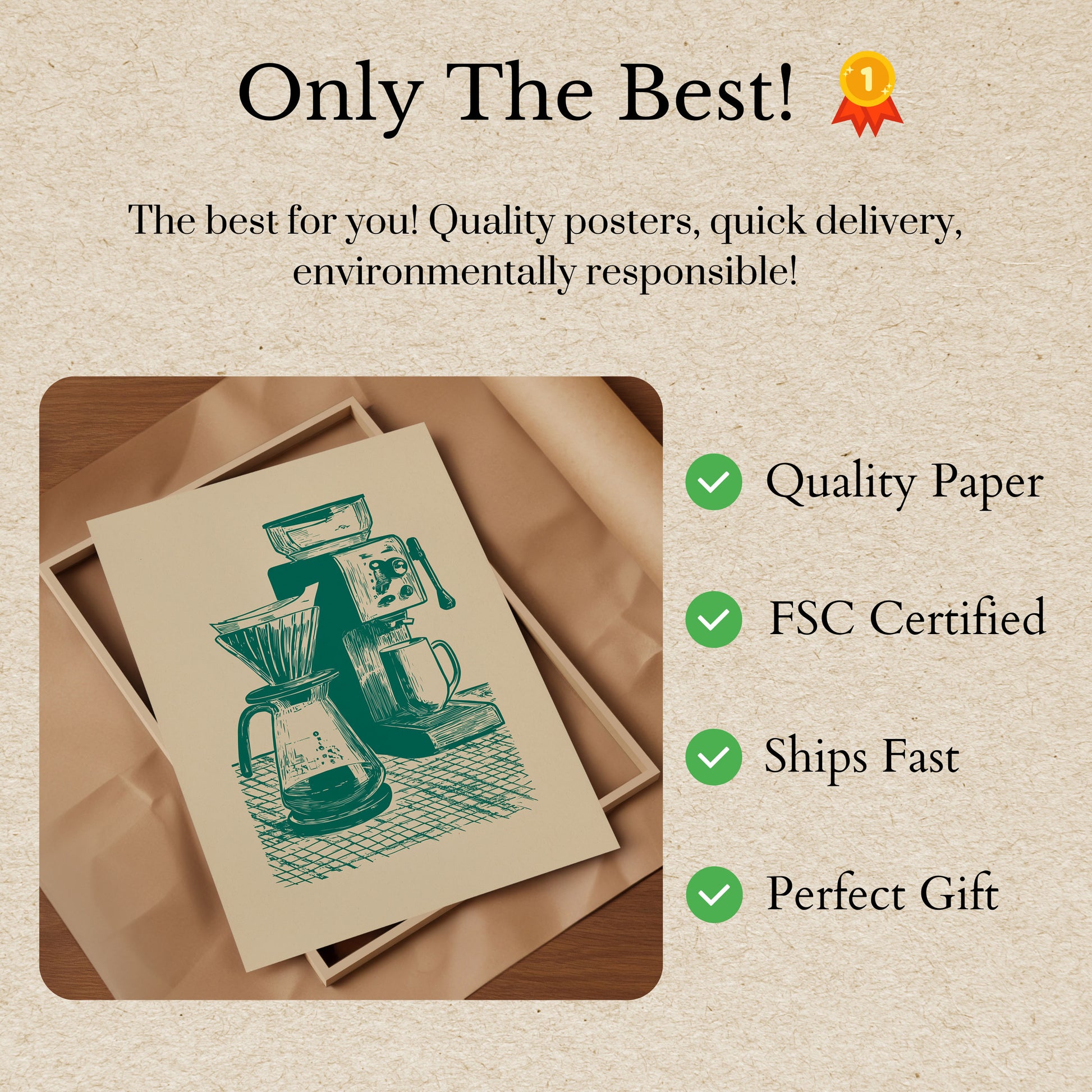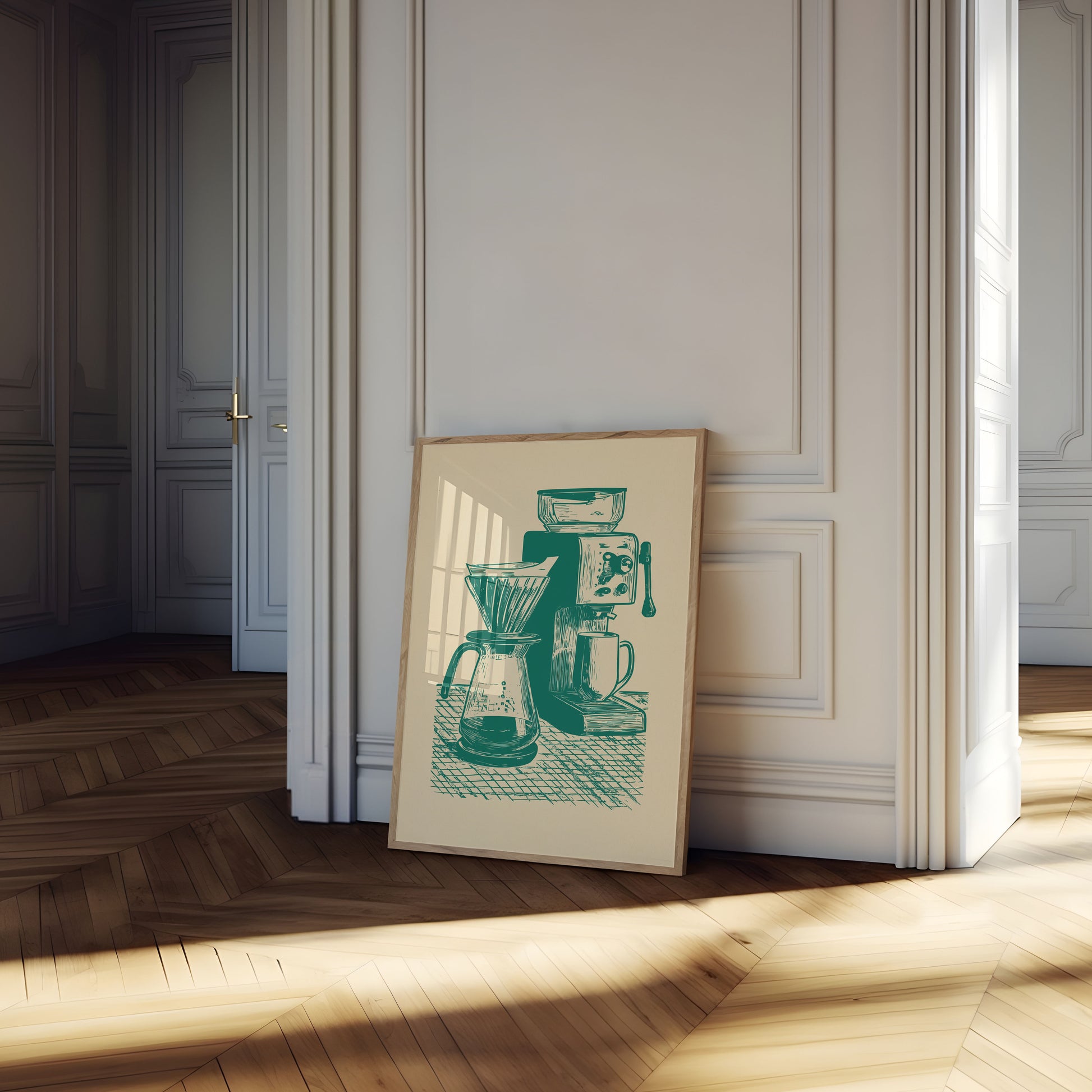 Immerse yourself in the artful world of coffee preparation with this stunning vintage-style illustration. Capturing the essence of manual brewing, the poster showcases a classic coffee grinder, pour-over setup, and brewing equipment in a rich, deep green palette that evokes nostalgia and craftsmanship. The detailed, etching-like style brings a sense of timeless elegance to any kitchen or coffee lover's space.