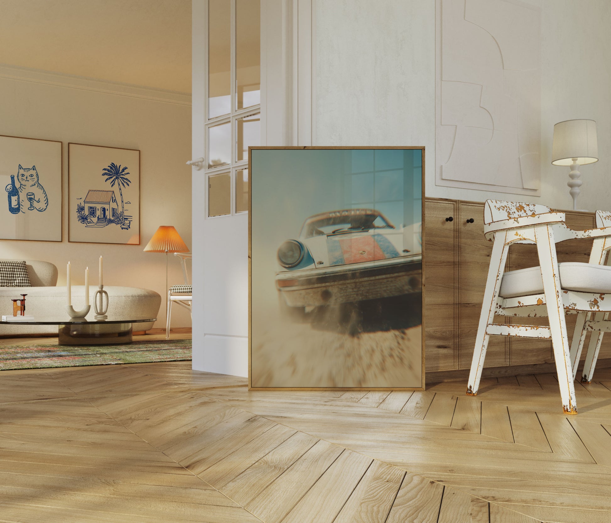 Capture the raw energy of classic motorsport with this electrifying Porsche poster. Blurred lines and dynamic motion evoke the heart-pounding excitement of vintage racing, featuring a classic sports car kicking up dust against a dreamy teal-and-cream backdrop. The soft focus and chromatic highlights transport you to an era of pure automotive passion.