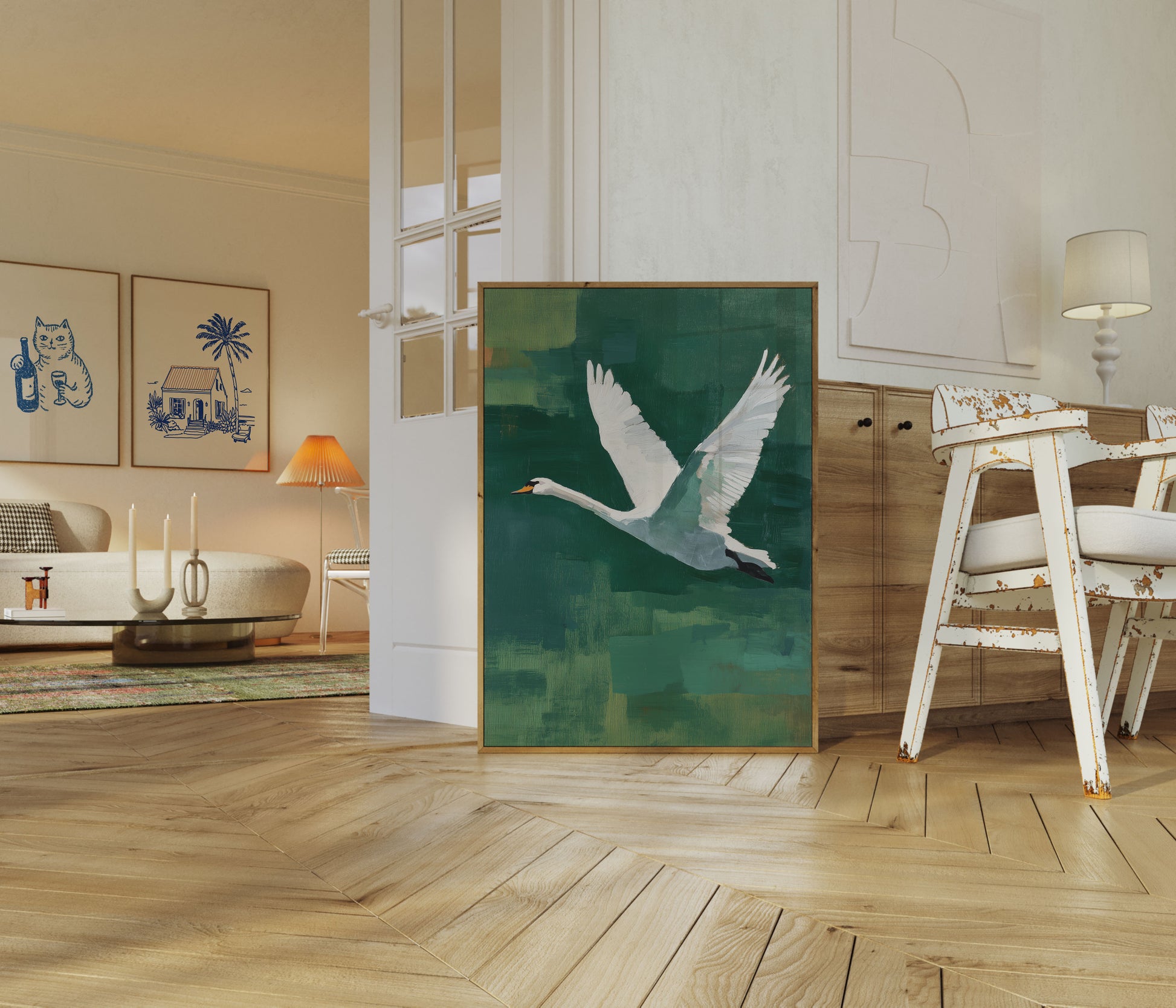 A breathtaking artistic rendering of a graceful white swan soaring against a rich, multilayered green background. The painting captures the bird's elegant wingspan and delicate movement, with subtle brushstrokes creating depth and texture. The serene color palette and dynamic composition invite viewers into a moment of natural beauty and tranquil motion.