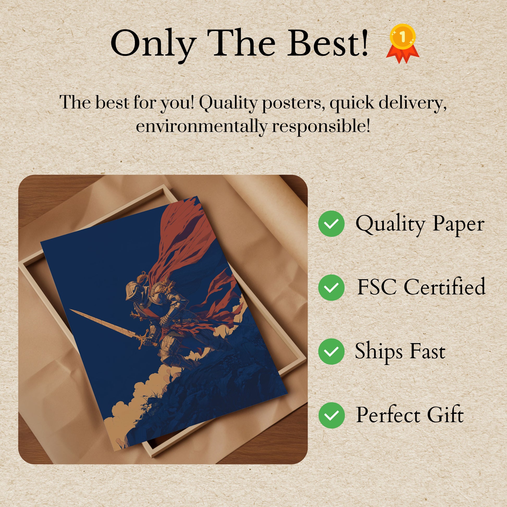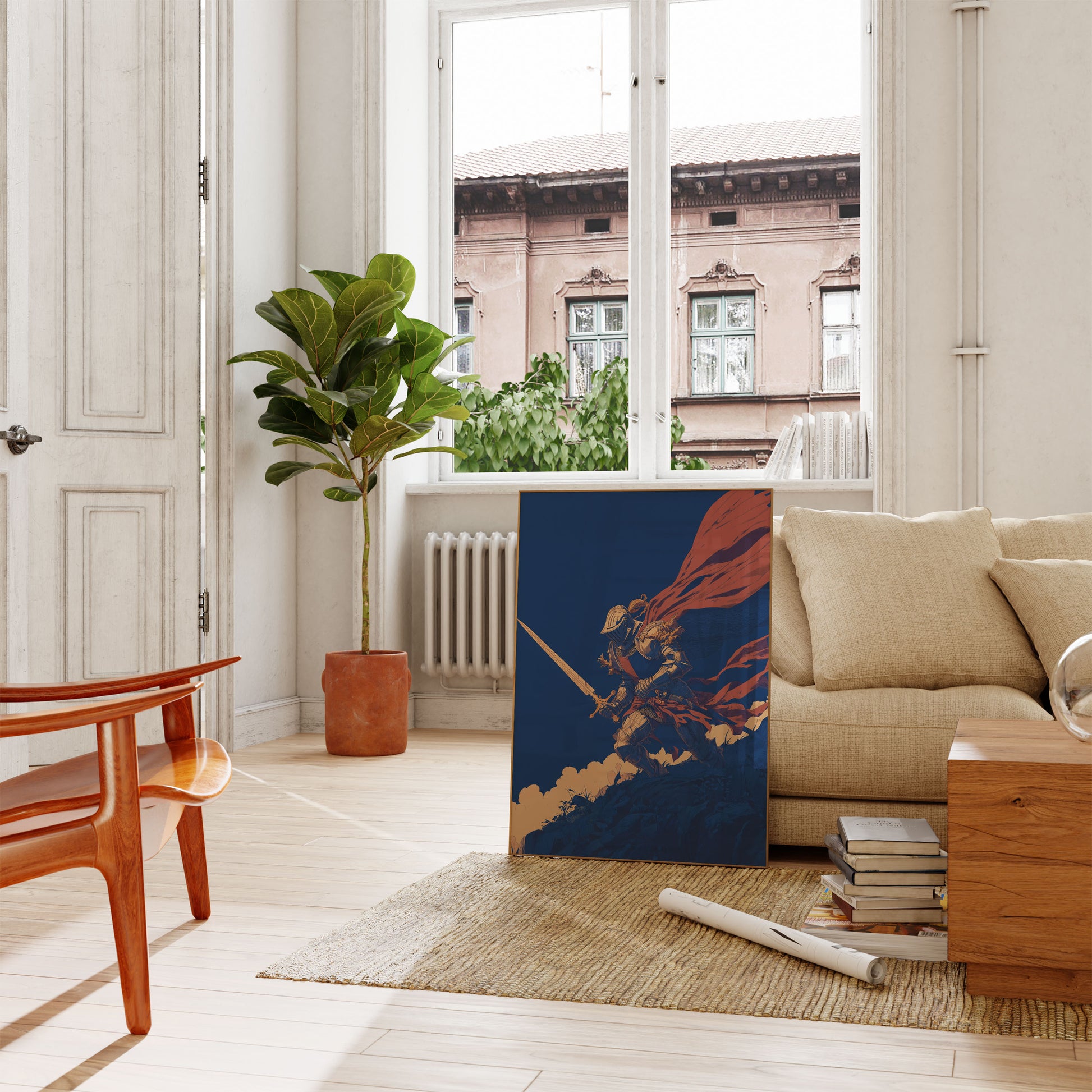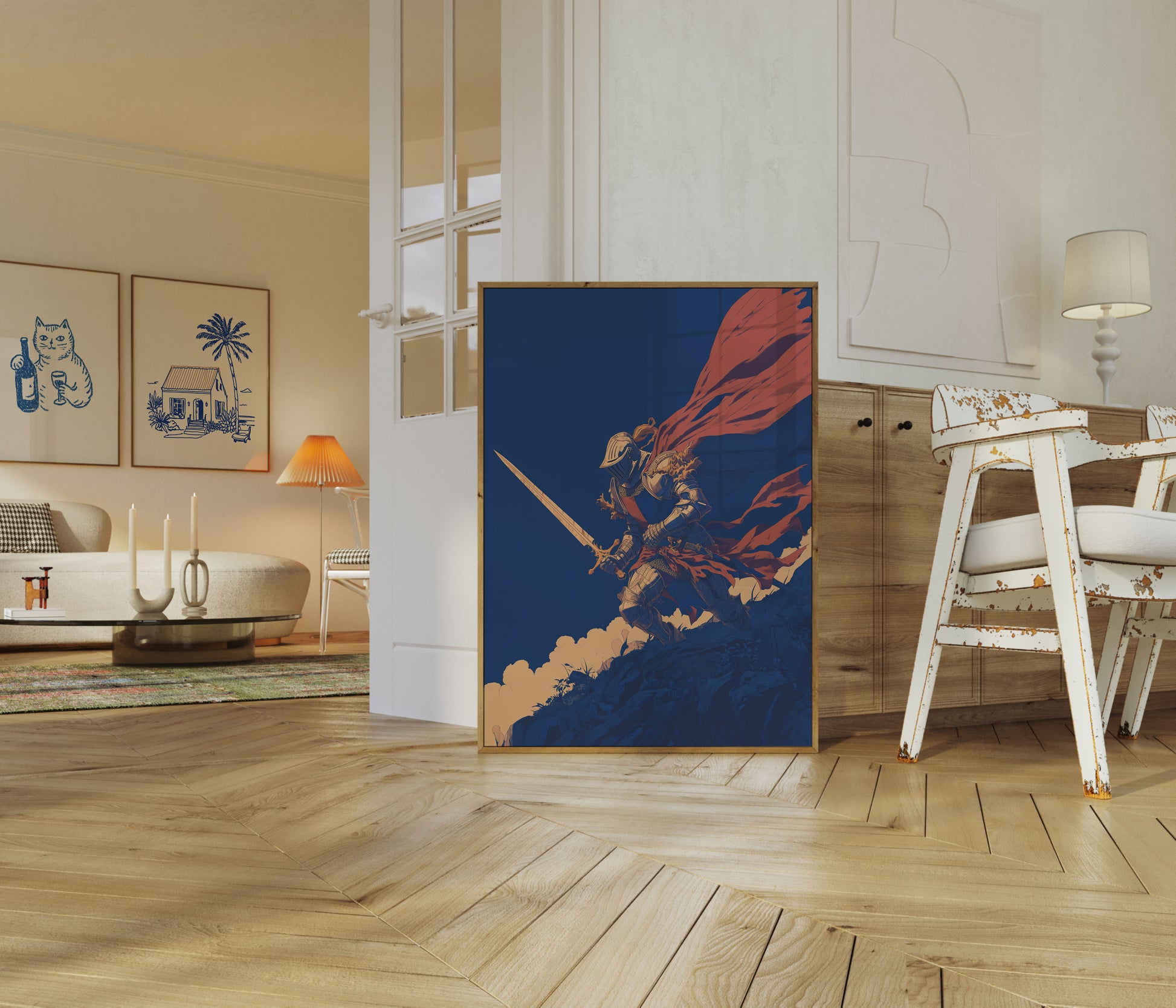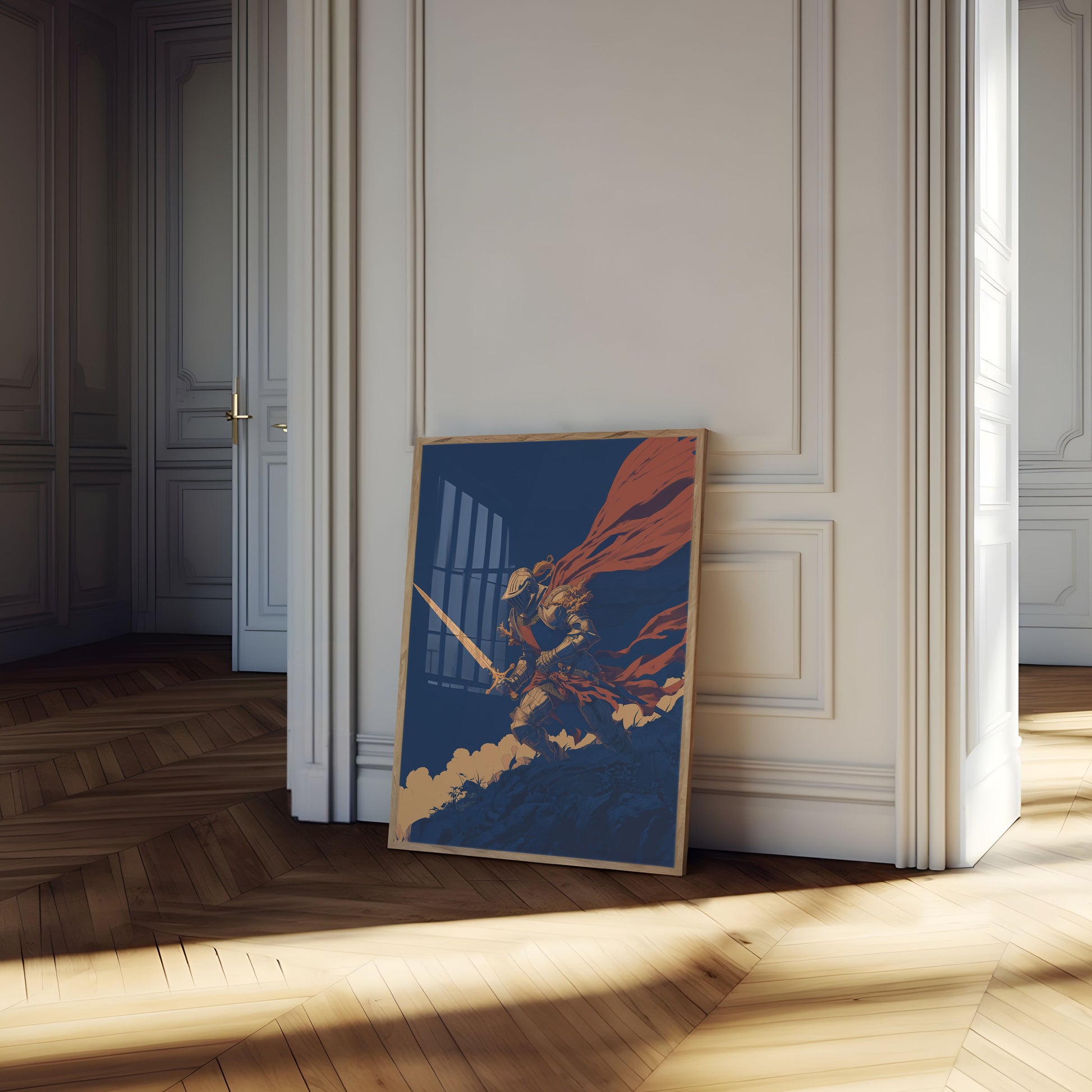 Emerge into an epic fantasy landscape where a valiant armored knight stands triumphant against a deep sapphire blue backdrop, his flowing crimson cape dramatically billowing in an unseen wind. Intricately detailed armor glints with golden highlights, while the warrior brandishes a powerful sword, poised on a rocky precipice above soft golden clouds. This stunning illustration captures a moment of heroic intensity, blending medieval warrior aesthetics with a bold, graphic art style that commands attention and imagination.
