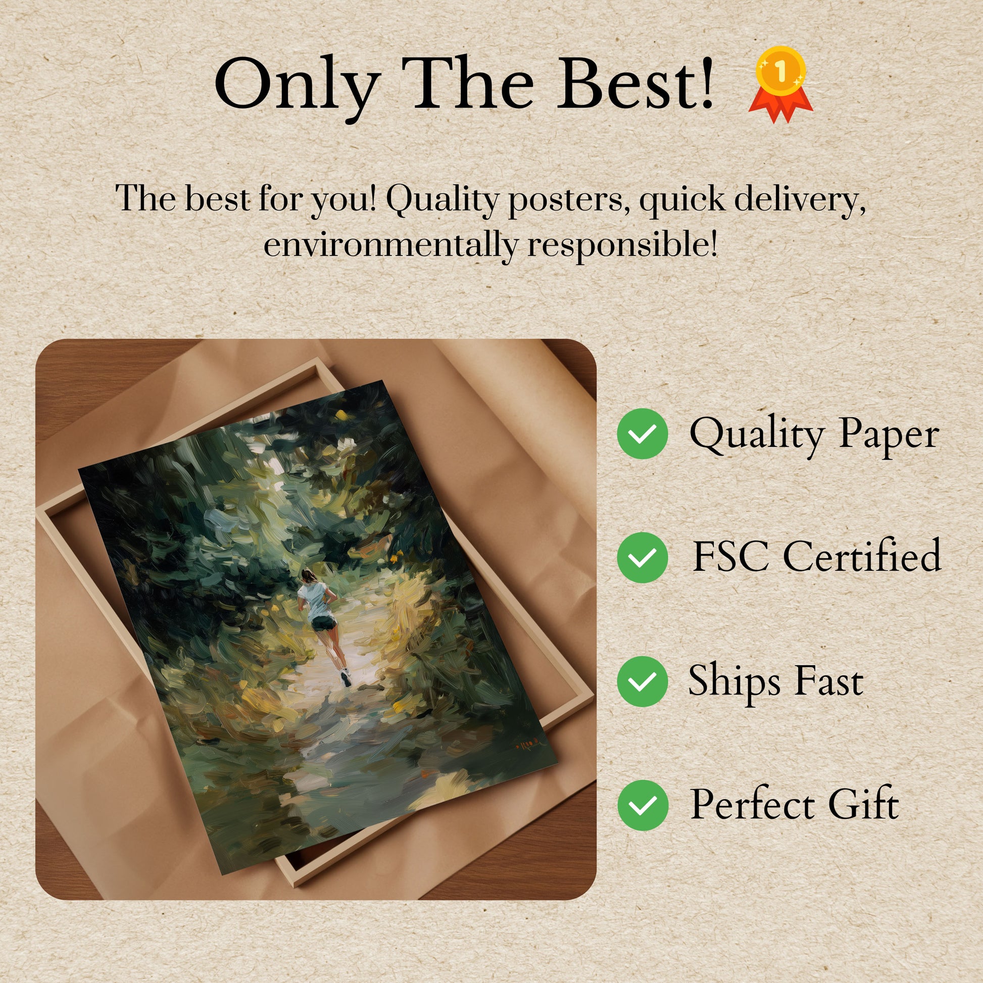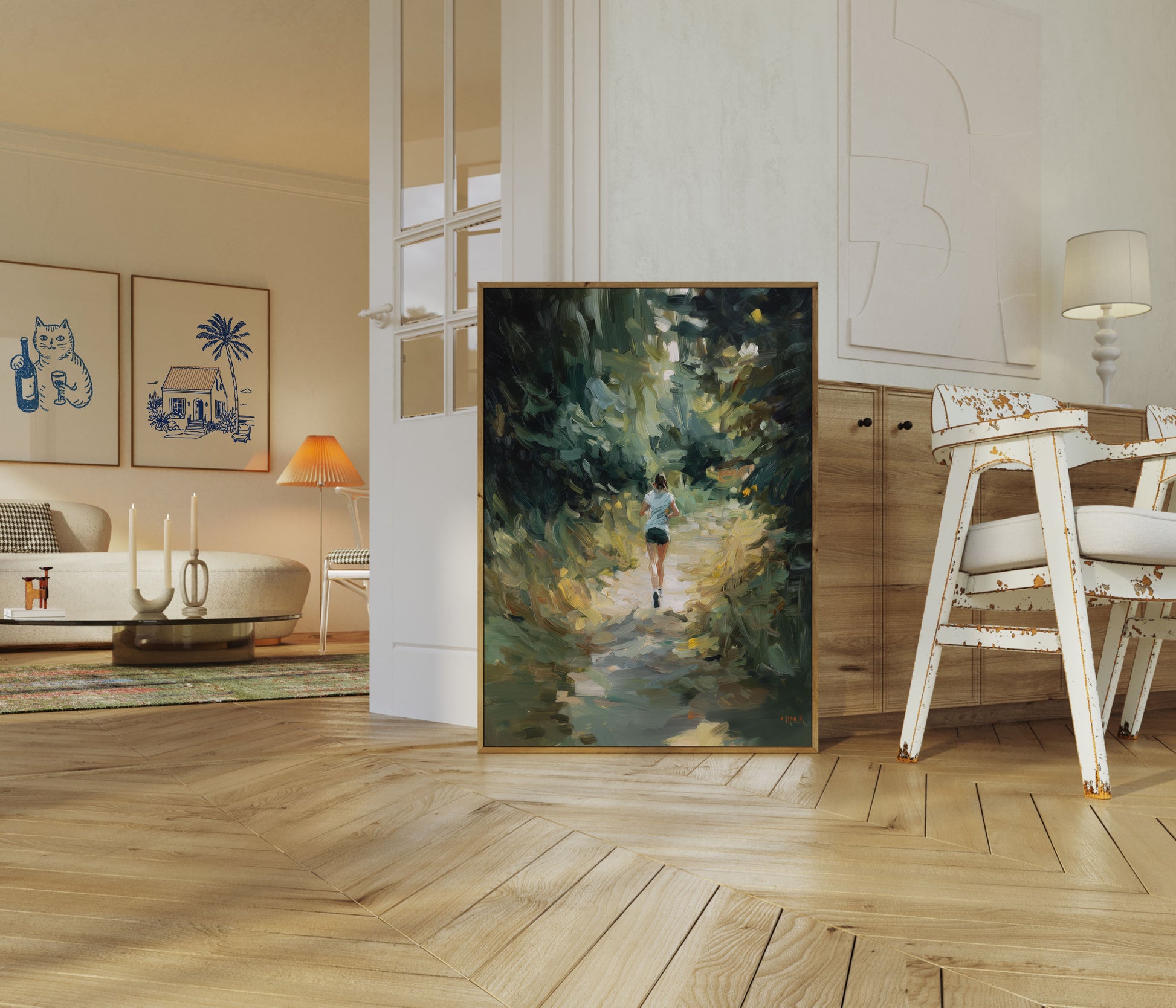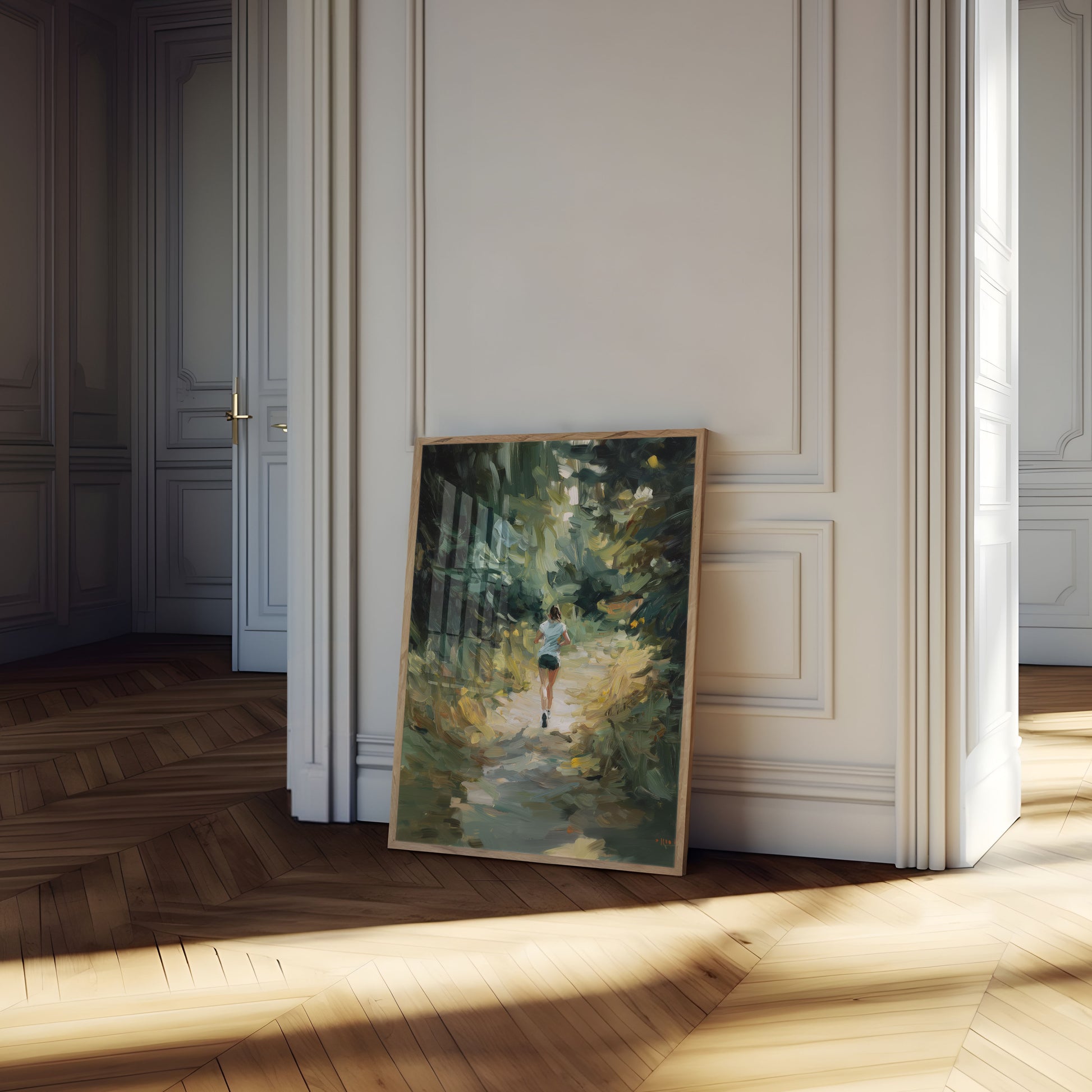 Immerse yourself in the dynamic energy of a solitary runner navigating a lush, painterly forest path. This stunning oil painting captures the essence of movement and nature, with bold brushstrokes creating a vibrant, impressionistic landscape that pulses with life and color. The runner disappears into a golden-green tunnel of foliage, embodying freedom, determination, and the raw beauty of outdoor exploration.