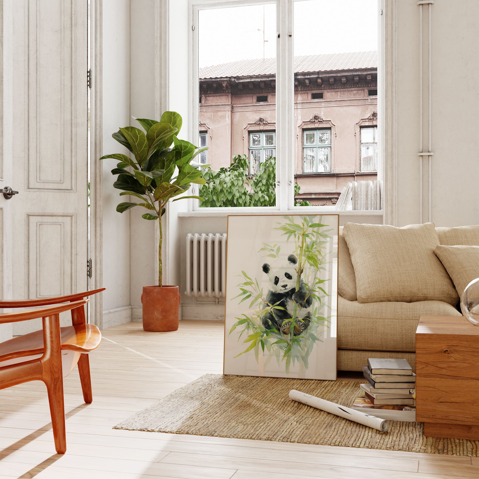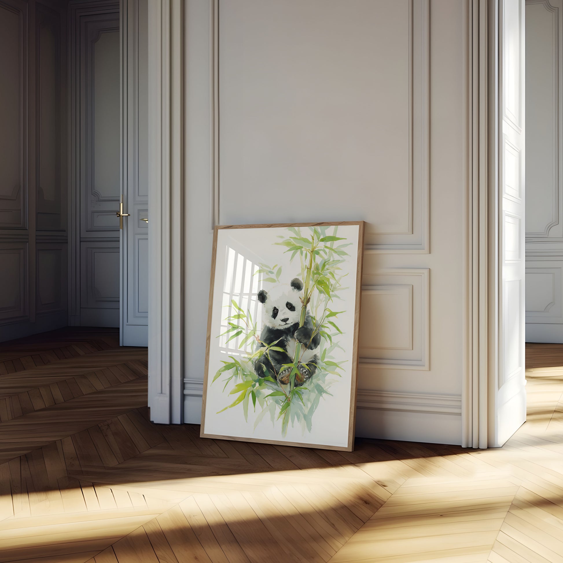 Immerse yourself in the serene world of this stunning watercolor panda, nestled among soft green bamboo leaves. The delicate artwork captures the essence of a playful giant panda, with its distinctive black and white markings blending harmoniously with the ethereal green background. Each brushstroke brings a sense of tranquility and natural beauty, making the Gentle Bamboo Panda a captivating addition to any nature lover's space.