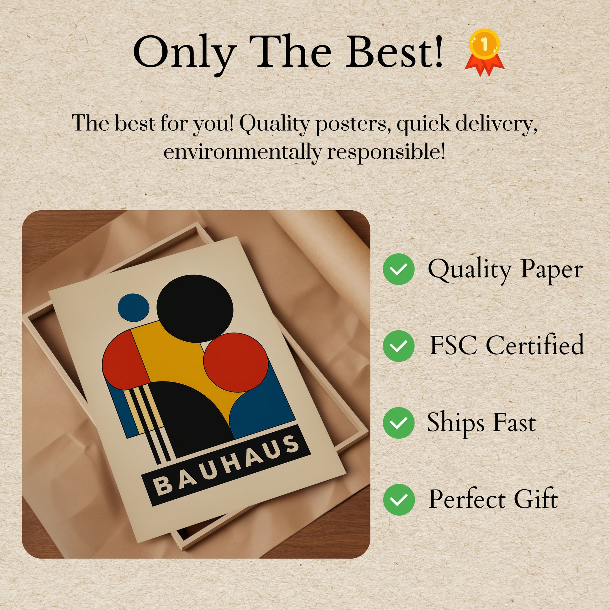 A stunning tribute to the legendary Bauhaus art movement, this poster captures the essence of geometric abstraction with bold primary colors and precise circular shapes. Featuring a harmonious composition of blue, red, yellow, and black circles and rectangles, the design embodies the movement's core principles of simplicity, functionality, and artistic innovation. This iconic poster is a perfect statement piece for design enthusiasts and modernist art lovers.
