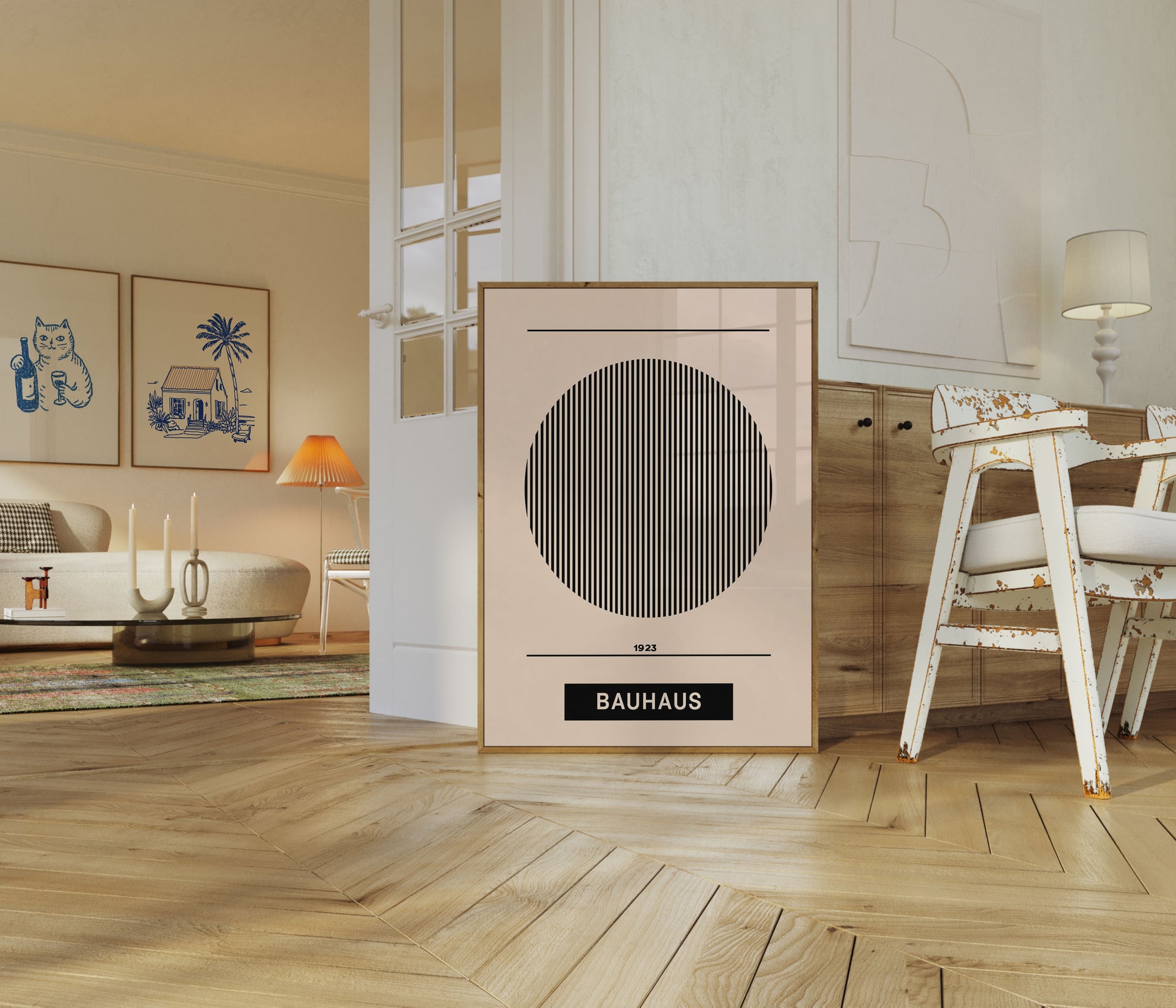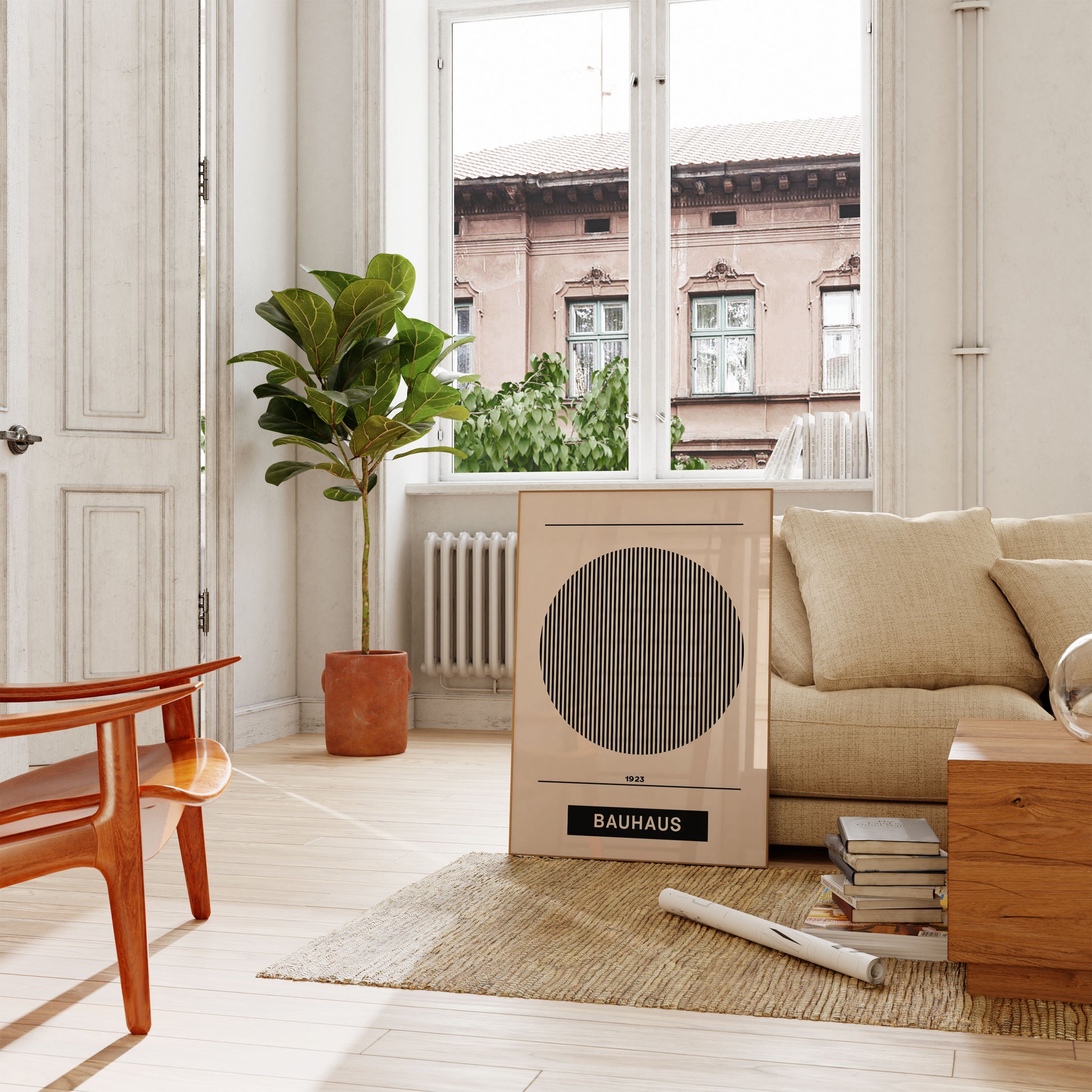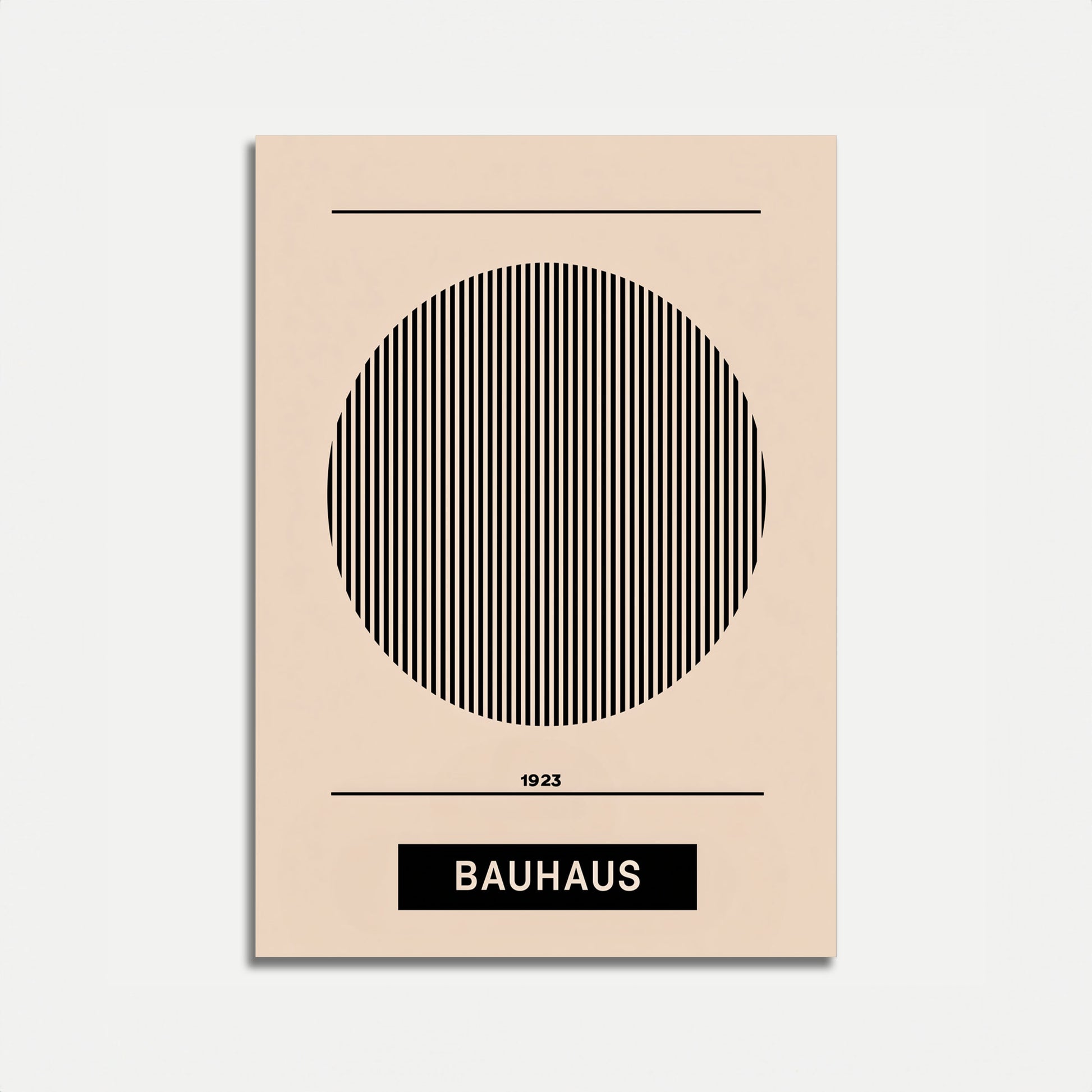 Experience the pure essence of Bauhaus design with this striking 1923 geometric poster. A mesmerizing black and white circular composition of precise vertical lines creates a powerful visual rhythm against a soft beige background. This iconic minimalist artwork captures the revolutionary spirit of the Bauhaus movement, transforming simple geometric elements into a profound artistic statement.