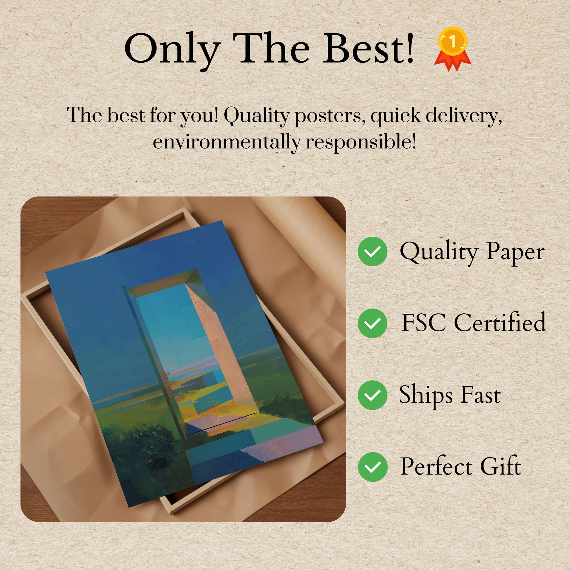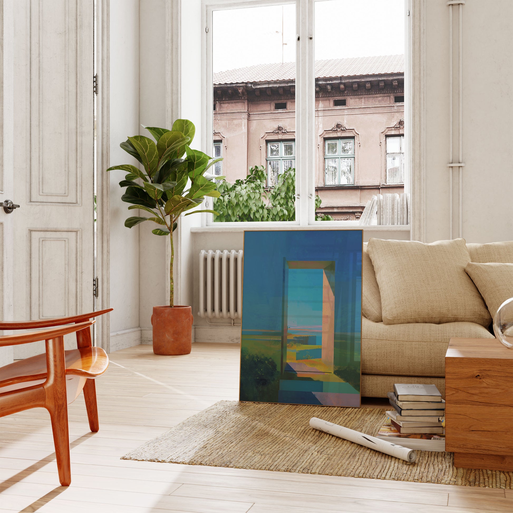 Step into a mesmerizing world of geometric abstraction where architectural forms meet surreal landscapes. This stunning poster captures a doorway-like portal framing a dreamlike vista of layered blues, greens, and golden yellows, creating a sense of depth and infinite possibility. The unique color palette and precise geometric shapes invite viewers to explore a transformative visual journey between reality and imagination.