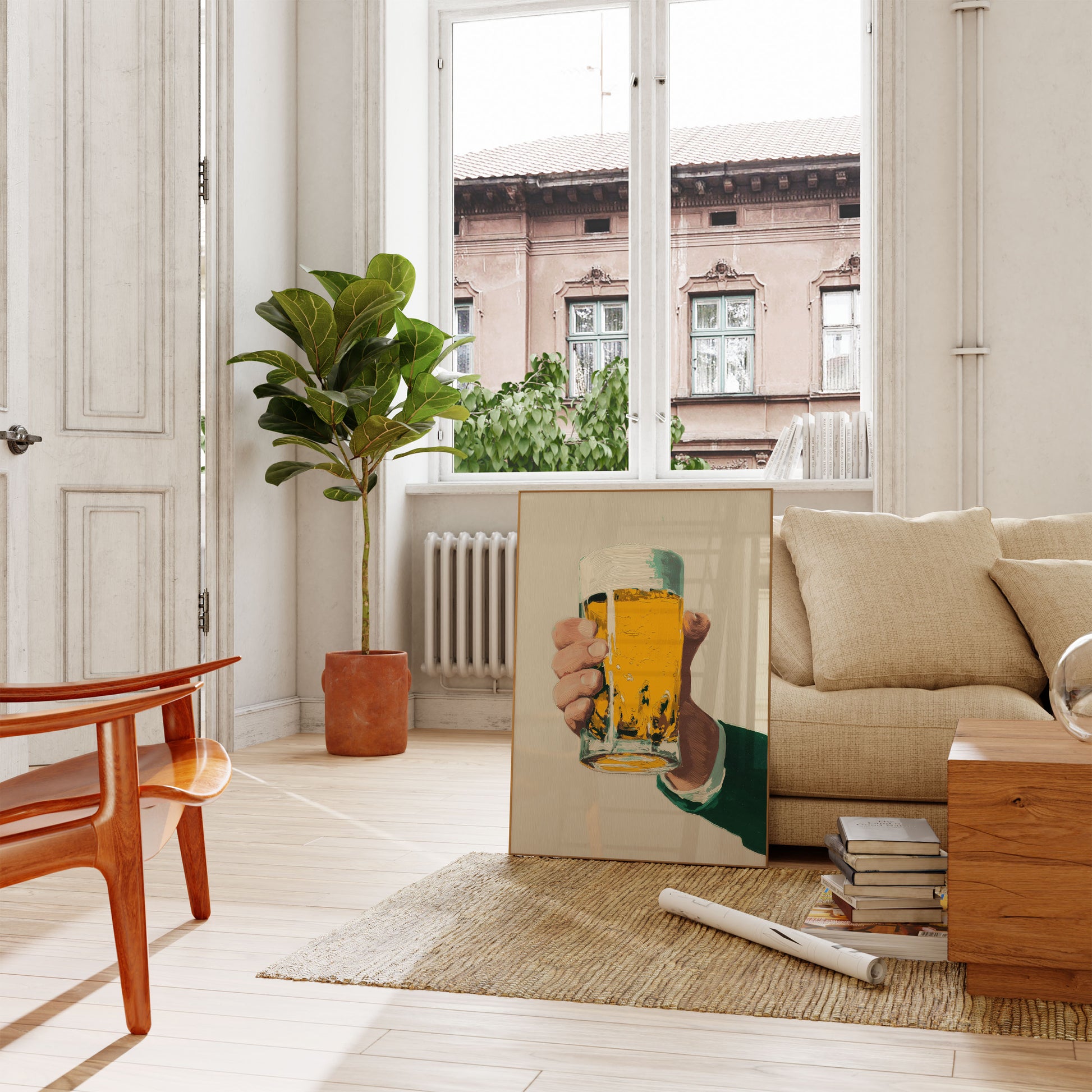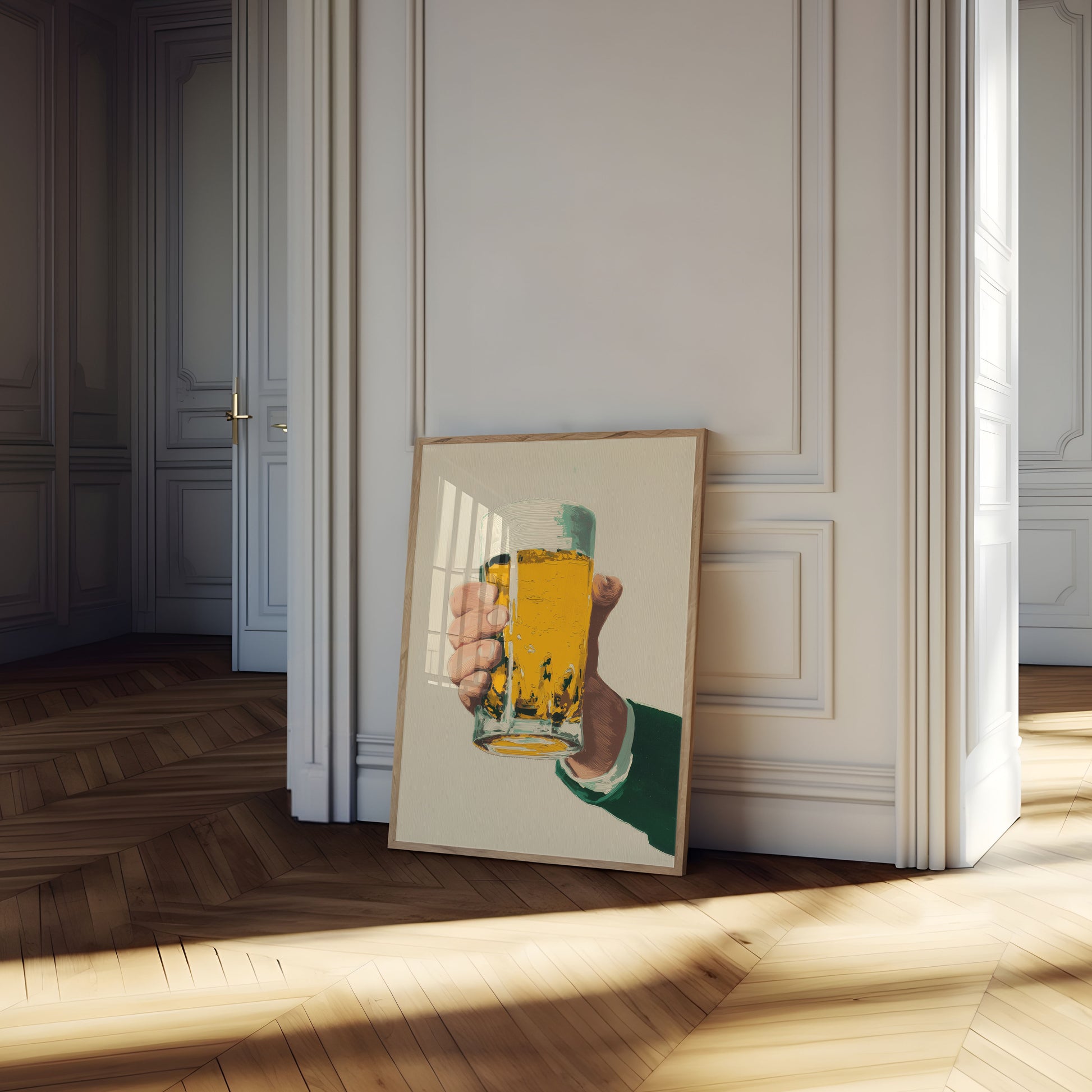 Immerse yourself in the vibrant artistry of this beer poster, where a powerful hand clutches a luminous glass of golden brew. The painterly style captures the texture of a perfectly poured beer, with rich yellow tones and dynamic brushstrokes that bring the moment to life. Every detail celebrates the simple pleasure of holding a cold, refreshing beer.