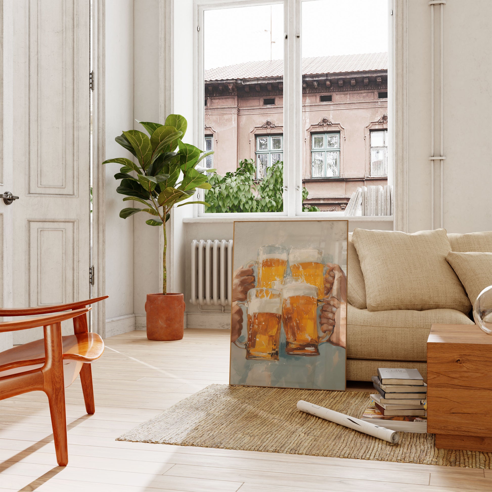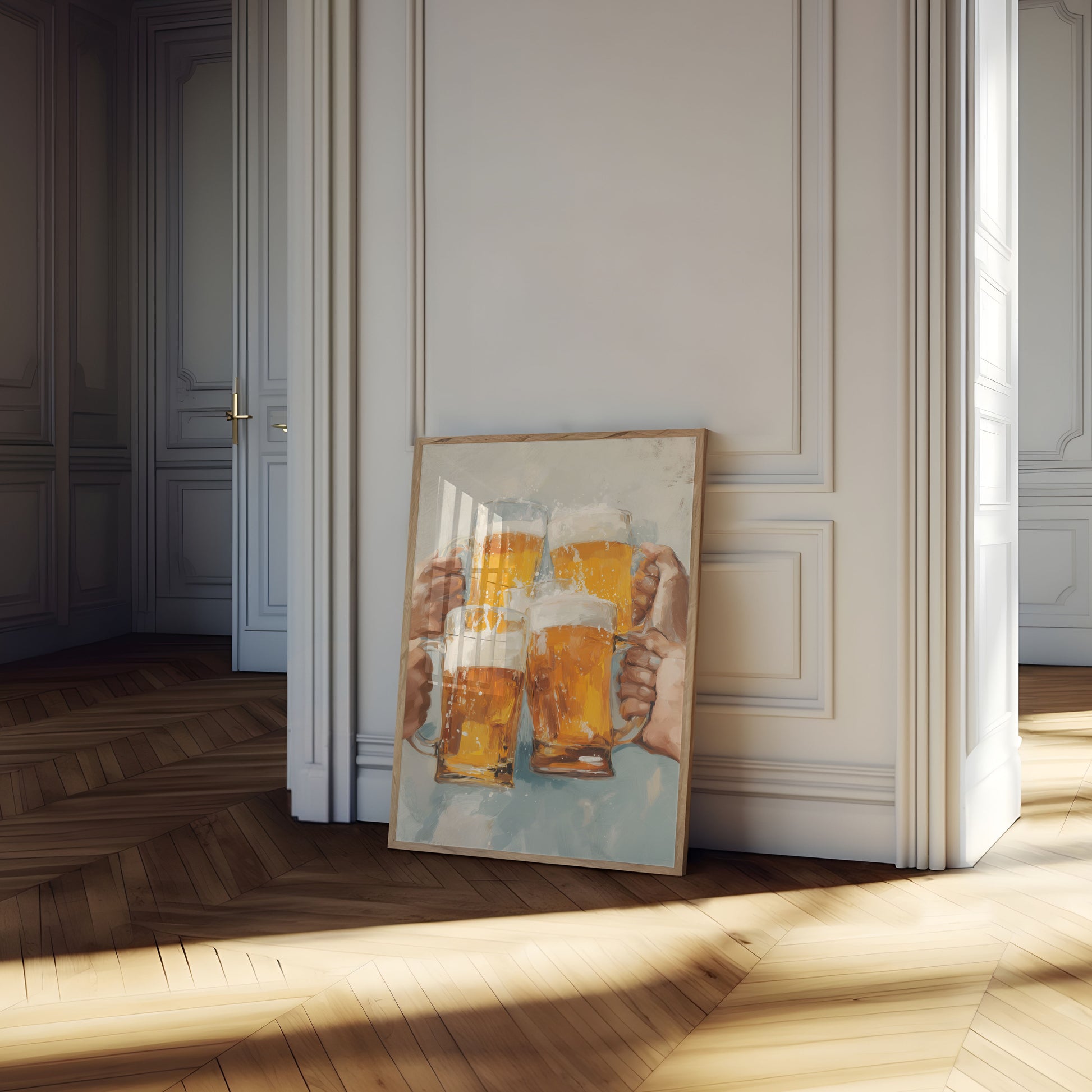 Capture the spirit of camaraderie with this vibrant beer toast artwork that radiates warmth and joy. The painting showcases four overflowing beer mugs, their golden liquid and creamy foam perfectly capturing the moment of a jubilant cheers. Rich amber tones and delicate brushstrokes bring this celebratory scene to life, inviting viewers to join in the festive atmosphere.