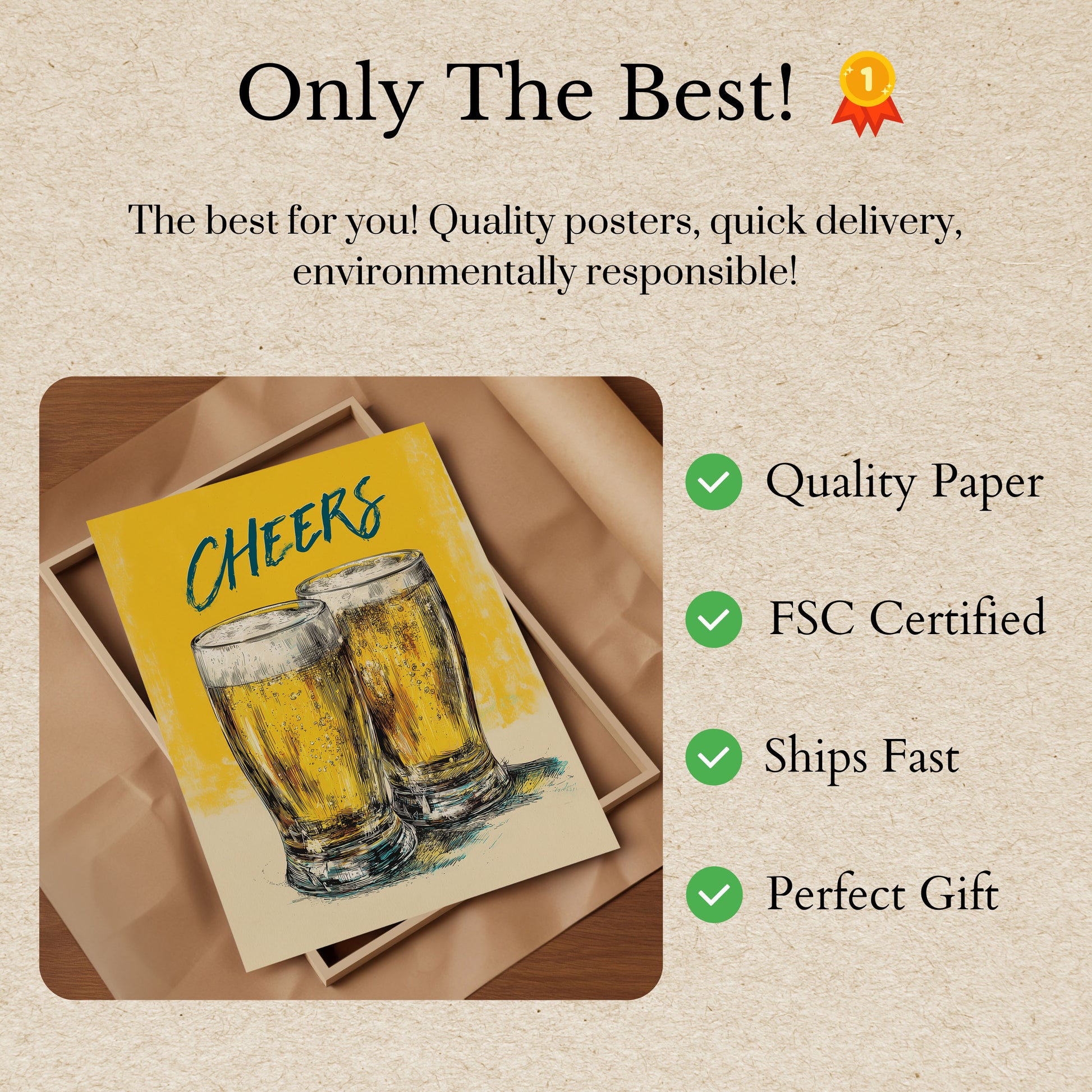 Celebrate the art of beer with this vibrant yellow and golden poster featuring two frosty glasses of refreshing brew. The stylized illustration captures the effervescence and joy of sharing a cold drink, with dynamic sketchy lines and a bold 'CHEERS' typography that brings energy and excitement to the artwork. Perfect for beer enthusiasts and home bar decor that captures the spirit of good times.