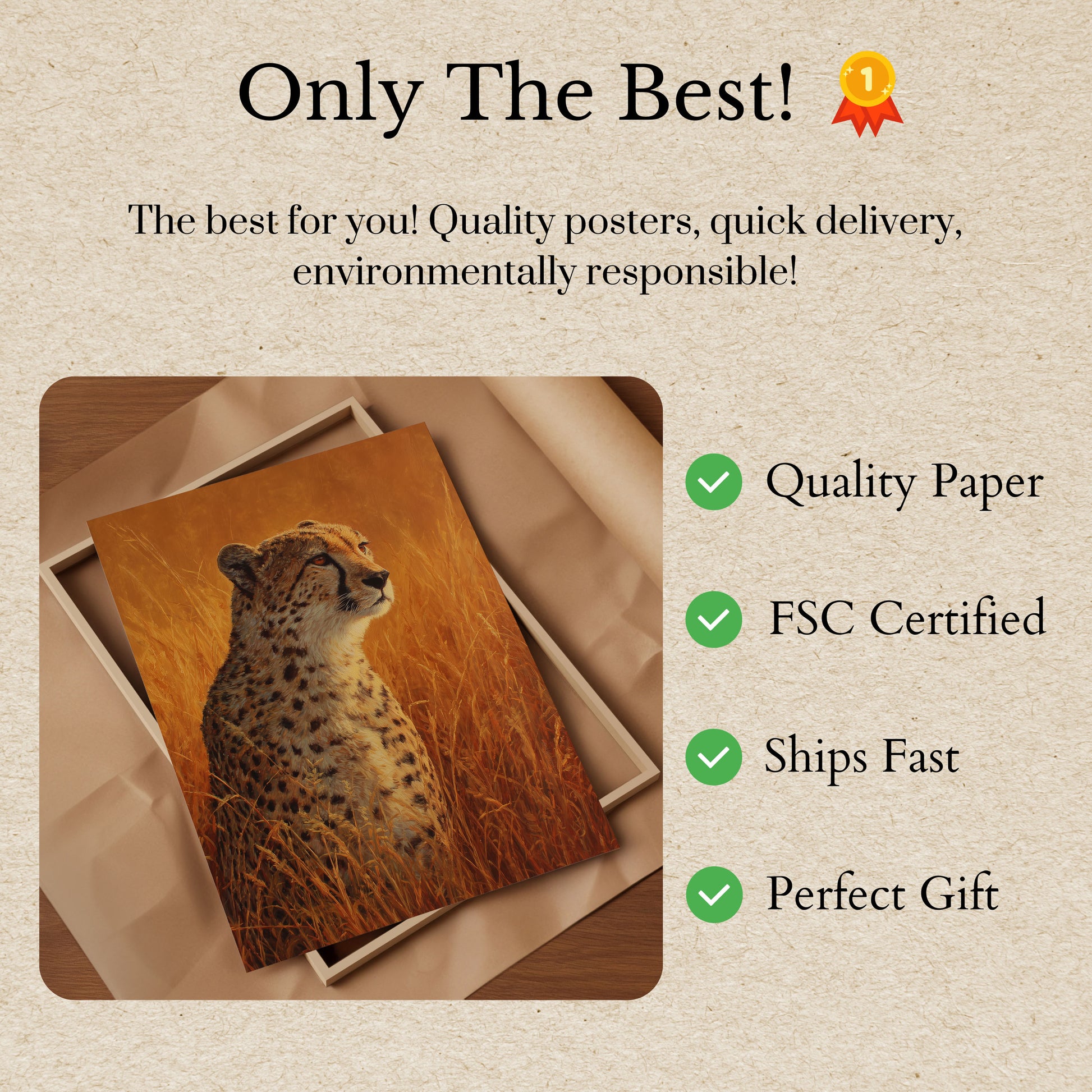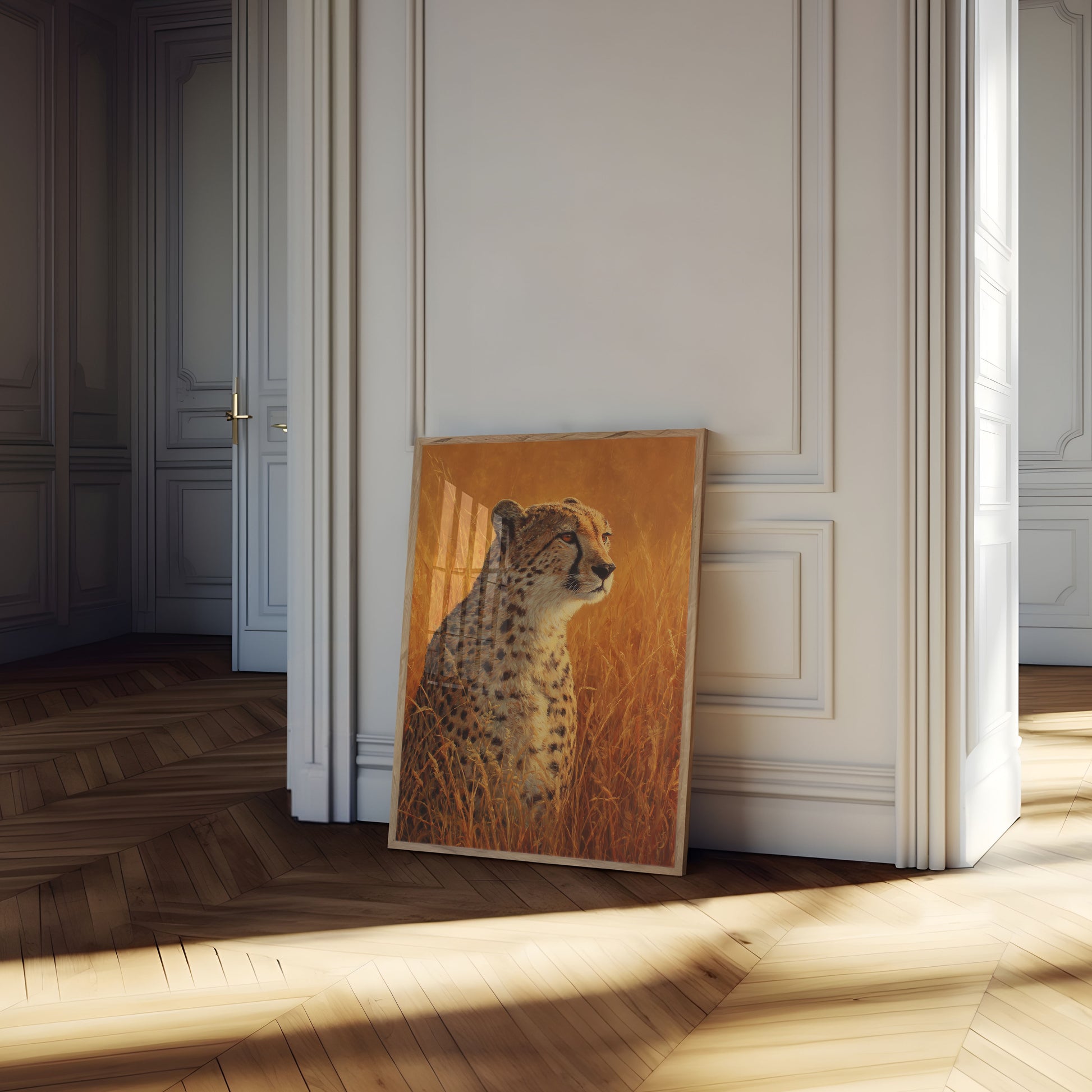 Capture the essence of wild African beauty with this stunning cheetah portrait, set against a breathtaking golden grassland backdrop. The majestic predator sits alert, its spotted coat blending seamlessly with the warm, sun-drenched landscape, creating an intimate moment of natural serenity and raw wilderness. Rich amber tones and intricate details bring this magnificent creature to life, inviting viewers into the heart of the savanna.