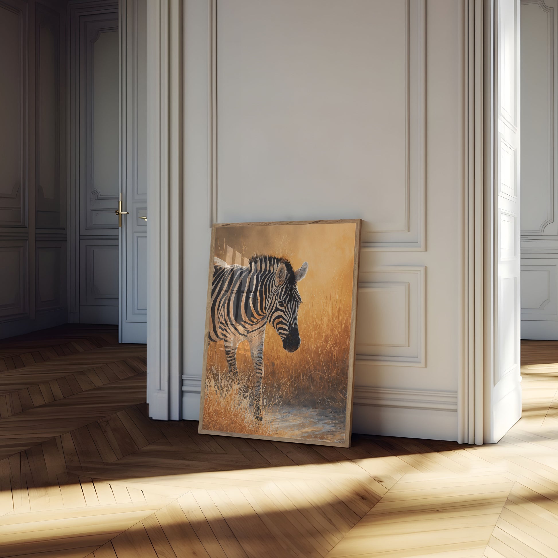 Immerse yourself in the warm, golden light of the African grasslands with this stunning zebra portrait. The artwork captures a solitary zebra standing amidst sun-drenched grasses, its iconic black and white stripes creating a mesmerizing contrast against the rich, amber background. Every detail is rendered with incredible precision, from the zebra's alert ears to the delicate grass blades that seem to shimmer in the ethereal light.