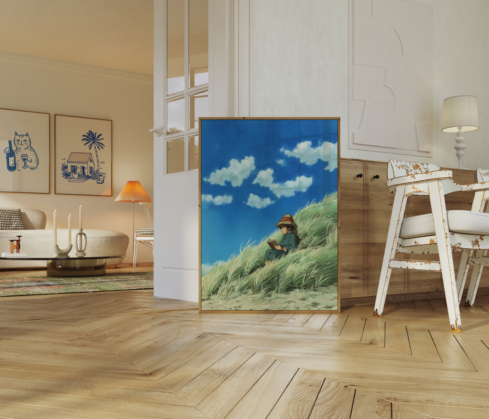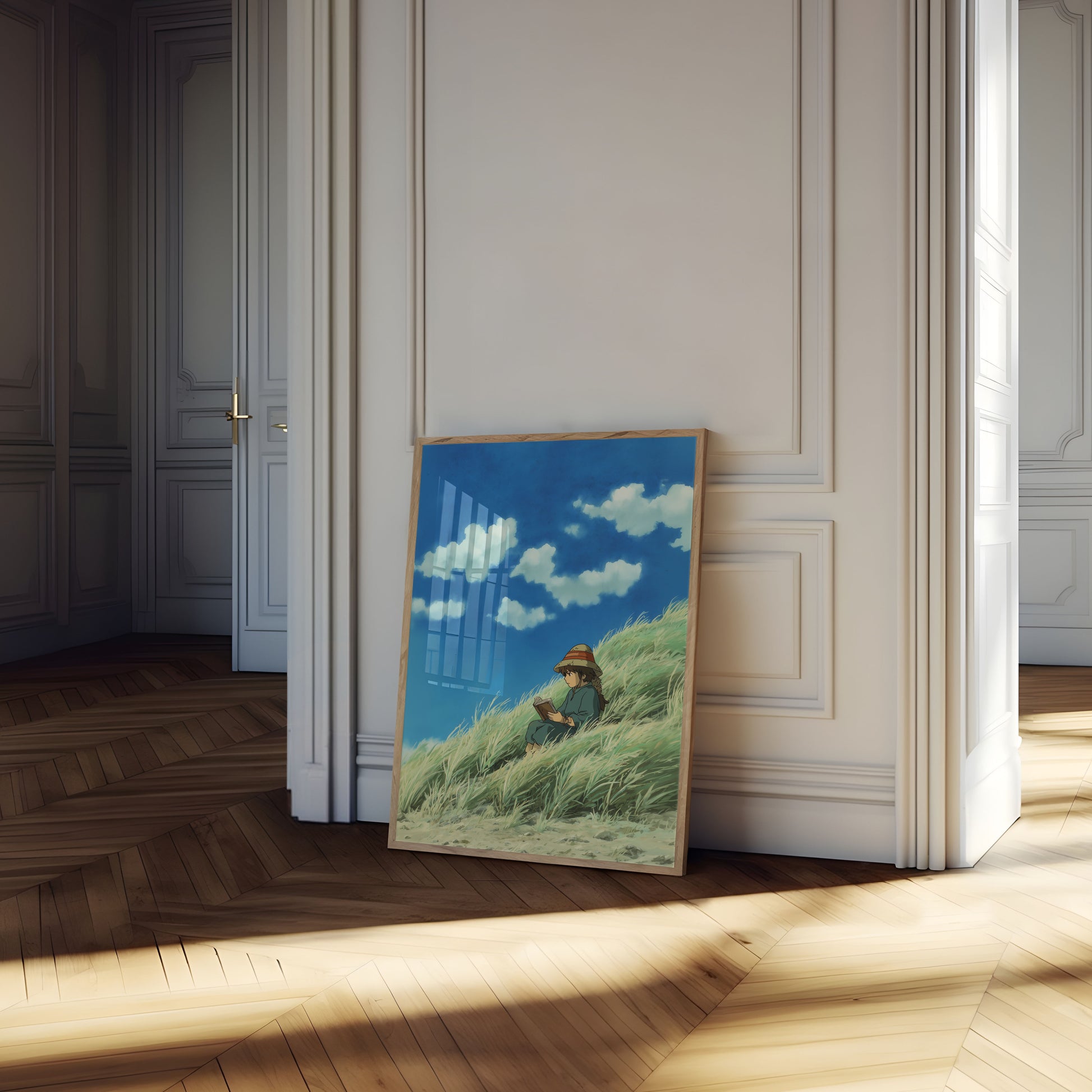 A serene Studio Ghibli-inspired scene captures a young reader nestled in swaying green grass, surrounded by billowing clouds and a brilliant blue sky. The soft, dreamy illustration portrays a moment of peaceful solitude, where imagination and nature intertwine in a tranquil landscape of gentle movement and quiet contemplation. A beautifully rendered artwork that evokes childhood wonder and the simple joy of reading outdoors.