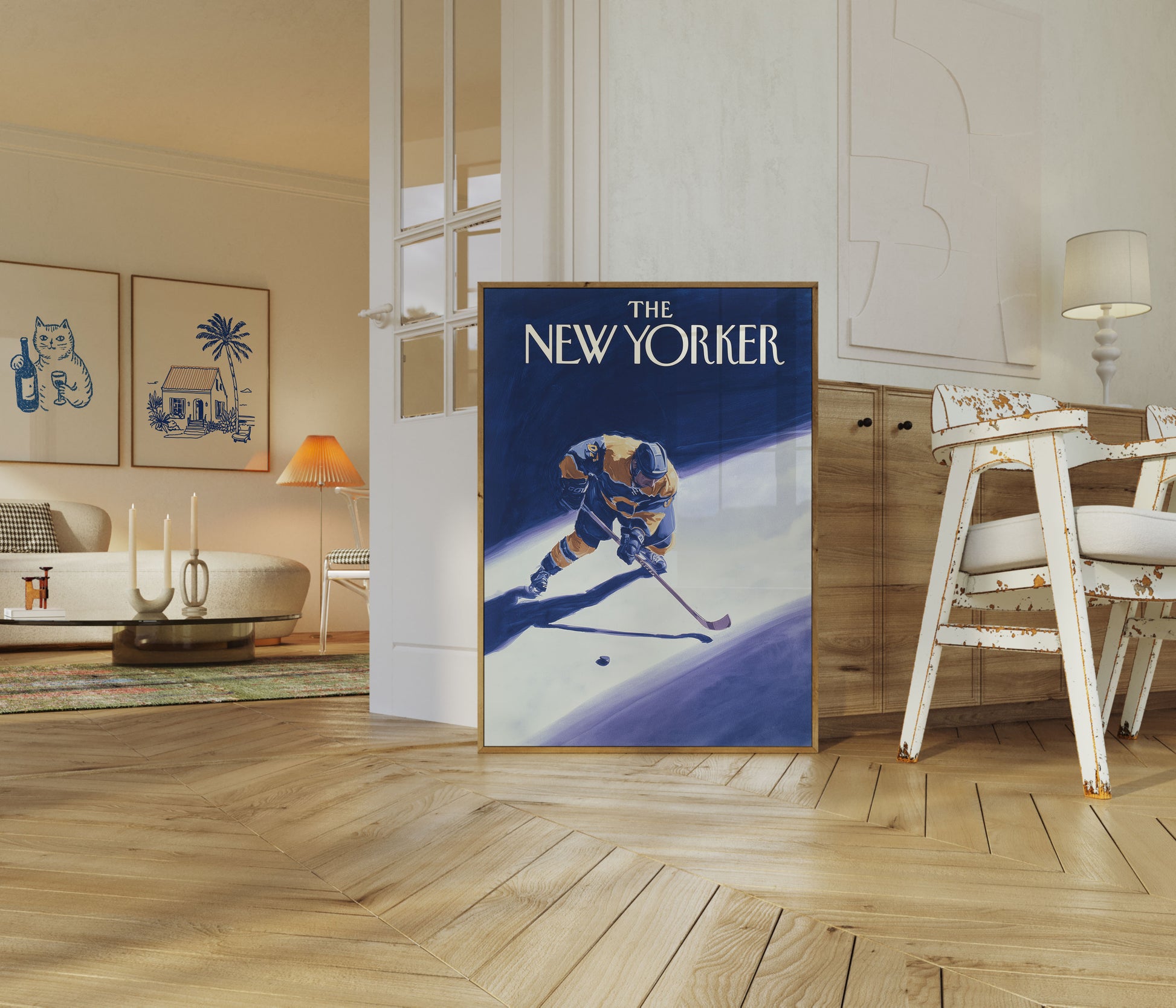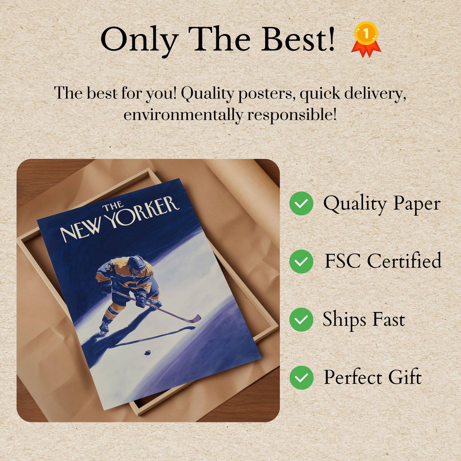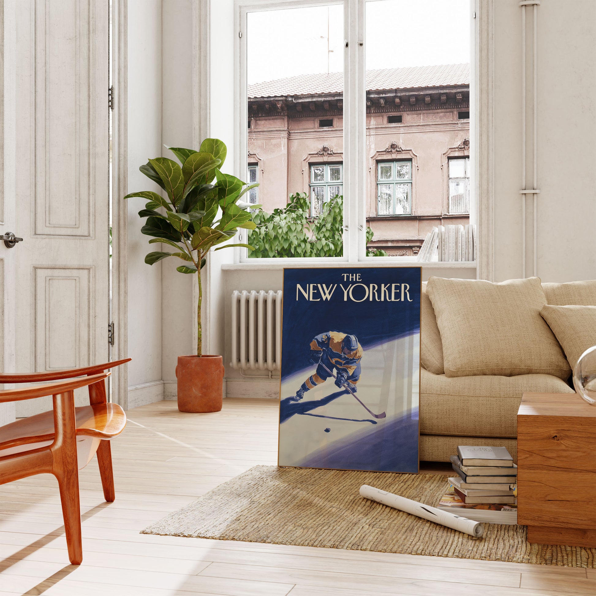Capture the dynamic spirit of hockey with this stunning New Yorker magazine-inspired poster featuring an intense hockey player mid-stride. The artwork brilliantly captures the movement and energy of the sport, with a deep blue and golden color palette that creates a dramatic, atmospheric scene of athletic prowess. The player's dynamic pose and long shadow against the icy background evoke the grace and power of professional hockey.