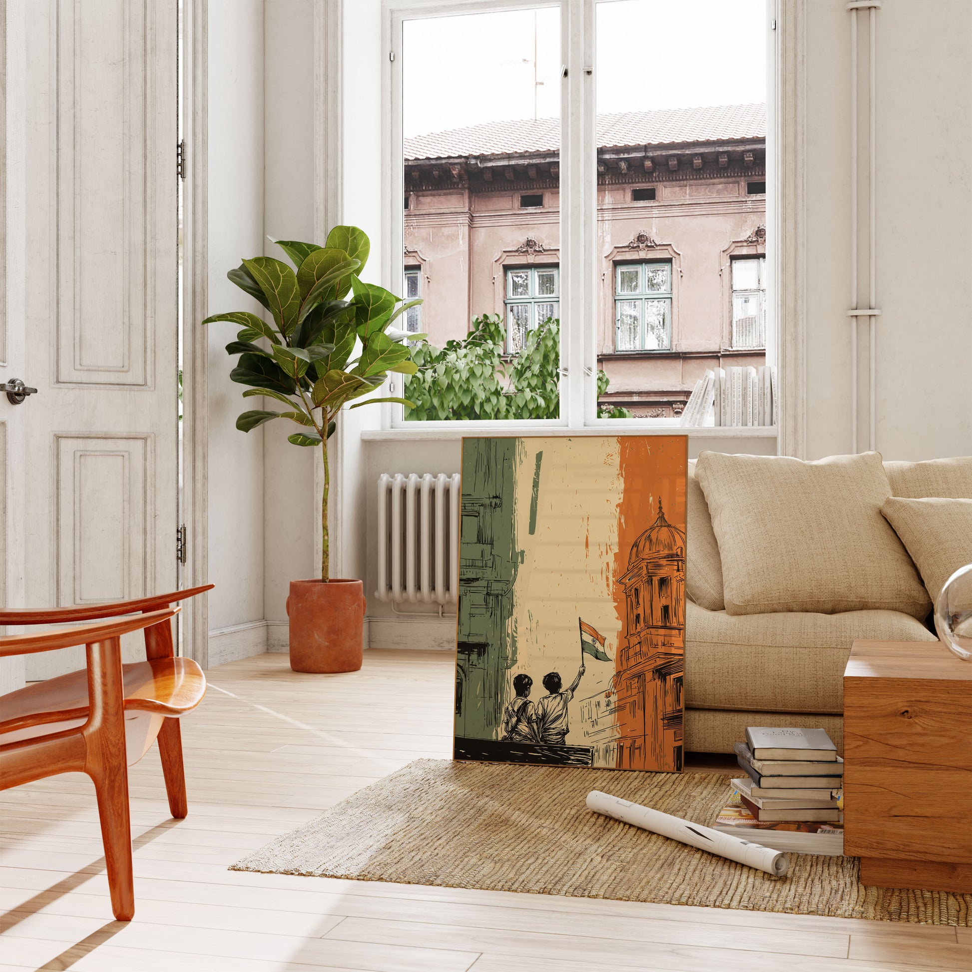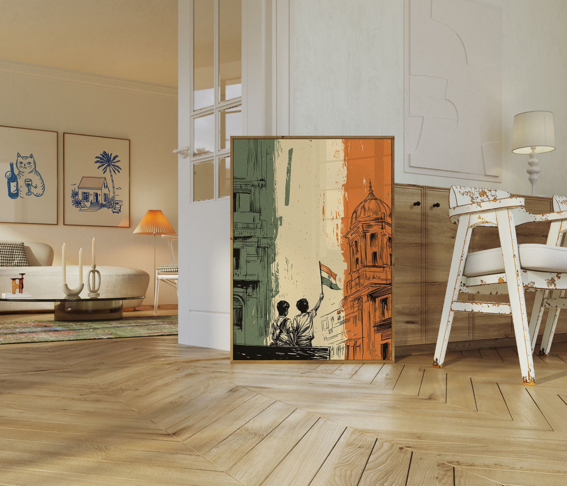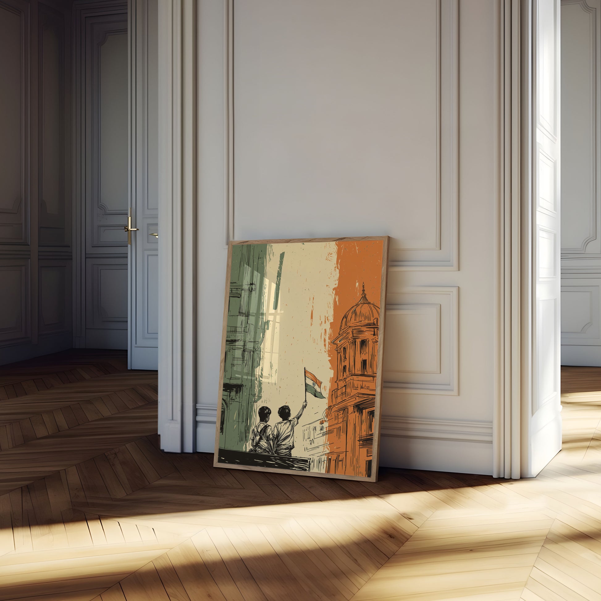 A powerful illustration capturing the essence of India's freedom journey, this striking poster depicts two figures raising the national flag against a backdrop of architectural silhouettes. The artwork blends green, white, and orange - the colors of the Indian flag - in a dynamic, sketched style that evokes the passion and resilience of a nation's struggle for independence. Rich with symbolism and emotional depth, this poster celebrates the spirit of unity and national pride.