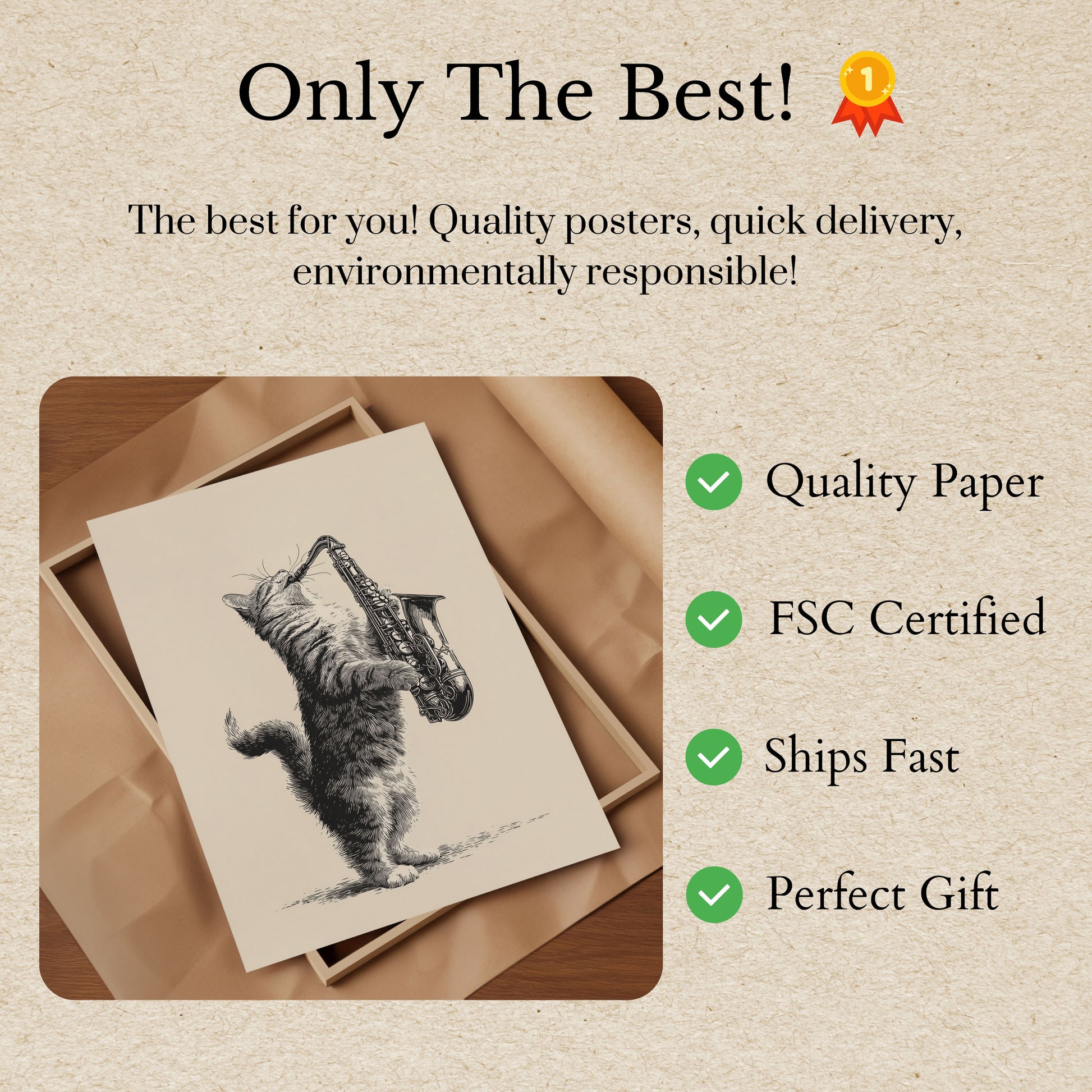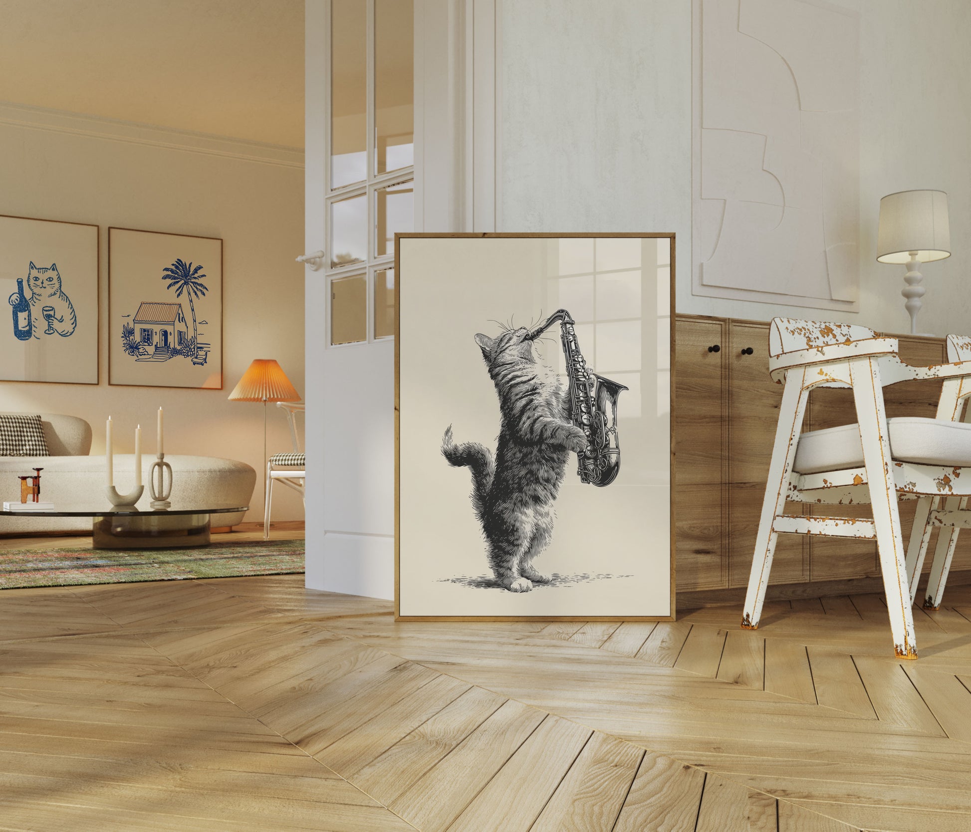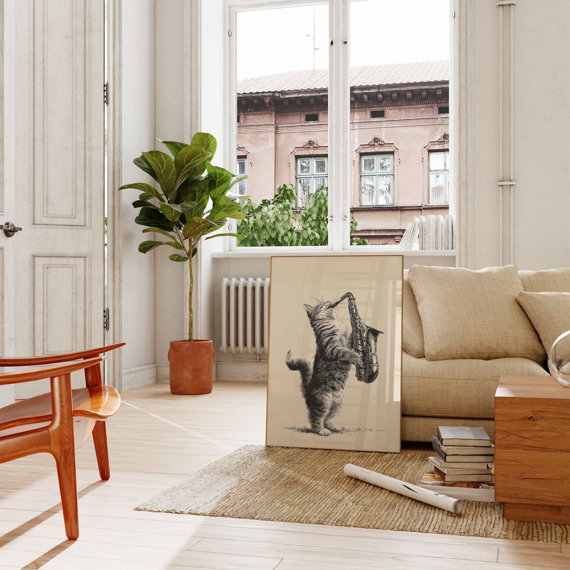 Get ready to be charmed by this extraordinary illustration of a cat standing upright, passionately embracing a saxophone with musical flair. The detailed black and white sketch captures the whimsical spirit of creativity, featuring intricate fur textures and the elegant curves of the musical instrument. This delightful artwork brings a playful and sophisticated energy that will instantly become a conversation piece in any music lover's space.