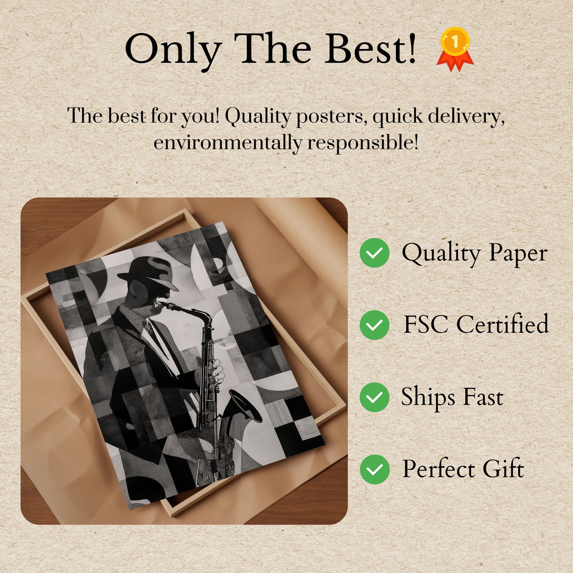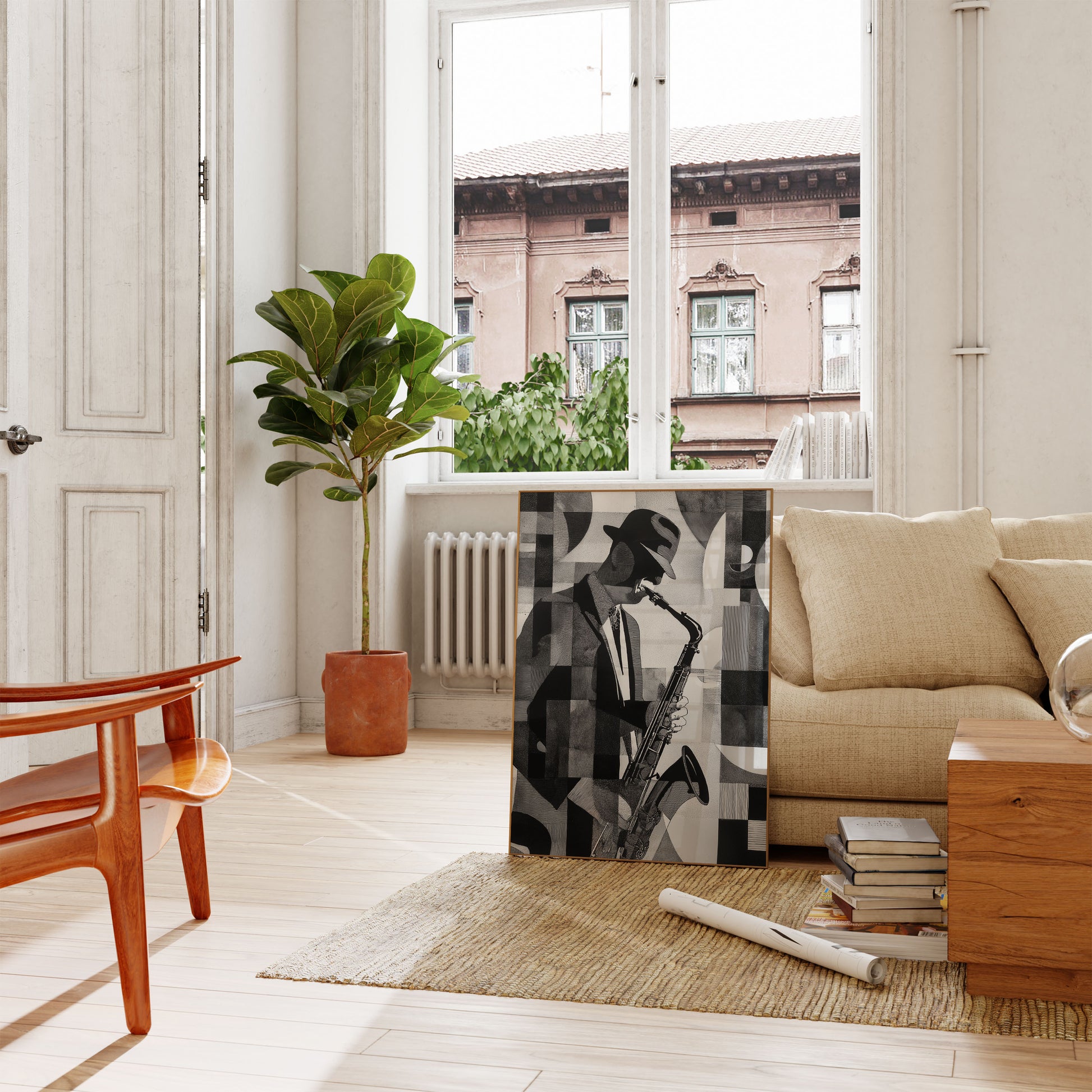 Immerse yourself in the rhythmic geometry of this stunning black and white jazz poster, where cubist art meets musical passion. The fragmented, angular design captures a saxophone player in a mesmerizing dance of light, shadow, and musical expression. Bold geometric shapes and intricate textures create a dynamic visual symphony that celebrates the spirit of jazz and modernist art.