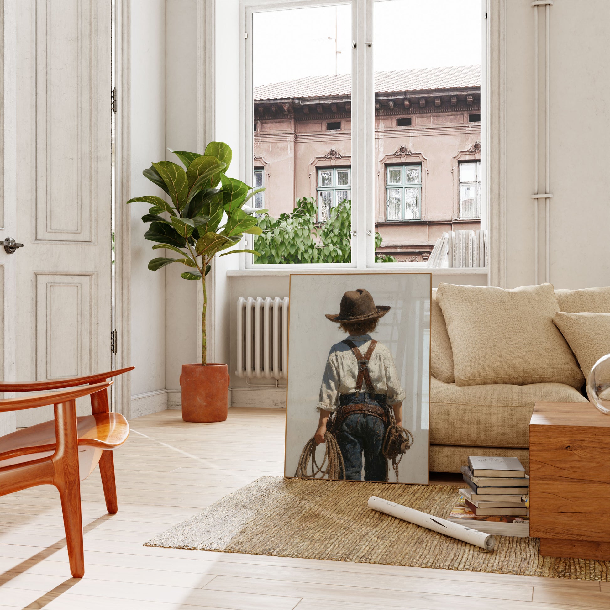Step into the world of rustic childhood adventure with this captivating back view of a young cowboy. Dressed in a crisp white shirt, dark denim, and a weathered brown hat, the subject stands with ropes in hand, embodying the spirit of the Wild West. The painterly style captures the texture of his clothing and the rugged landscape, creating a nostalgic and timeless image that celebrates childhood imagination and frontier spirit.