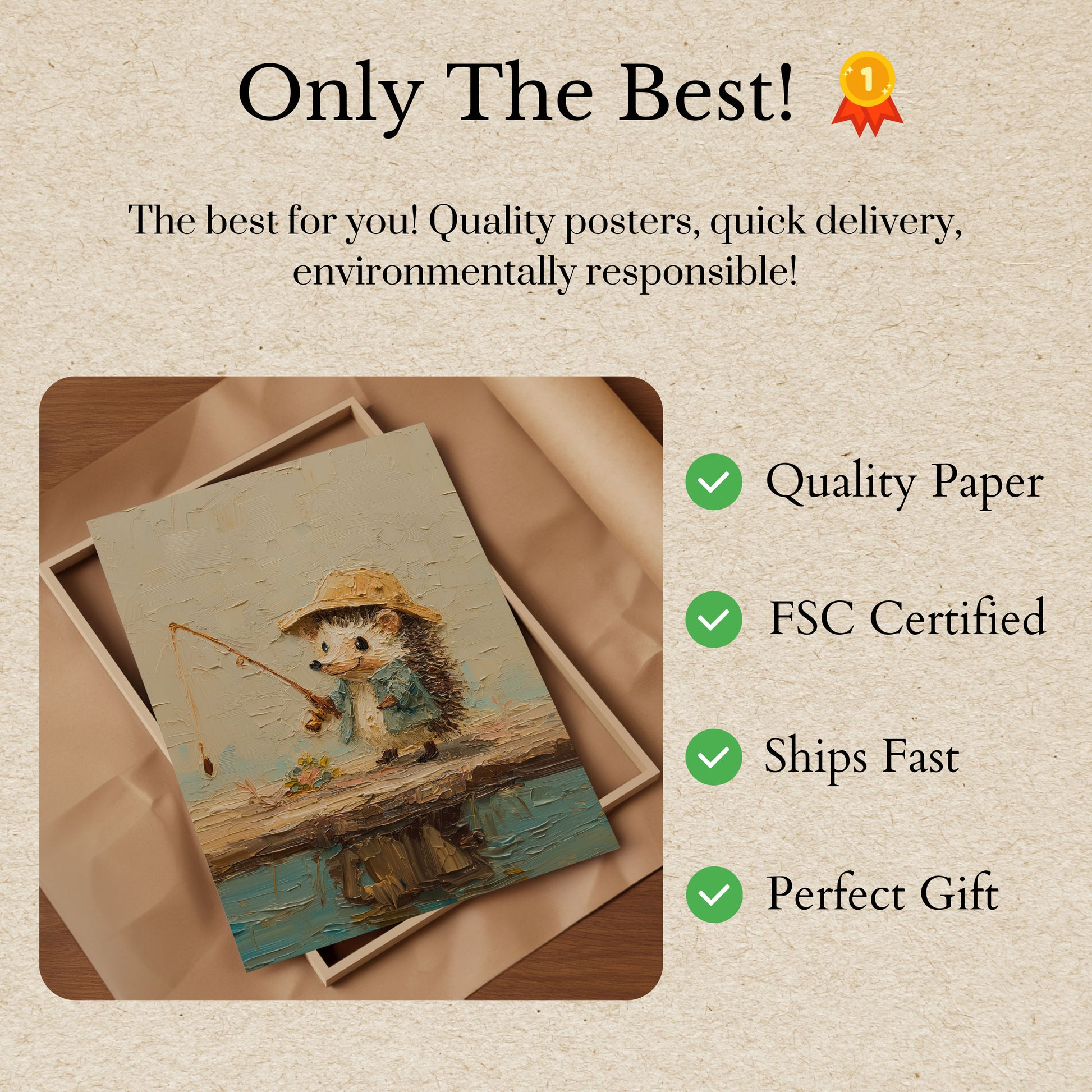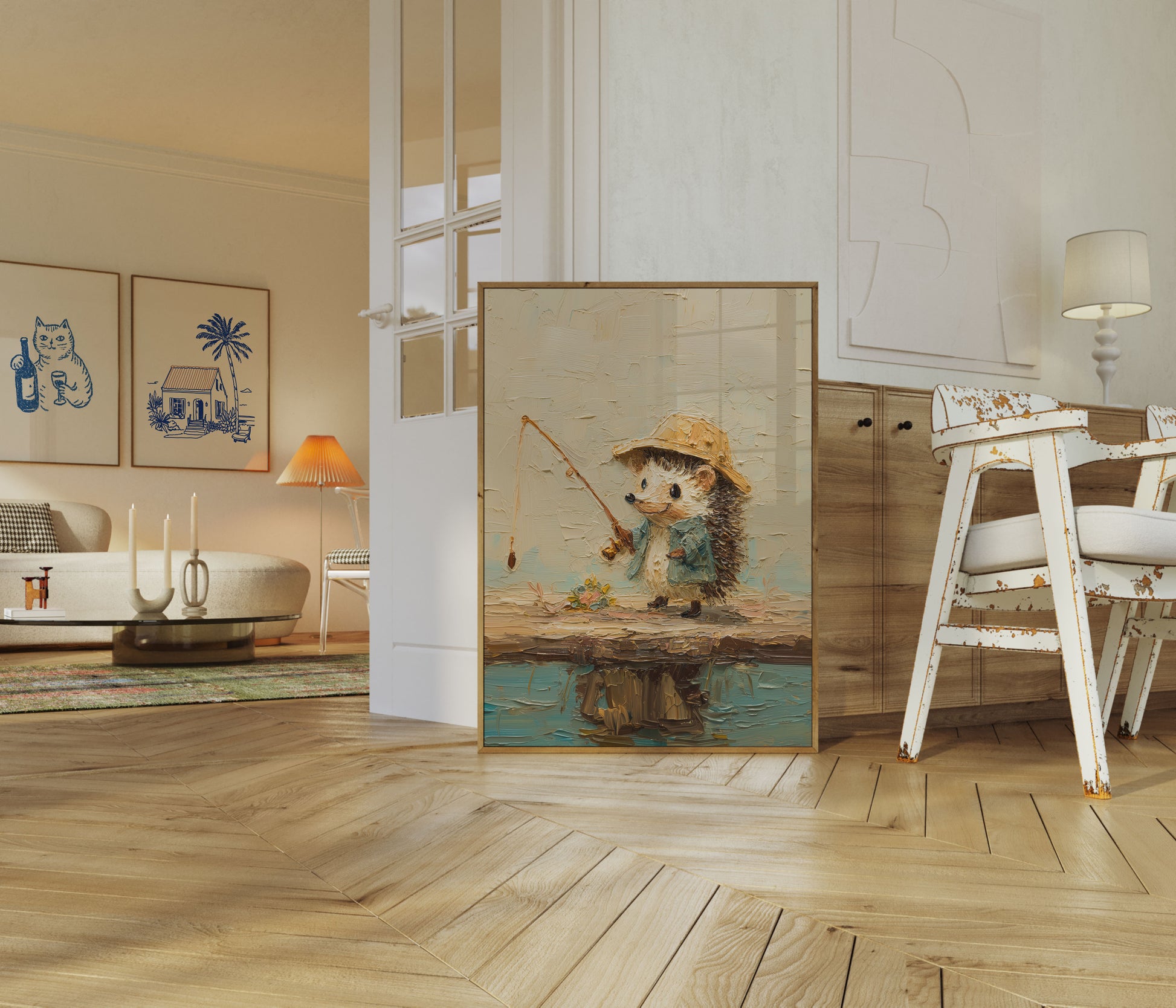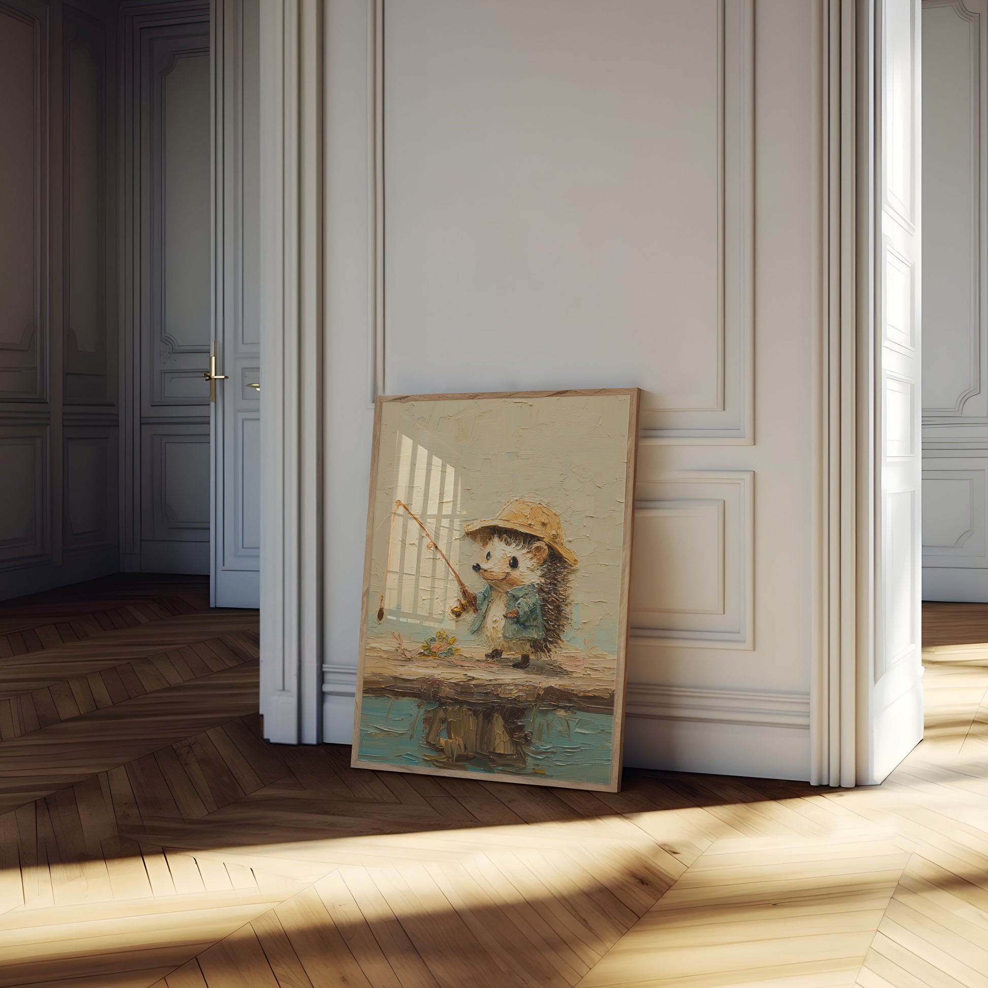 Step into a whimsical world of charm with this delightful oil painting featuring an adorable hedgehog fisherman. Dressed in a sunny yellow hat and cozy blue-green jacket, our tiny adventurer sits patiently on a log, fishing rod in hand, against a soft, textured background that evokes a dreamy summer afternoon. The painting's impressionist style brings warmth and personality to this enchanting scene, capturing the innocent wonder of a small creature's peaceful moment by the water.