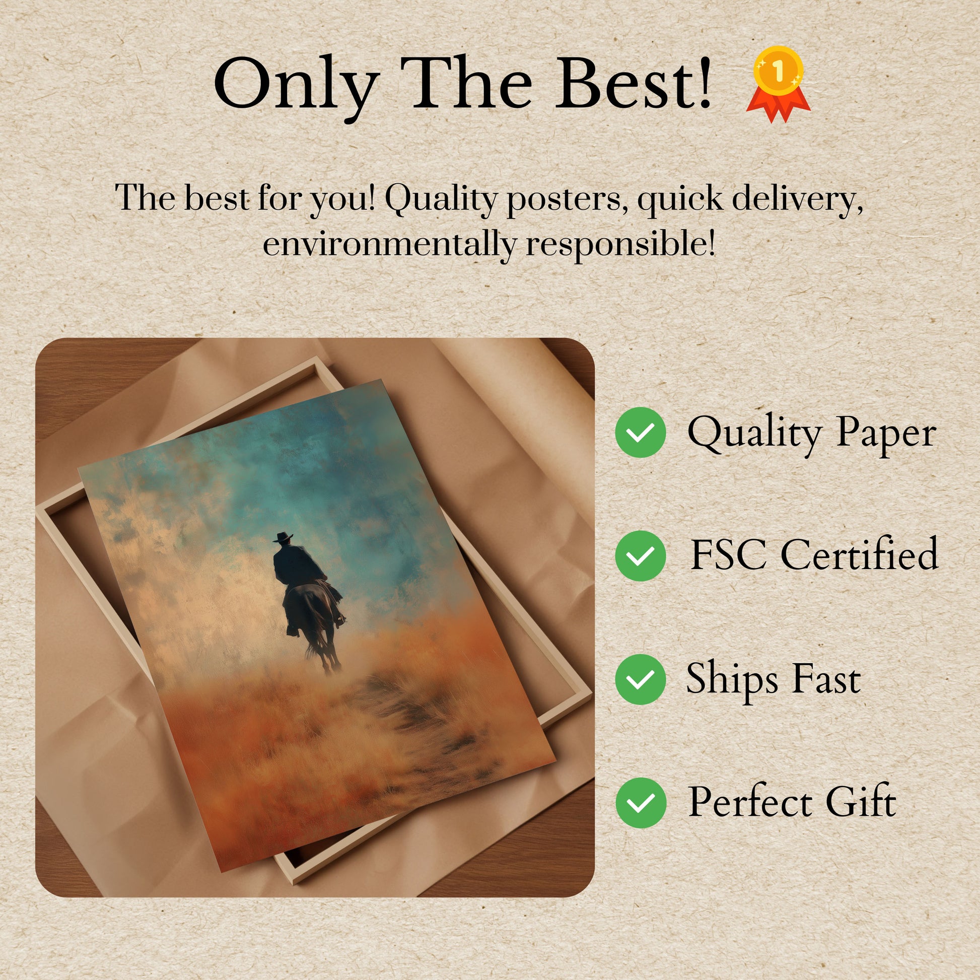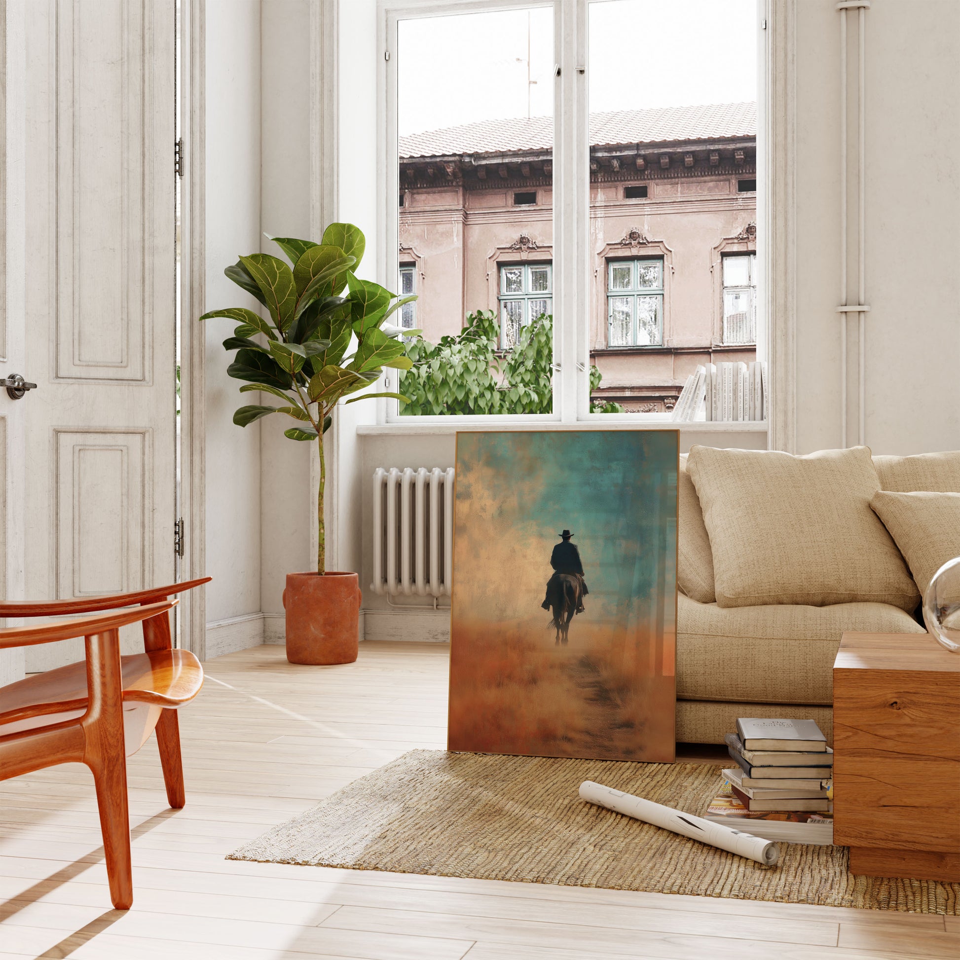 Immerse yourself in the haunting beauty of the Wild West with this evocative landscape painting. A solitary rider on horseback traverses a dusty, golden-orange terrain, silhouetted against a dreamlike turquoise and amber sky. The soft, painterly texture creates a sense of memory and nostalgia, capturing the timeless spirit of frontier exploration and solitude.