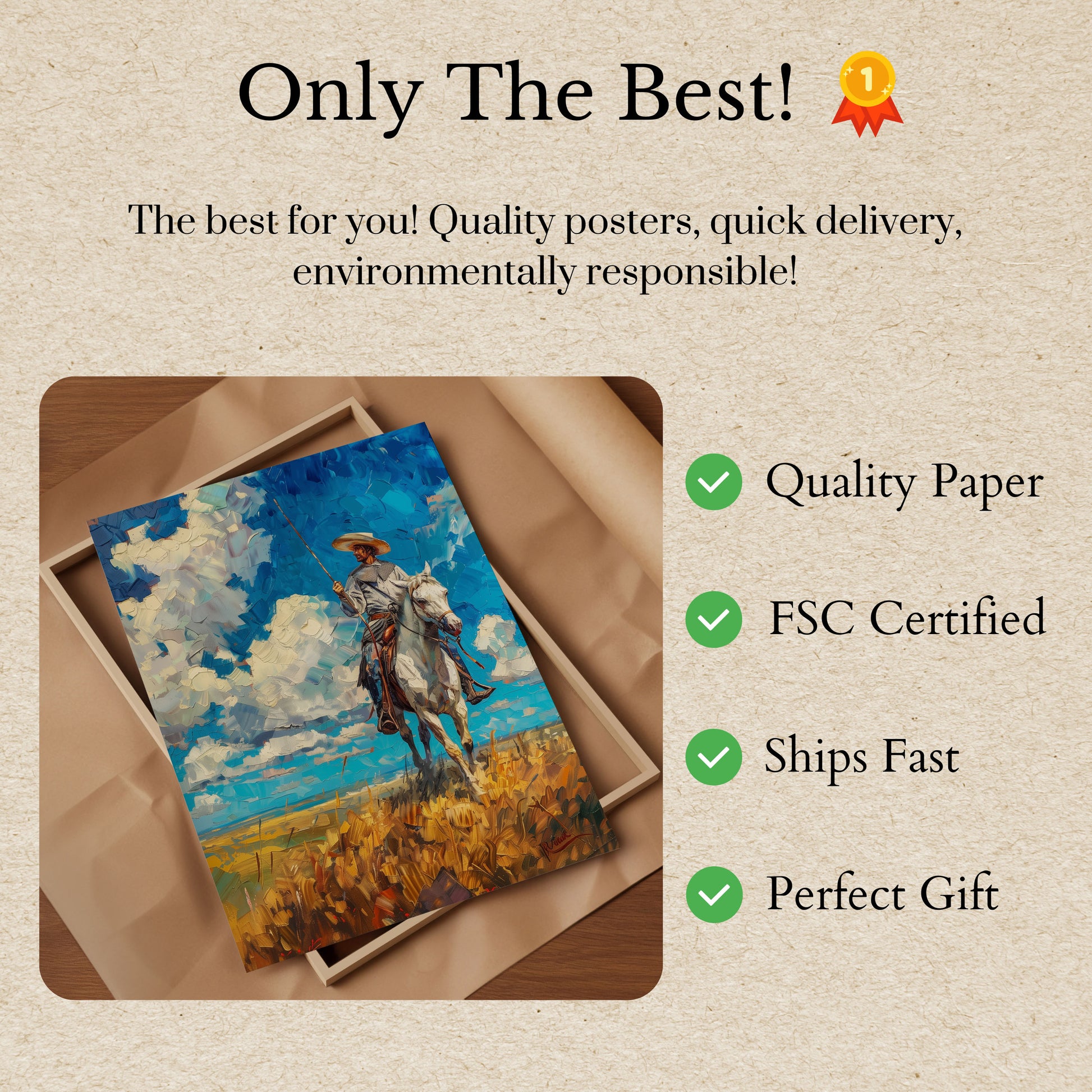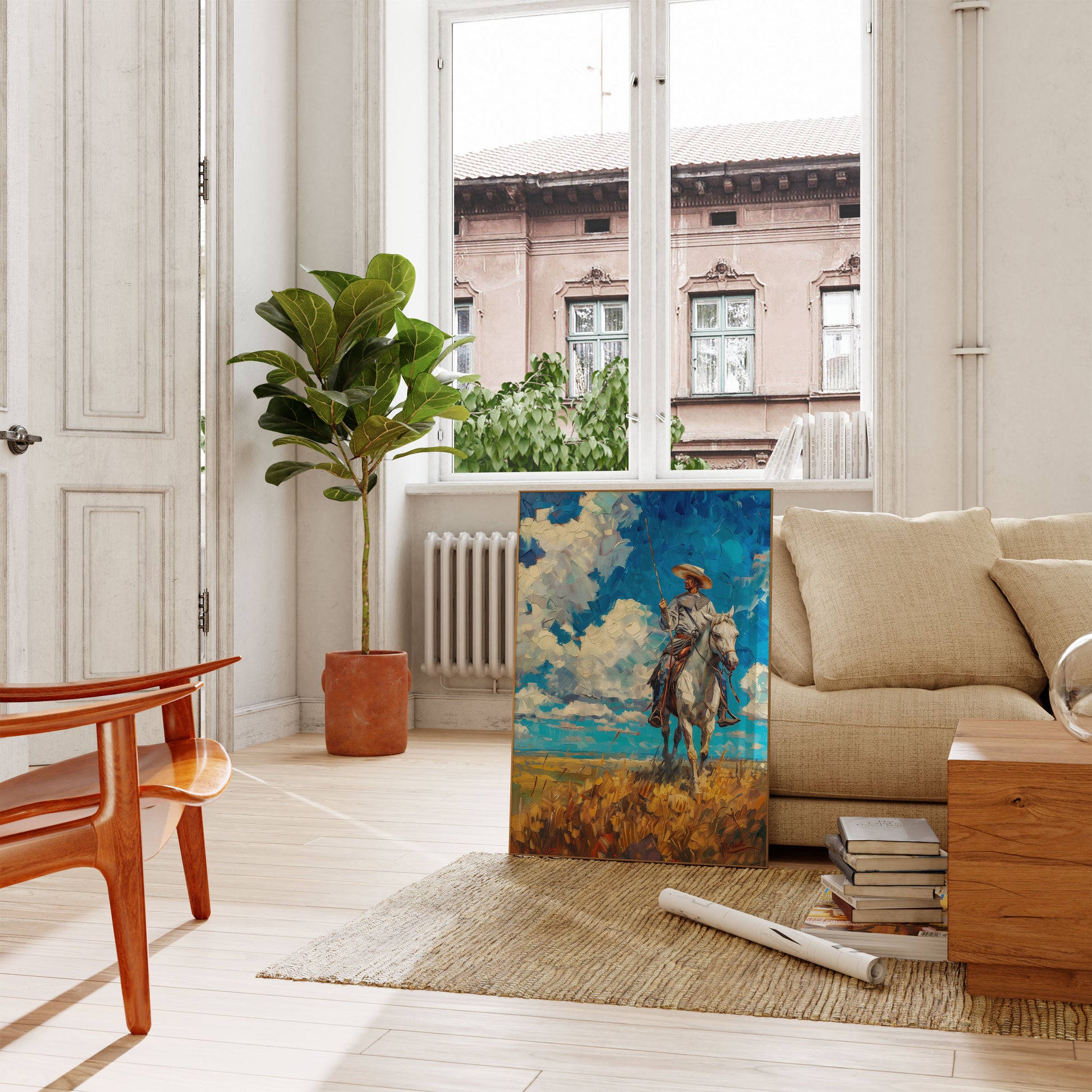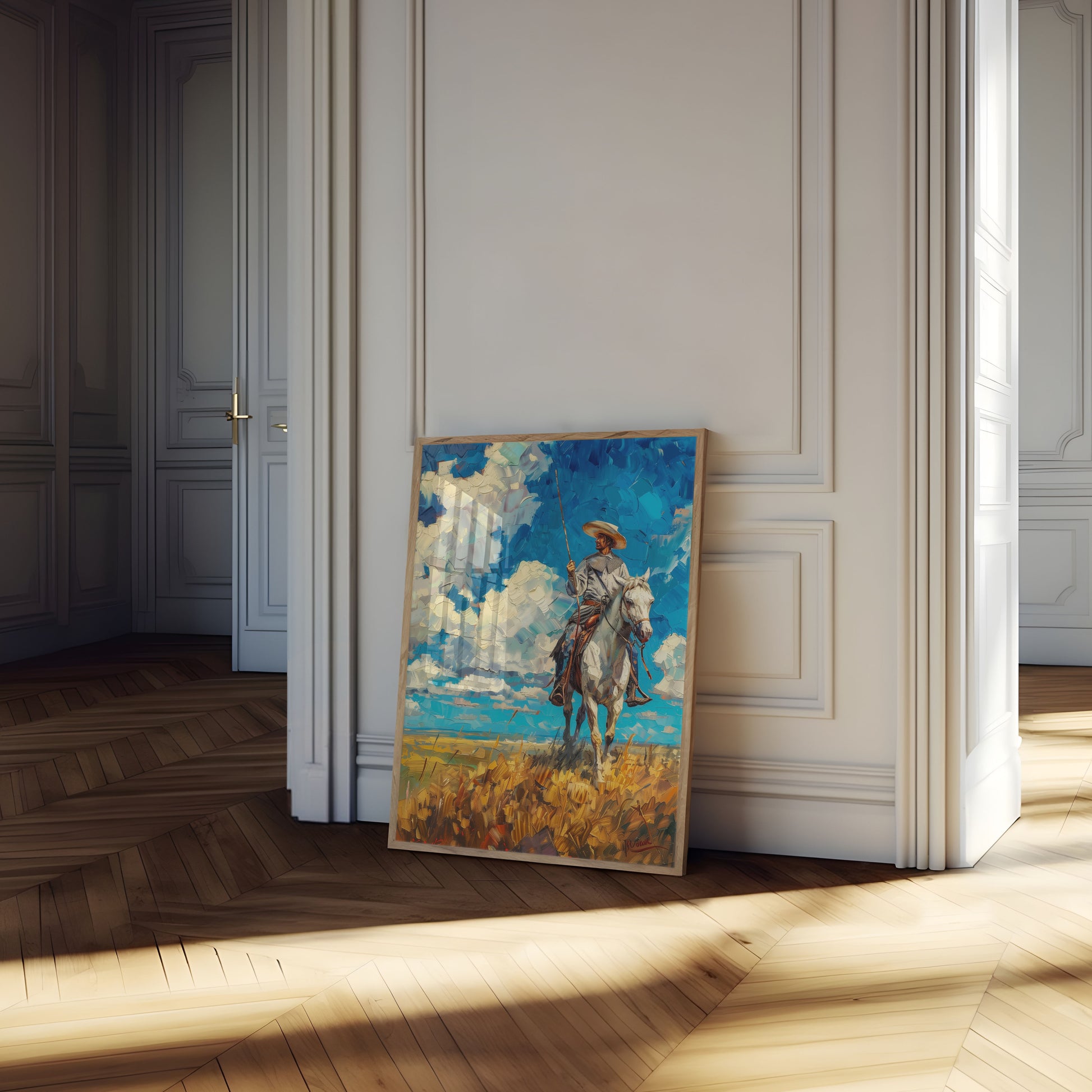 Immerse yourself in the breathtaking beauty of the American West with this stunning artistic rendition of a cowboy on horseback. The vibrant blue sky and golden wheat fields create a dramatic backdrop for the solitary rider, capturing the essence of freedom and adventure. Rich, textured brushstrokes bring this scene to life, transforming a classic western landscape into a mesmerizing work of art that speaks to the spirit of exploration.
