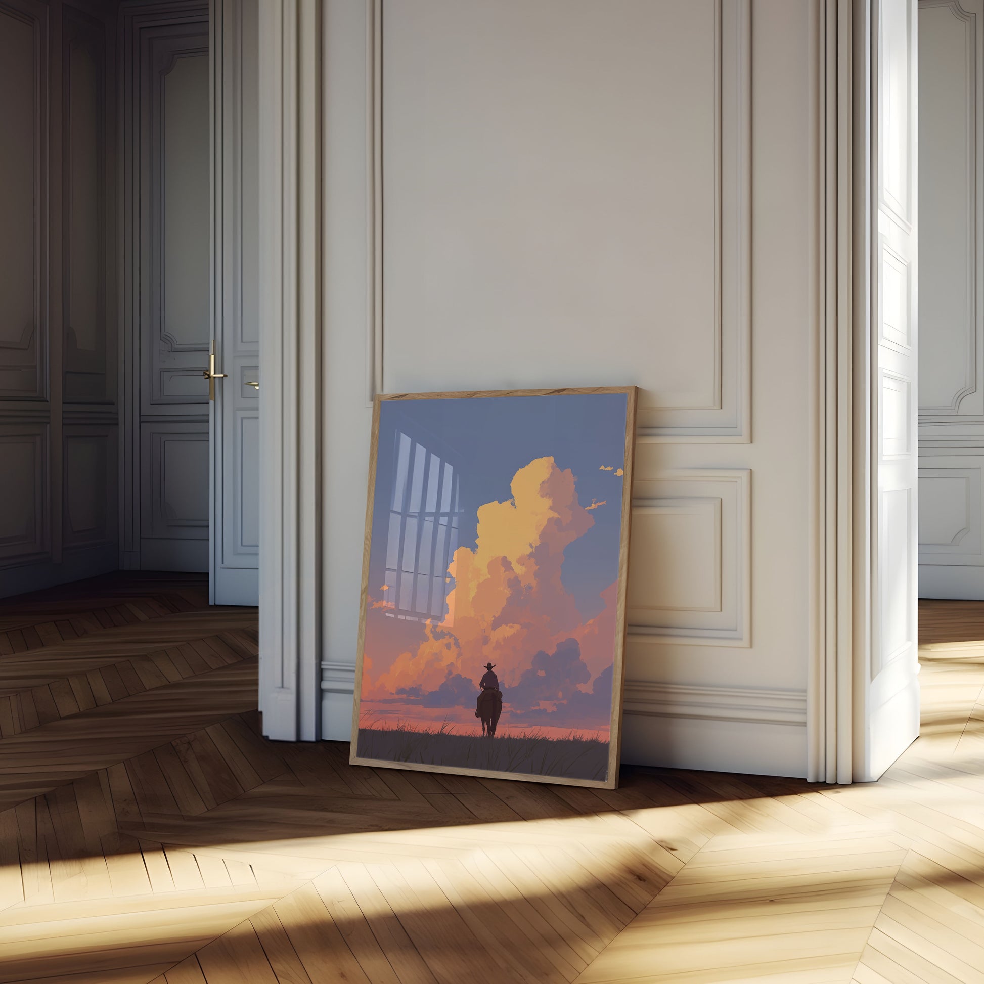 Experience the breathtaking solitude of the open plains with this stunning sunset landscape featuring a lone cowboy silhouetted against a dramatic sky of golden and amber clouds. The artwork captures a moment of profound tranquility, with towering cumulus clouds billowing like celestial mountains and a rider pausing on the horizon, embodying the spirit of adventure and quiet contemplation. Soft grass sways in the foreground, completing this mesmerizing scene of Western stillness and natural beauty.