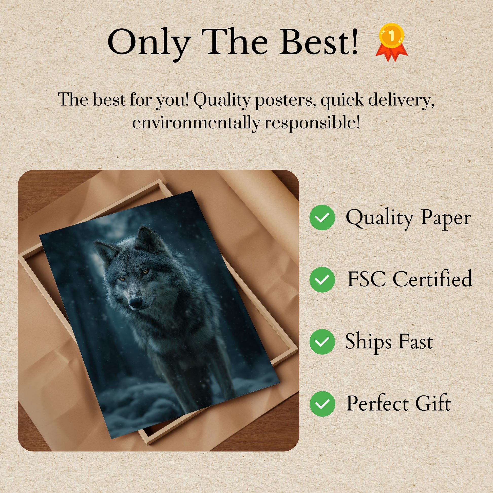 Immerse yourself in the haunting beauty of this majestic wolf standing resolute in a snowy, misty forest. With piercing golden eyes and a silvery-blue coat, the wolf embodies wild strength and silent power against a dark, ethereal winter backdrop. The delicate snowflakes and blurred forest create a mesmerizing atmosphere of mystery and untamed wilderness.