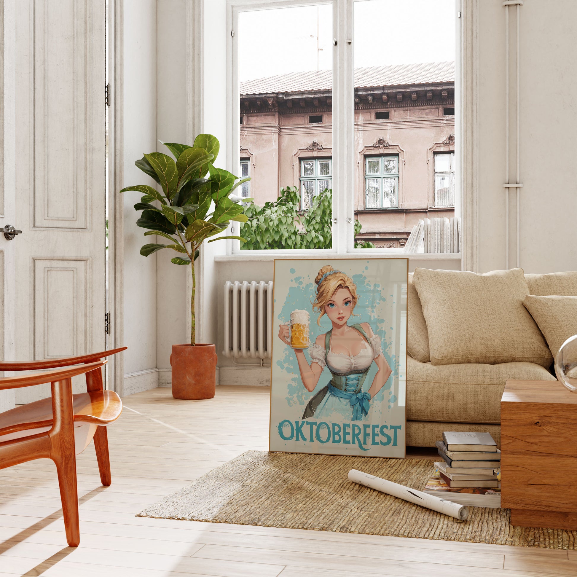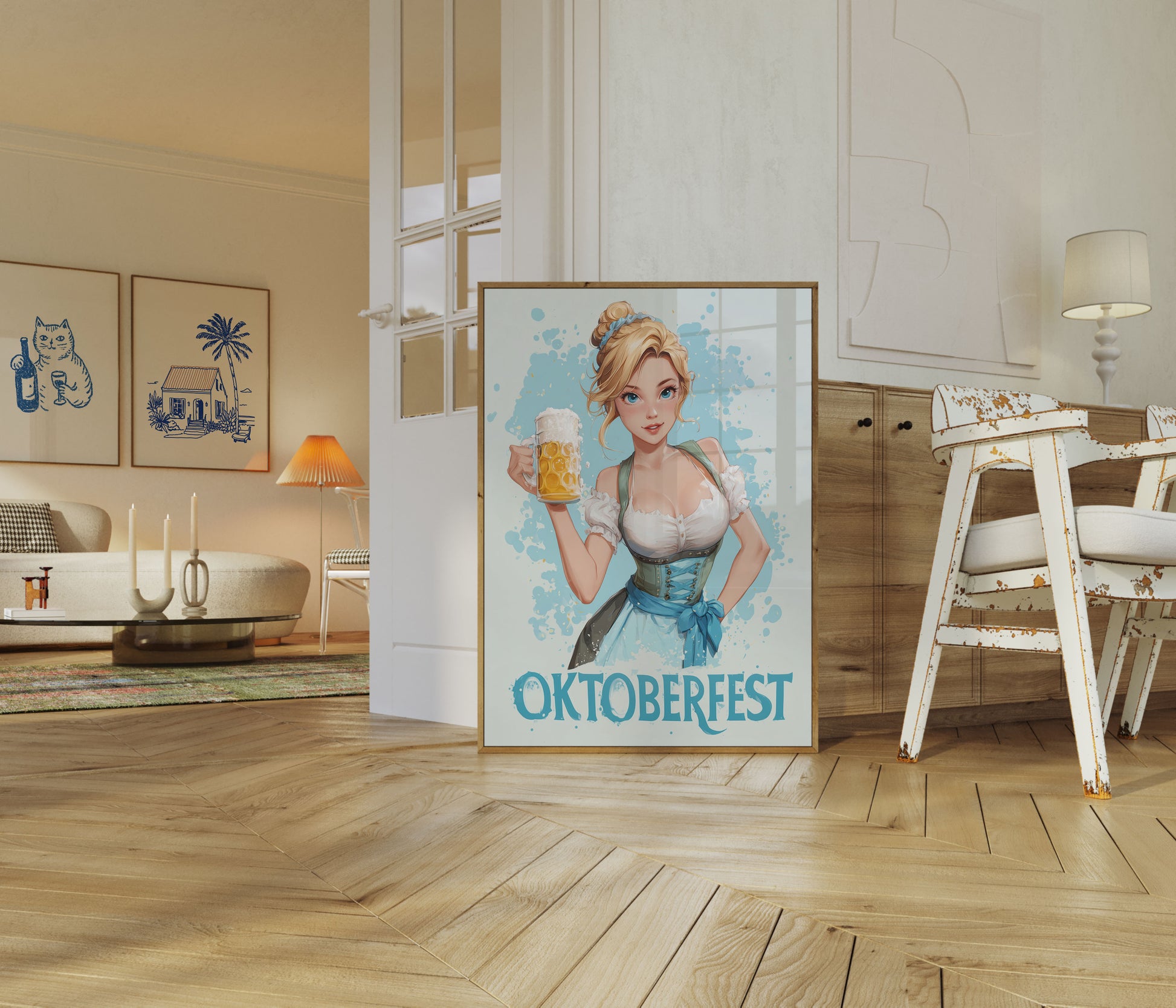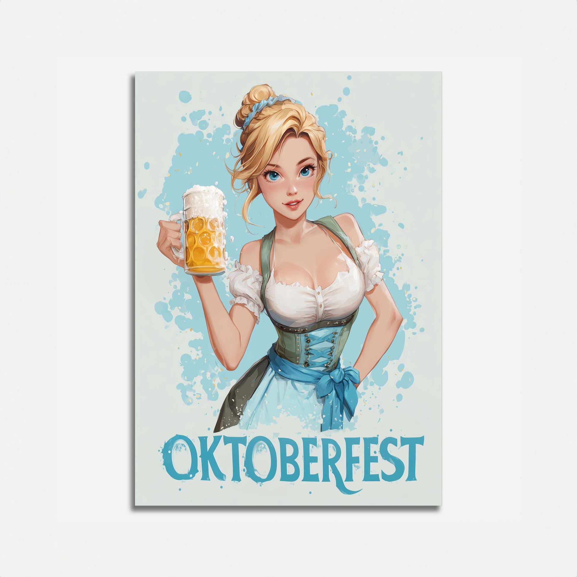 Dive into the festive spirit of Oktoberfest with this stunning illustrated poster featuring a charming blonde woman in traditional Bavarian dirndl. Her bright blue eyes and radiant smile perfectly capture the joy of the legendary beer festival, while the frothy golden beer mug and soft blue background create an inviting, celebratory atmosphere that brings the magic of Munich's most famous tradition right into your living space.