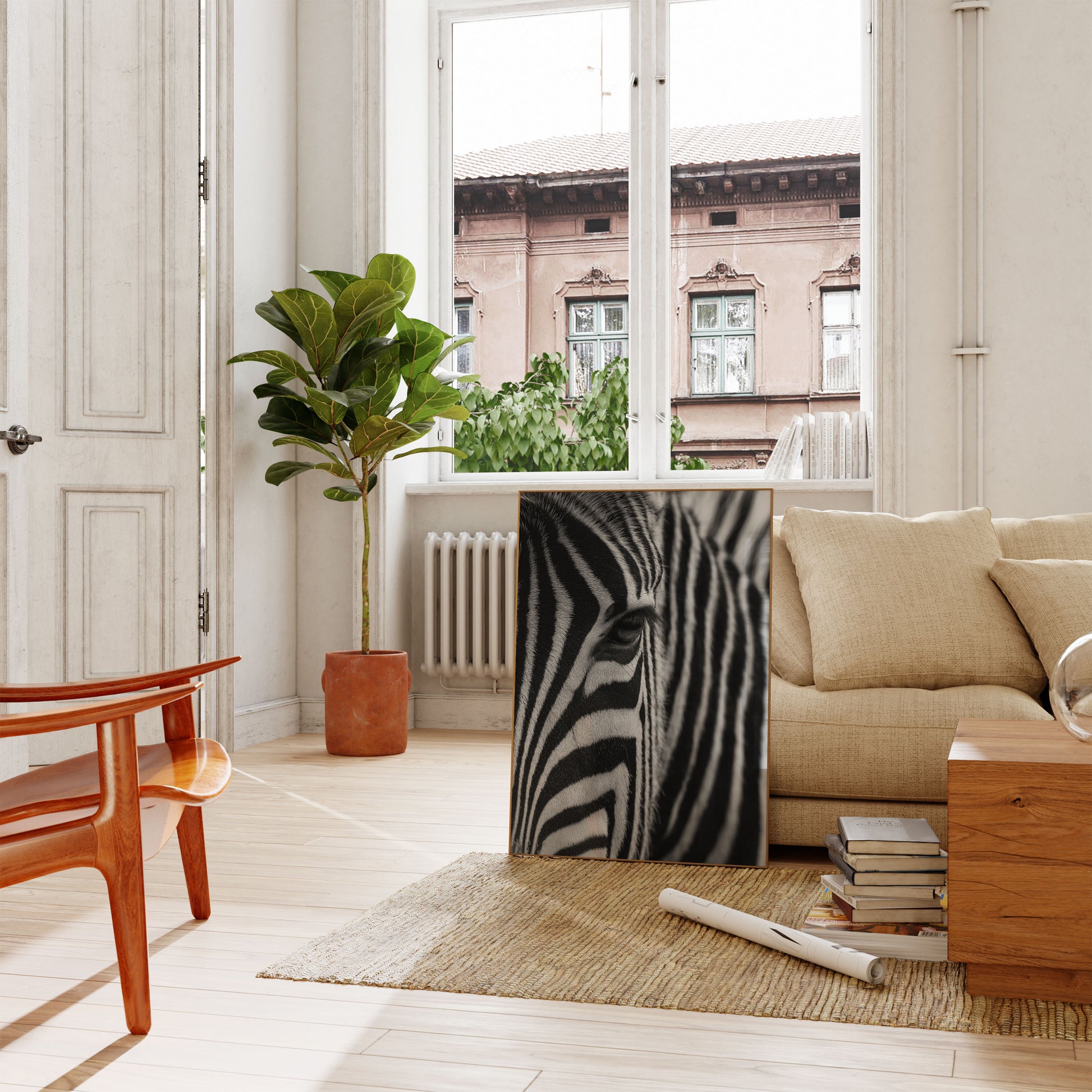 Experience the mesmerizing depth and intricate detail of this stunning zebra close-up. The monochromatic image captures the raw beauty of the zebra's distinctive stripe pattern, with each hair and contour meticulously rendered in stark black and white. The penetrating eye of the zebra draws you into a world of wild elegance and natural complexity, creating a powerful visual narrative of wildlife's extraordinary design.