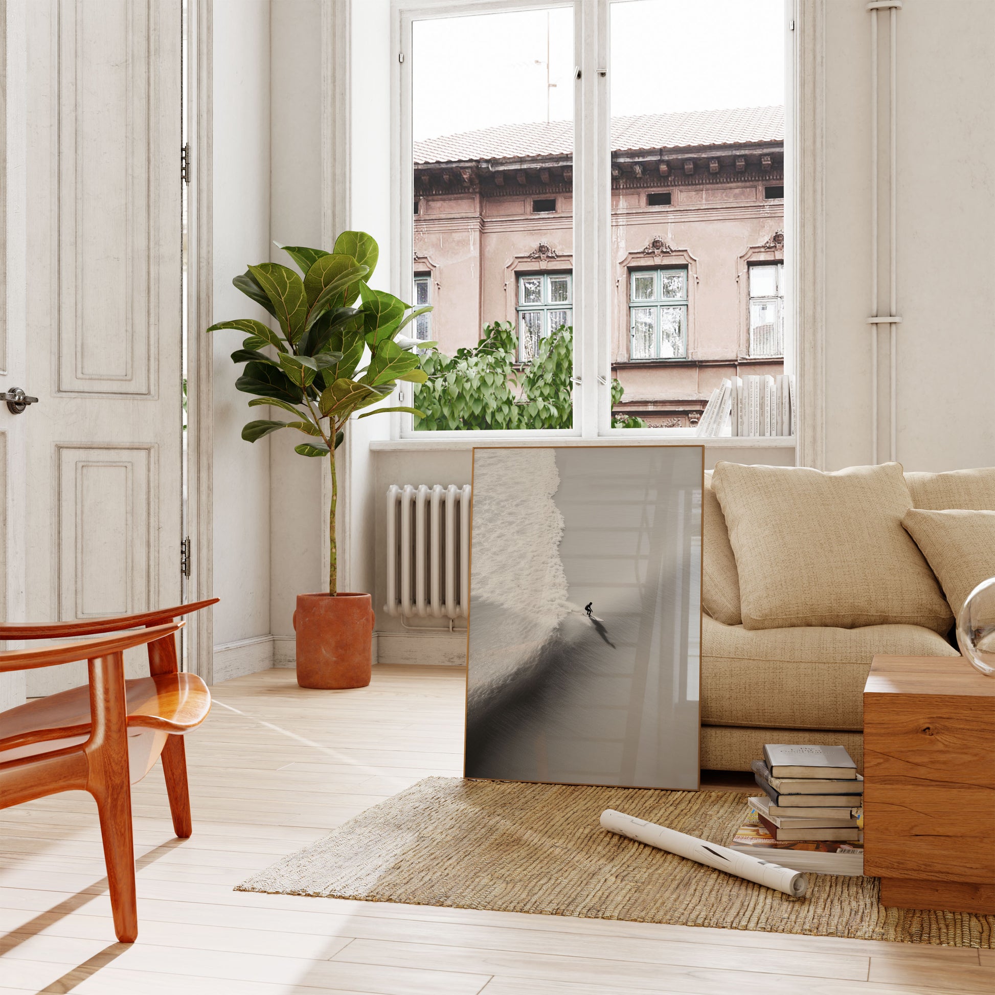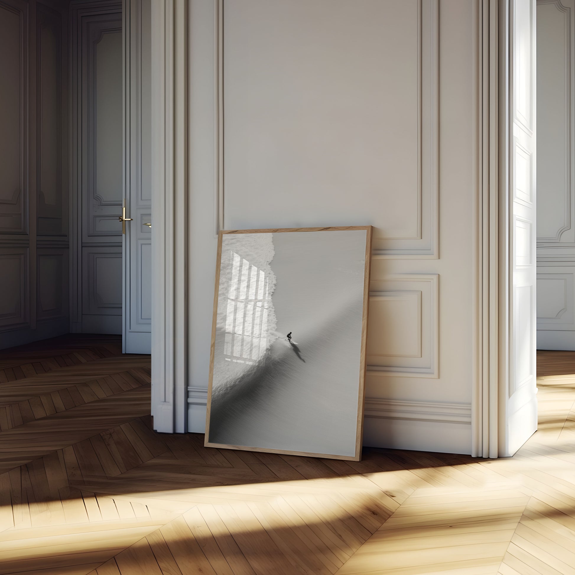 A breathtaking black and white photograph captures the raw essence of surfing - a lone surfer riding the crest of a massive, sculptural wave. The image transforms the ocean into a dramatic canvas of light and shadow, with the silhouetted surfer perfectly balanced on the wave's steep face. This poster embodies the pure poetry of motion, showcasing the delicate dance between human and nature in a minimalist, striking composition.