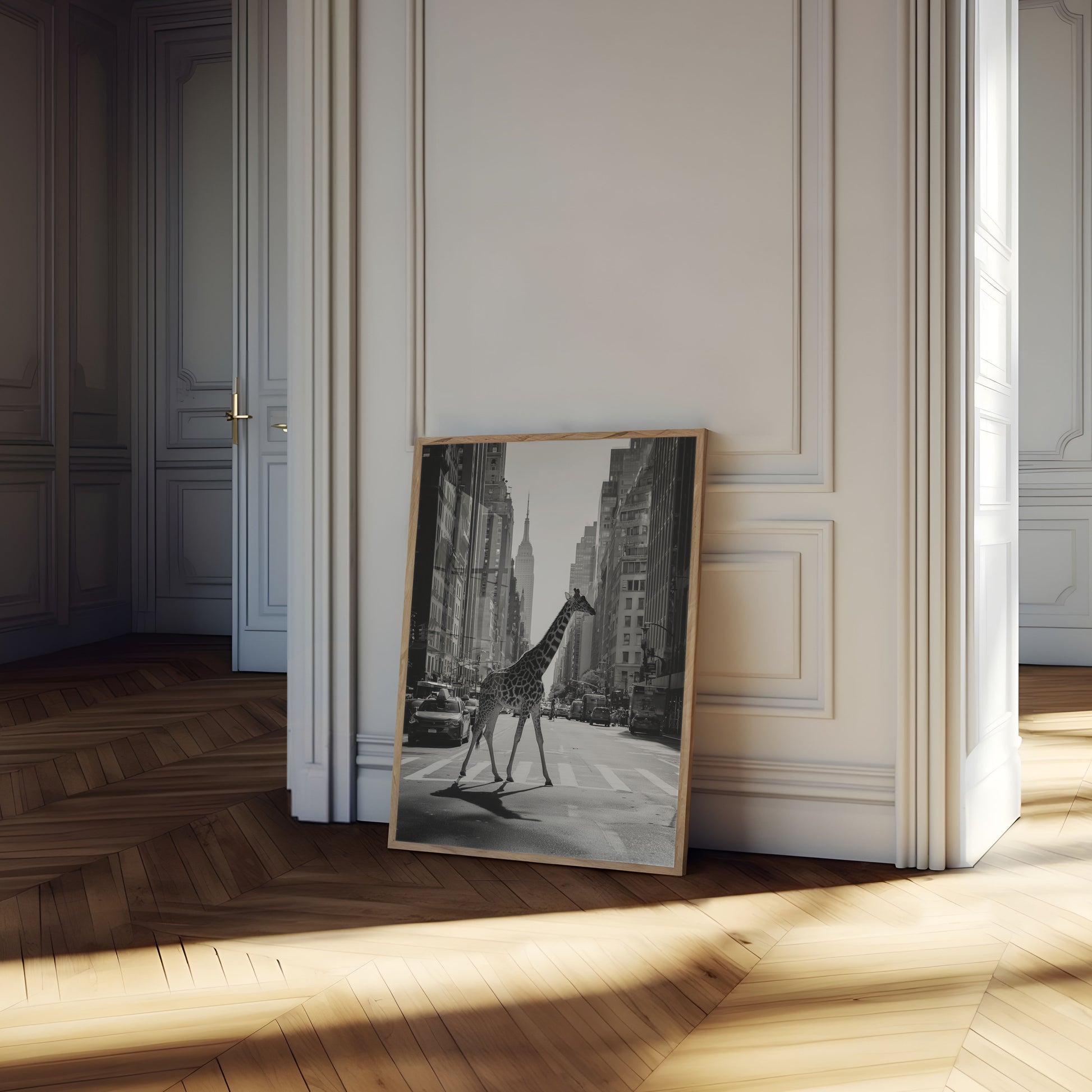 Imagine a towering giraffe casually strolling across a New York City crosswalk, with the iconic Empire State Building rising majestically in the background. This surreal black and white image captures the unexpected beauty of nature intersecting with urban landscape, creating a stunning visual narrative that challenges perceptions and sparks imagination. The stark contrast and precise composition transform an impossible moment into a breathtaking piece of photographic art.