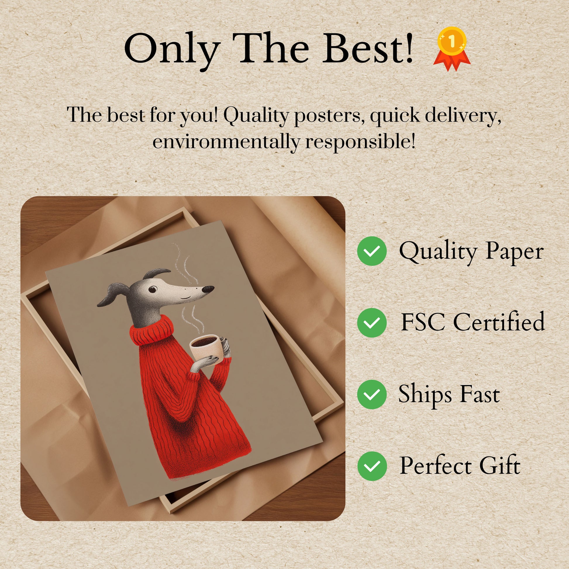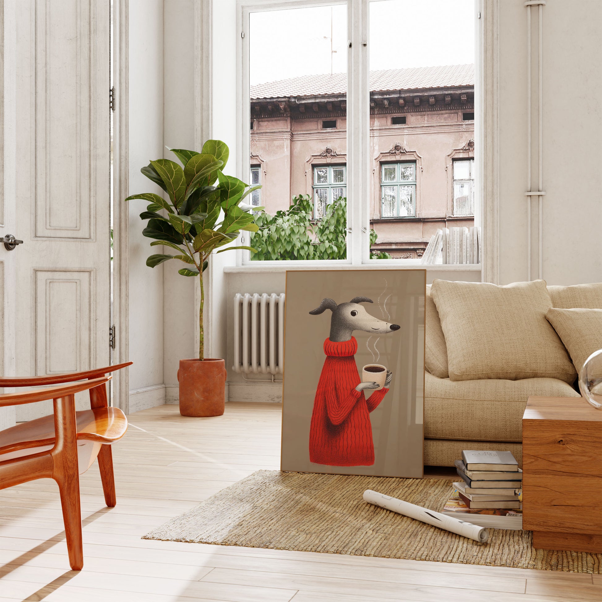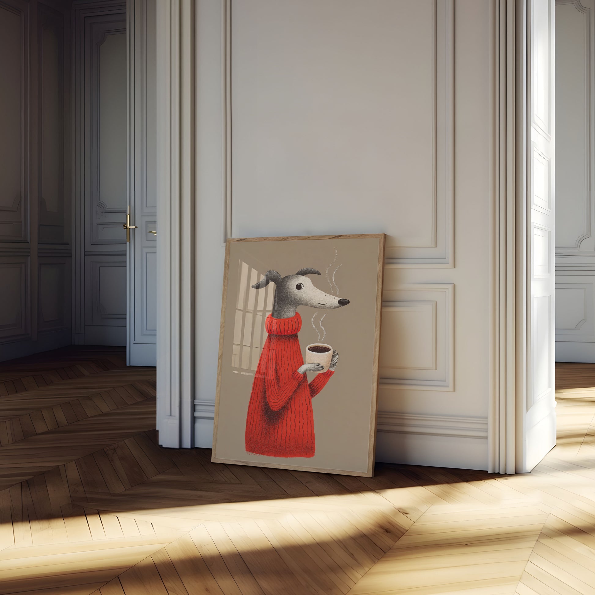 Una encantadora ilustración de un elegante perro con aspecto de galgo, con un vibrante suéter rojo de punto y una taza de café humeante en la mano. La suave y texturizada obra captura un momento de calidez y confort, con la expresión tierna del perro y el vapor que se eleva creando una escena encantadora y acogedora.