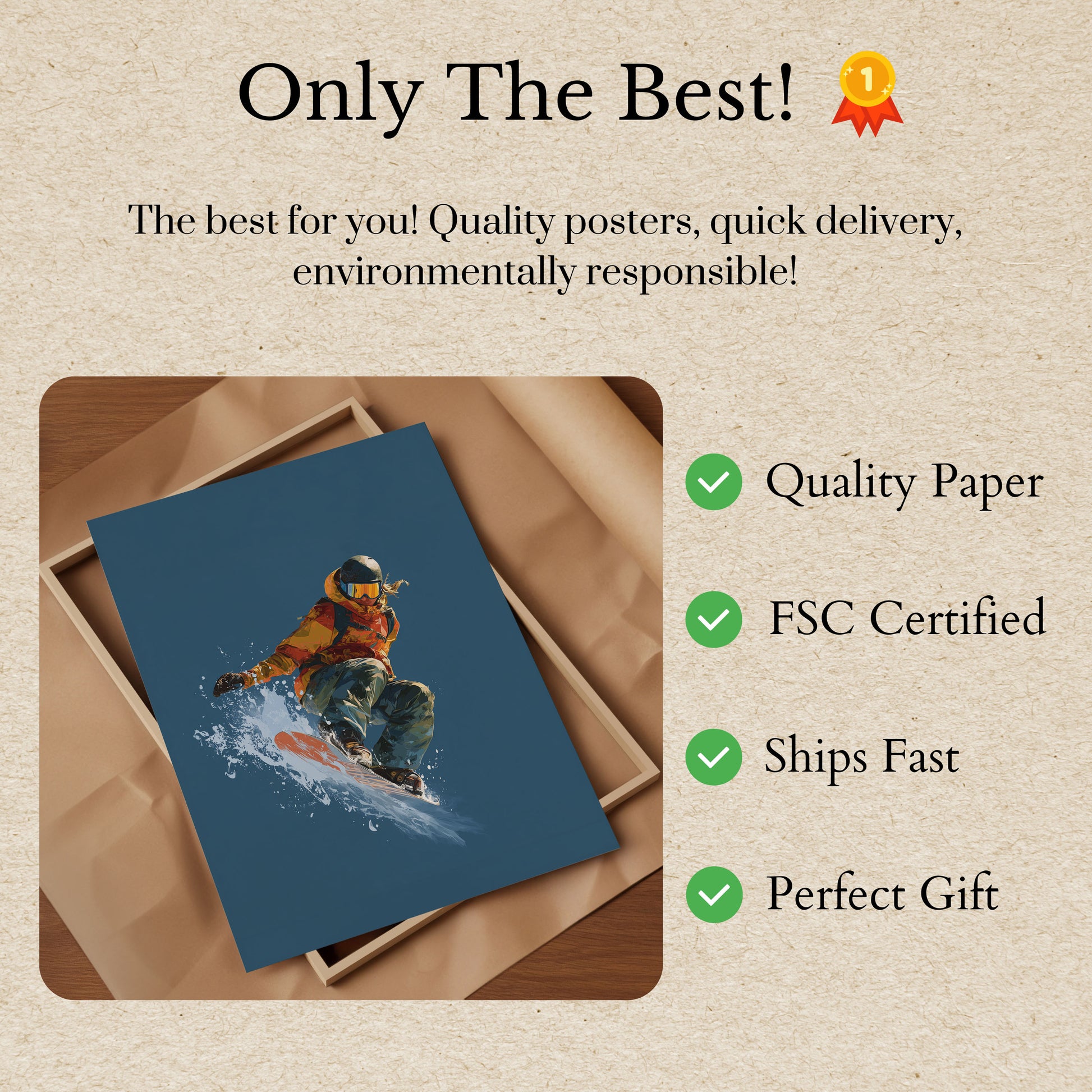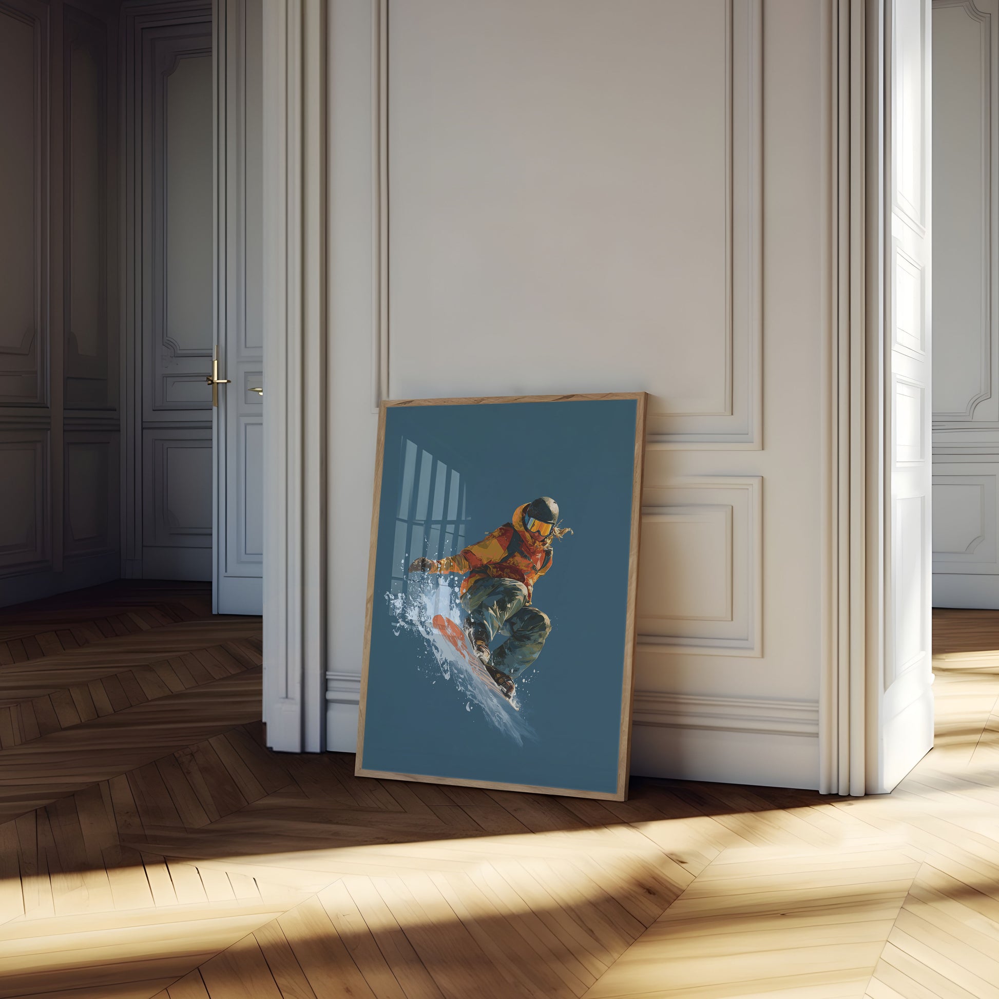 Capture the electrifying spirit of winter sports with this stunning snowboarding artwork. A lone rider explodes through a spray of snow, dressed in vibrant orange and red, suspended against a deep blue background that evokes the crisp mountain atmosphere. The dynamic pose and explosive motion capture the pure adrenaline and freedom of snowboarding at its most intense.