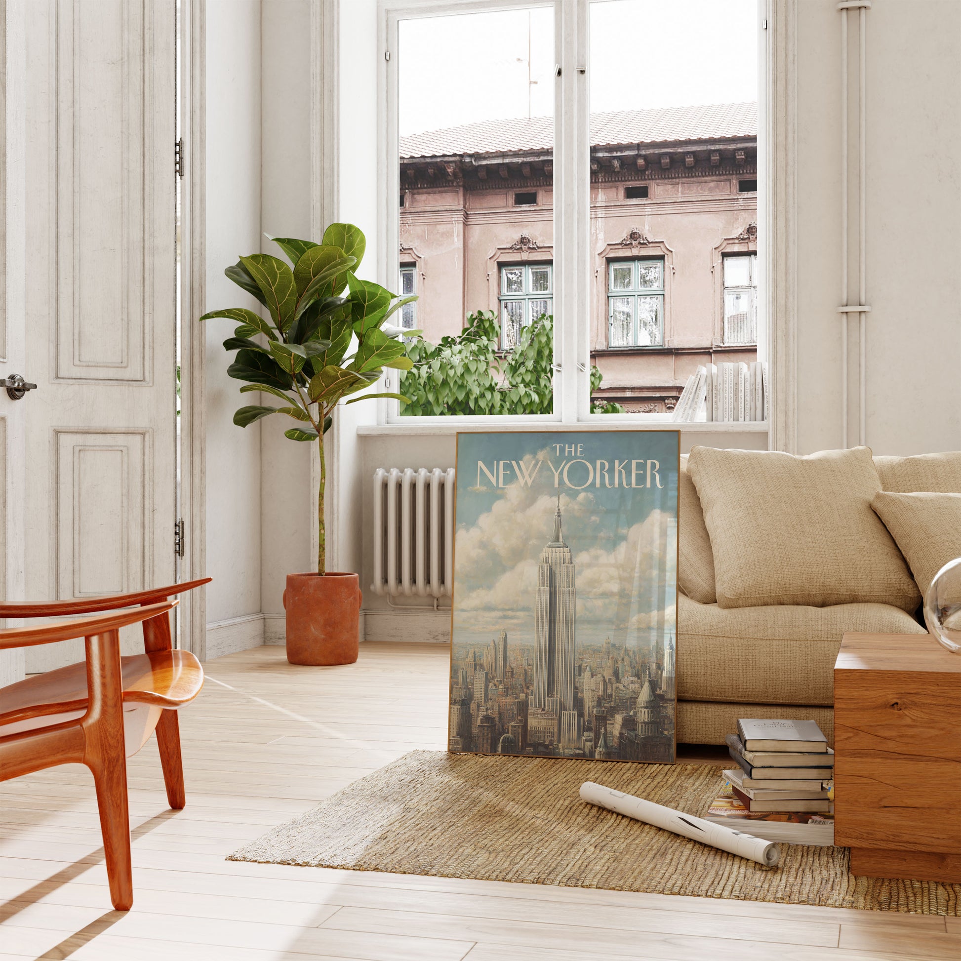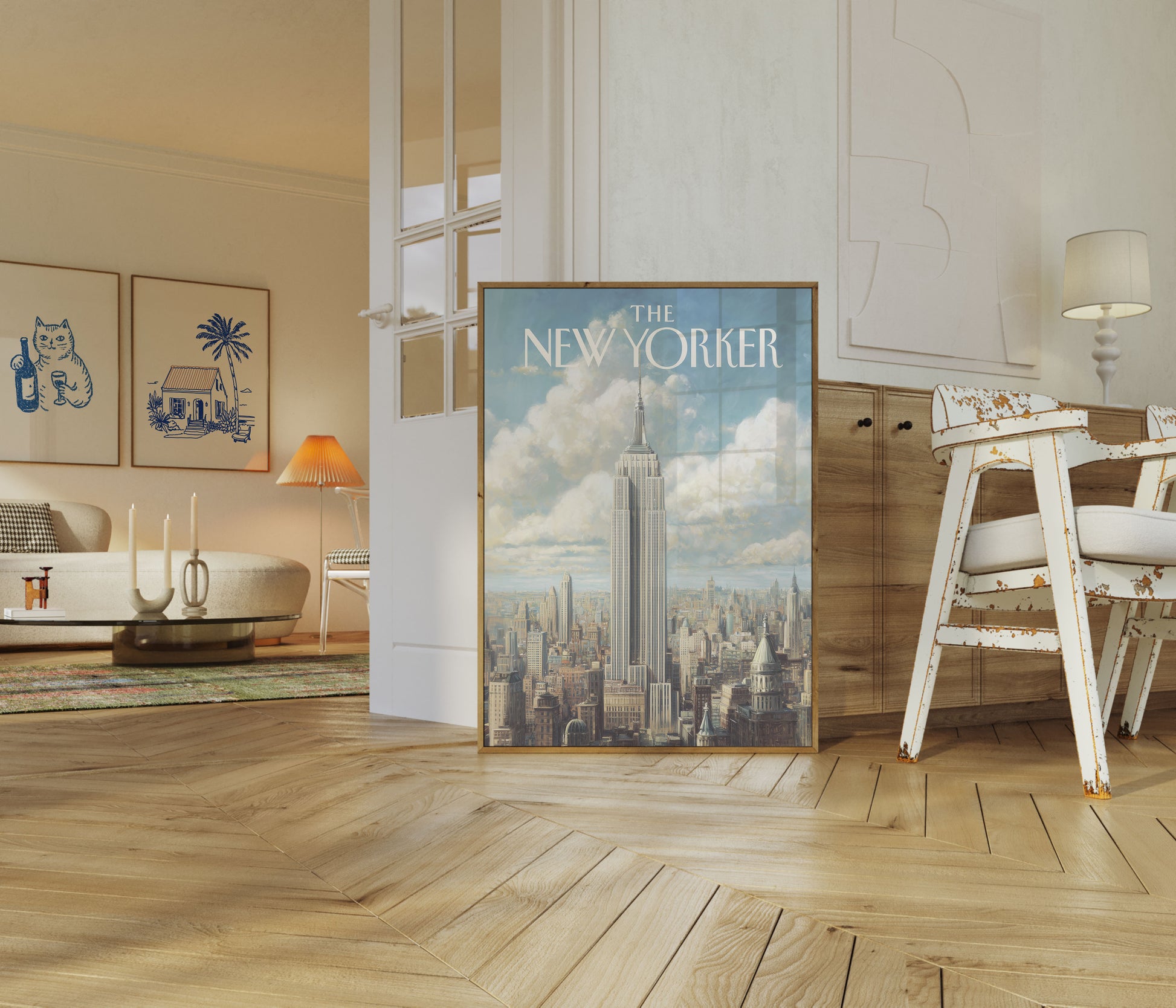 A breathtaking illustration of New York City's iconic skyline, with the Empire State Building standing tall and majestic at the center. Soft, dreamy clouds drift behind a panorama of architectural marvels, capturing the timeless beauty and urban grandeur of Manhattan. This stunning artwork celebrates the architectural wonder that has become a symbol of human ambition and creativity.