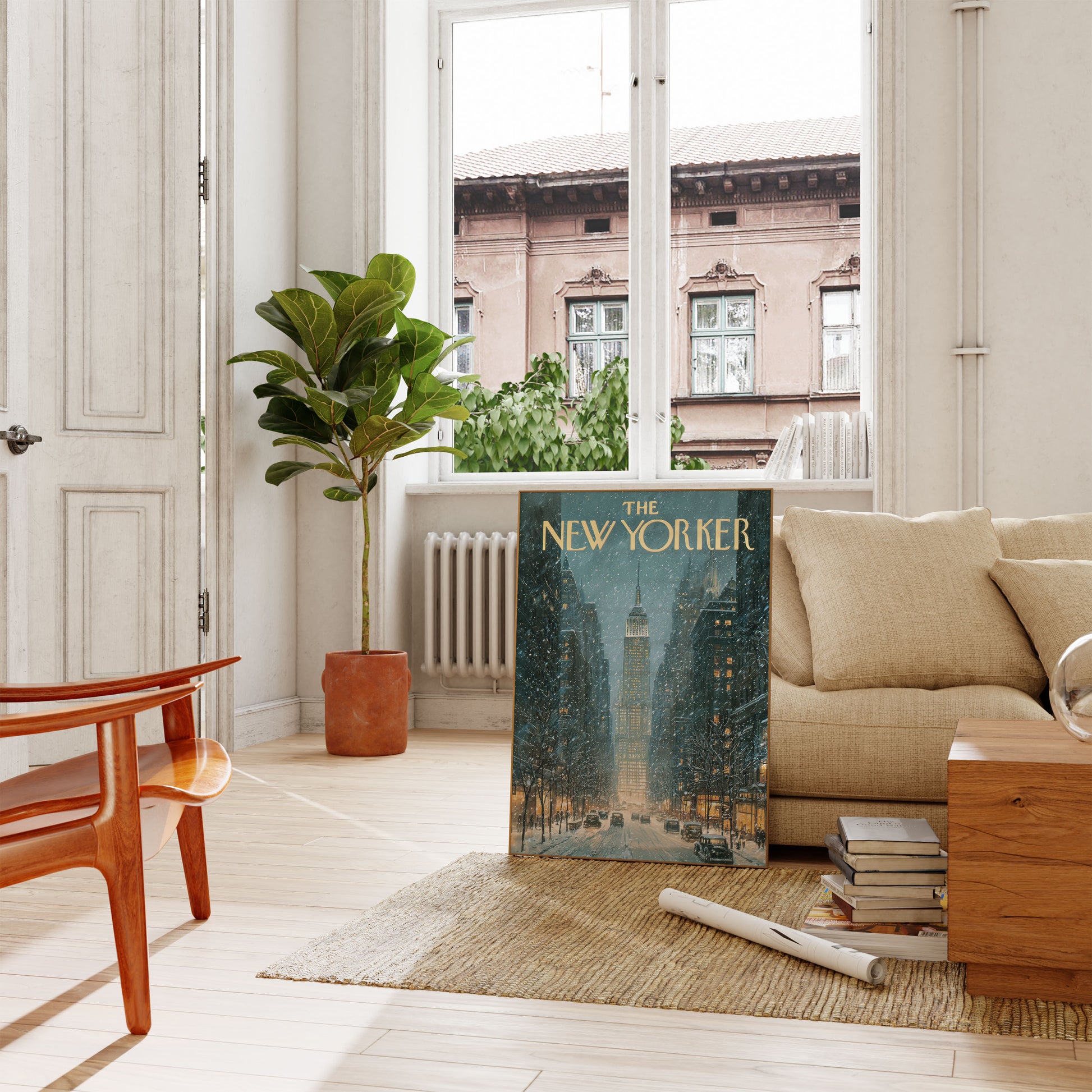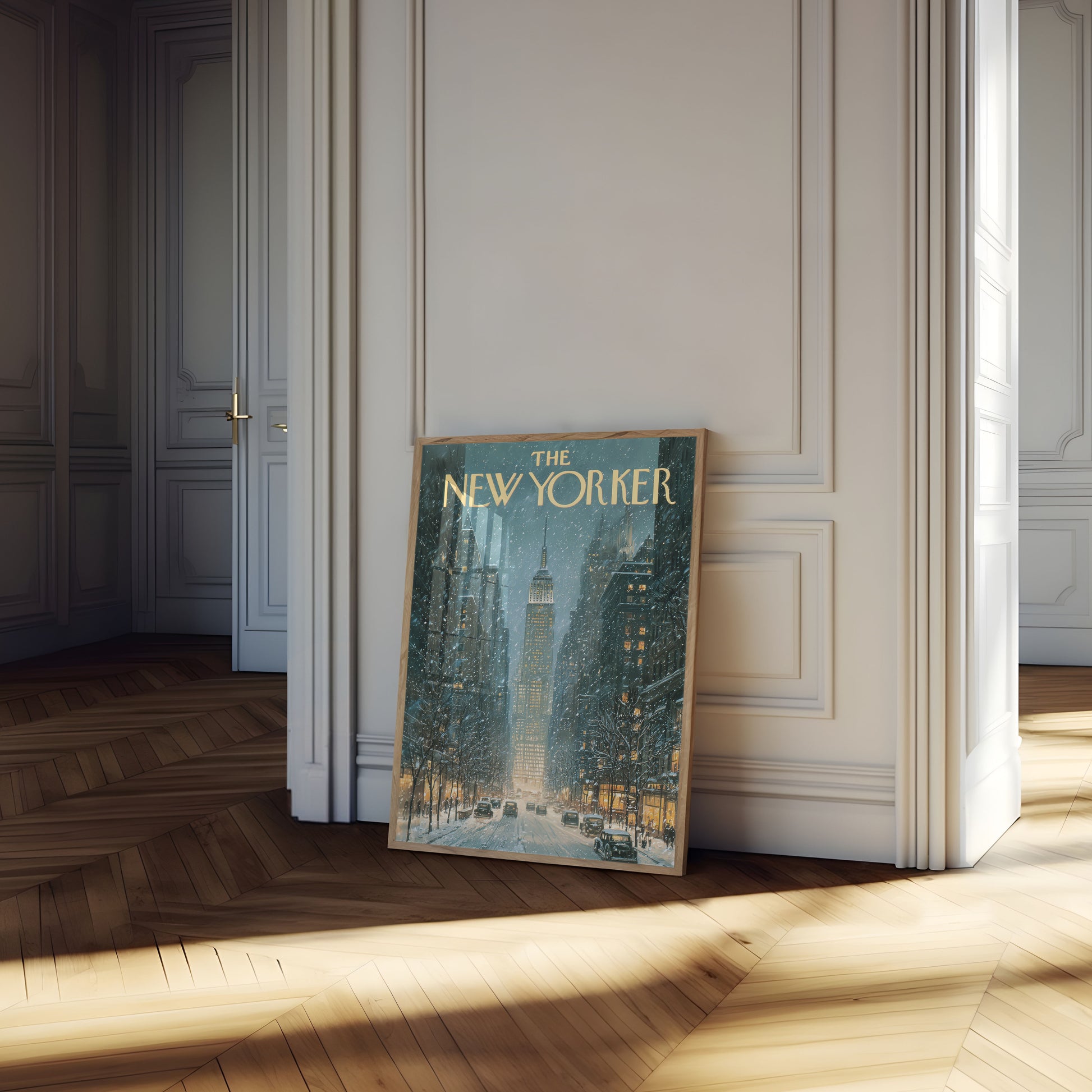 Immerse yourself in the enchanting winter landscape of New York City, where the iconic Empire State Building stands luminous amidst a gentle snowfall. This mesmerizing artwork captures the serene beauty of a classic winter evening, with vintage cars gliding down snow-lined streets and warm golden lights glowing from surrounding buildings. The New Yorker-inspired scene evokes a nostalgic sense of urban romance and tranquil city moments.