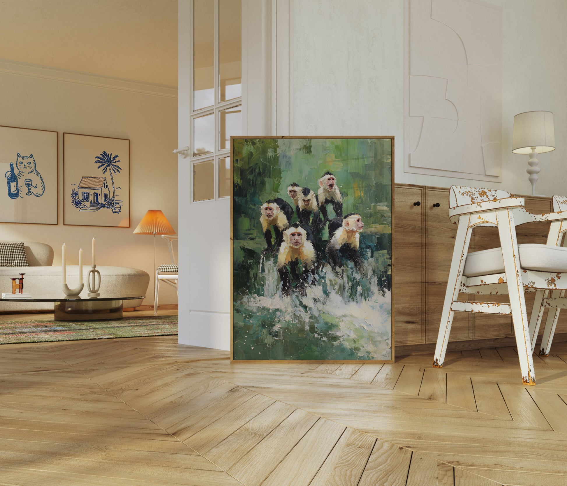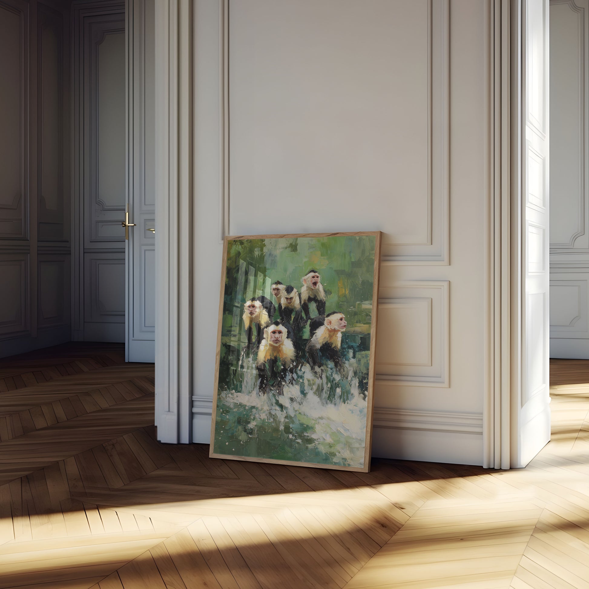 Esta impresionante obra de arte pintada captura un animado grupo de primates representados con pinceladas audaces y expresivas. La composición presenta seis monos capuchinos con distintivo pelaje blanco y negro, colocados contra un fondo verde vibrante que cobra vida con la atmósfera de la jungla. El estilo impresionista del artista crea un ambiente dinámico y energético, con la expresión de boca abierta de un mono agregando personalidad y encanto a esta escena de vida silvestre. La técnica de pintura suave y estratificada y los tonos dorados cálidos mezclados con verdes frescos crean profundidad e interés visual, haciendo que esta pieza sea perfecta para cualquiera que ame los animales y el arte contemporáneo.