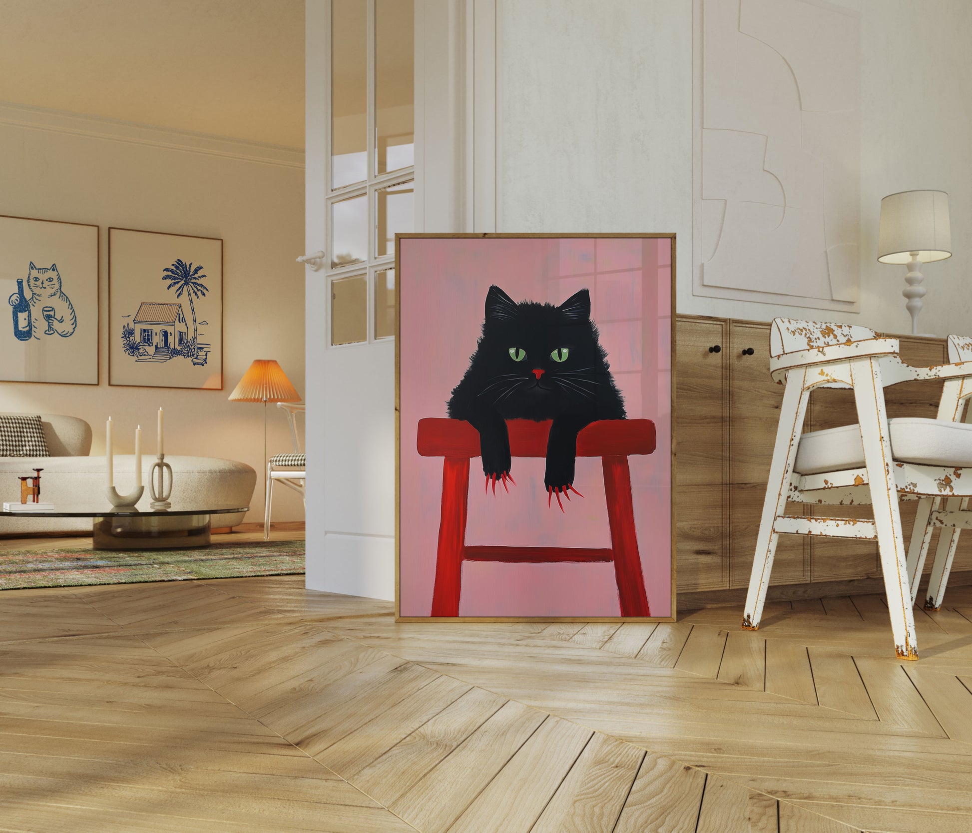Step into a world of feline mystique with this striking black cat portrait, perched dramatically on a bold red stool. Emerald green eyes pierce through luxurious midnight-black fur, creating an arresting visual that blends playful edge with sophisticated art style. The soft pink background provides a delicate contrast to the cat's intense presence and vivid crimson details.