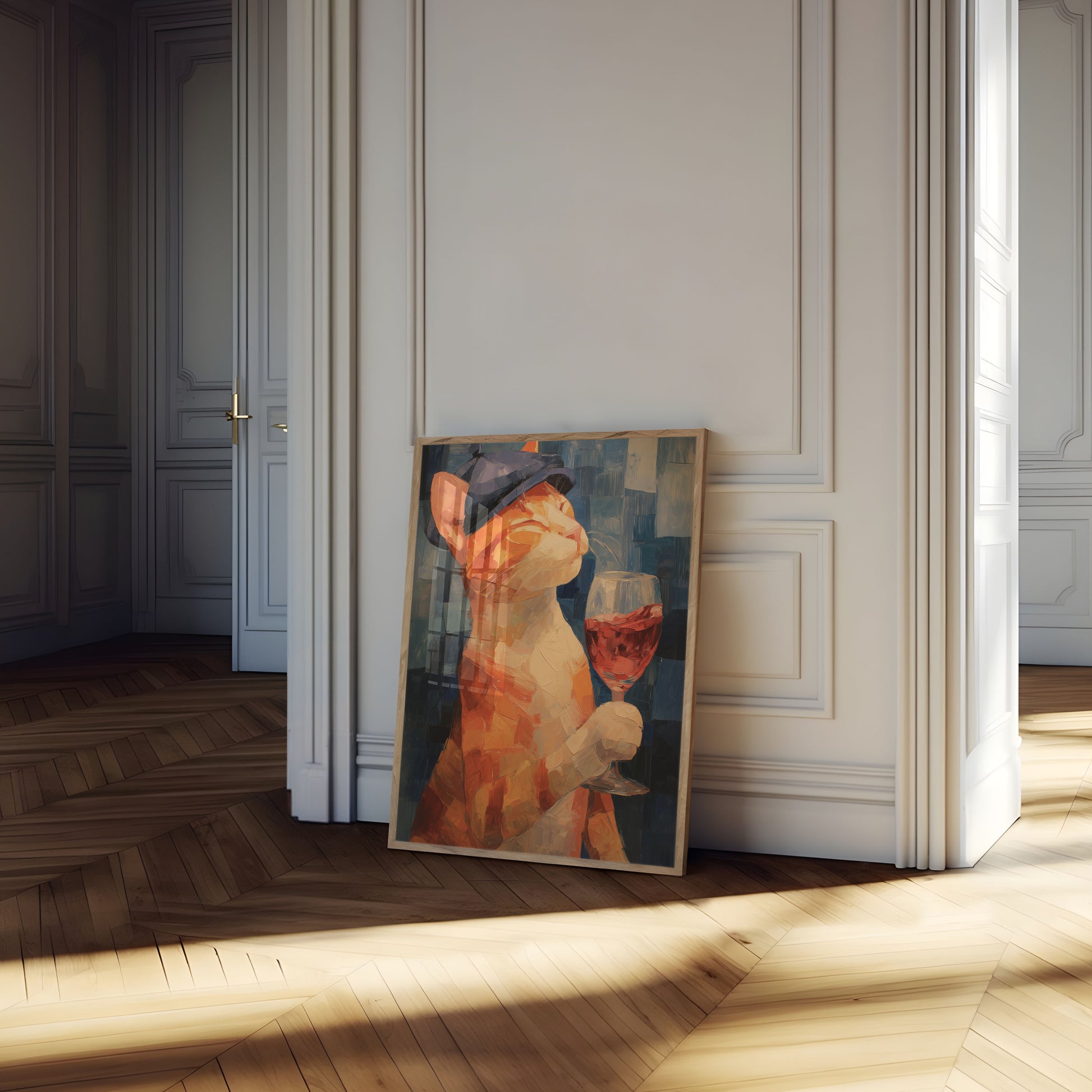 Una exquisita pintura al óleo que presenta a un elegante gato naranja con un elegante sombrero, sosteniendo delicadamente una copa de vino tinto. La obra captura un momento caprichoso de sofisticación felina, con cálidos y ricos tonos naranjas y un fondo azul frío que crea una narrativa visual impactante.