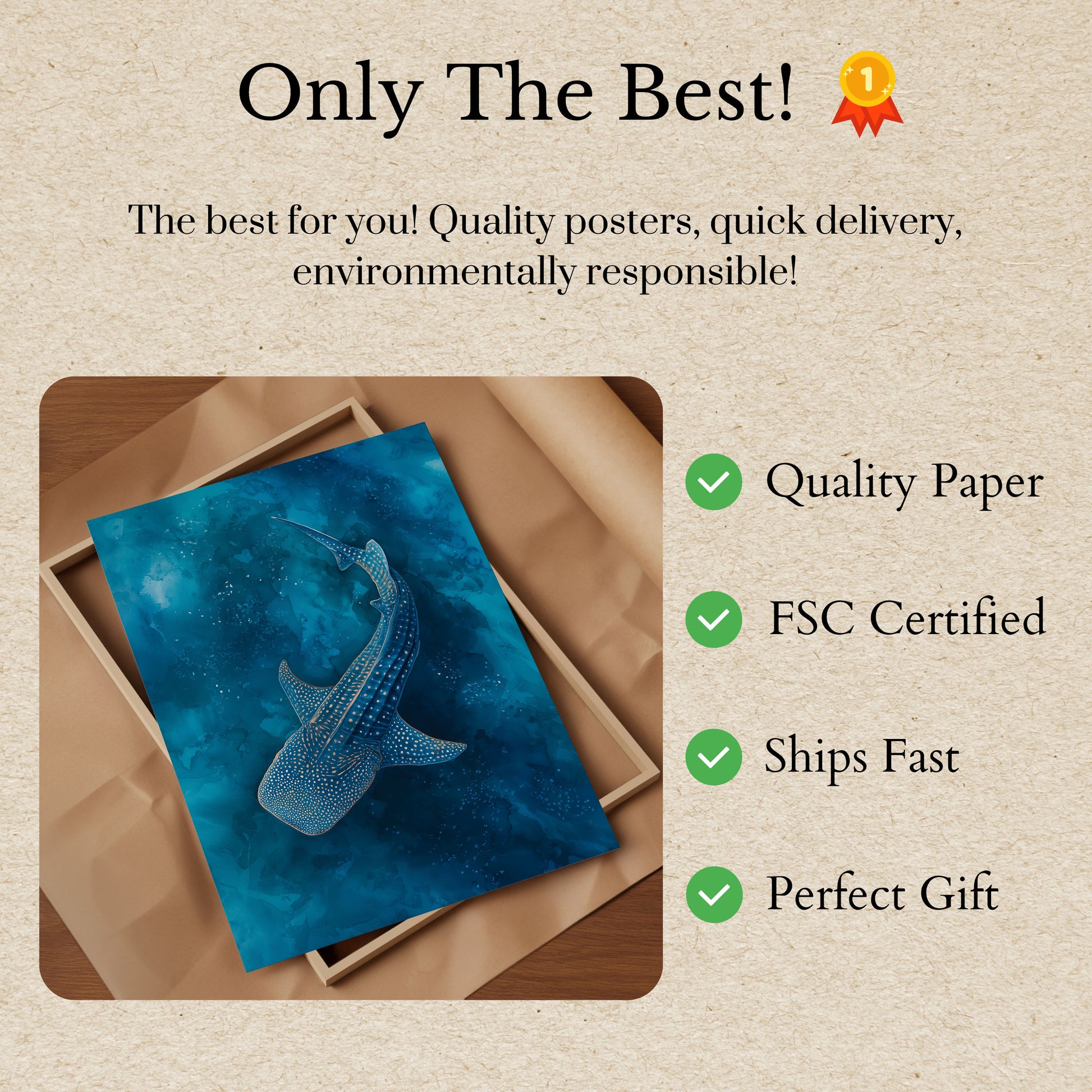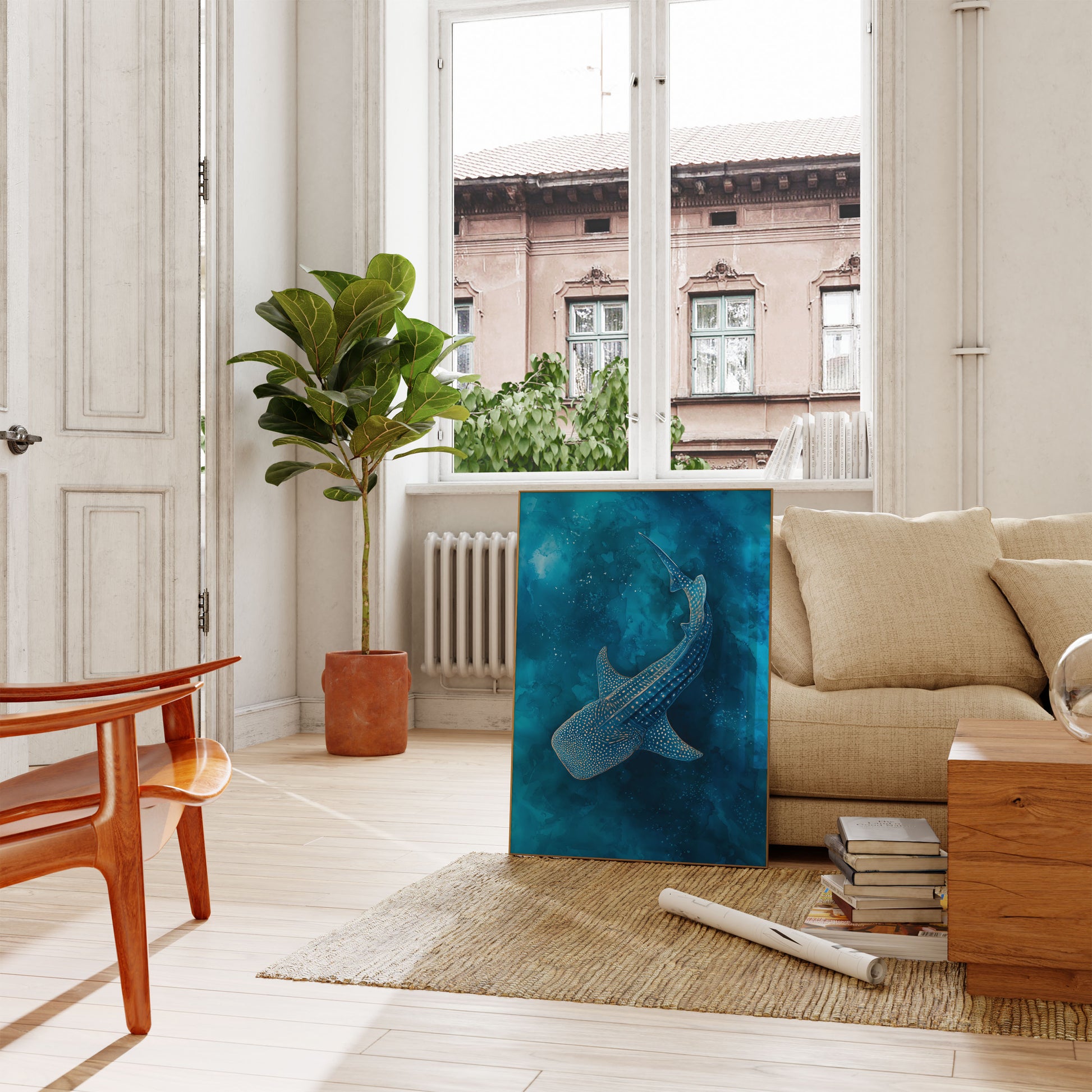 Dive into the mesmerizing depths of the ocean with this stunning whale shark artwork. Captured in rich, ethereal shades of blue, the majestic creature glides through a dreamy underwater landscape, its distinctive spotted pattern creating a hypnotic visual symphony. The intricate details and luminous watercolor-like background invite viewers to lose themselves in the serene marine world.