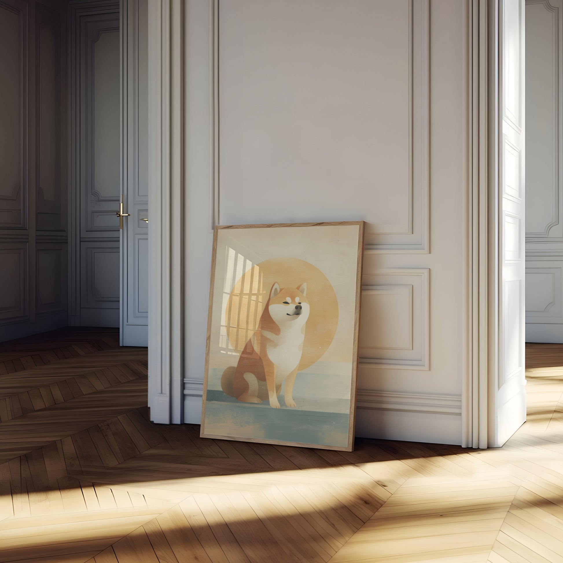 Una ilustración serena y elegante de un perro Shiba Inu, bañado por una cálida luz dorada sobre un fondo minimalista. La obra captura los distintivos rasgos de zorro y la calma del perro con colores suaves y tenues y una atmósfera onírica. Una combinación perfecta de diseño moderno y adorable encanto canino.