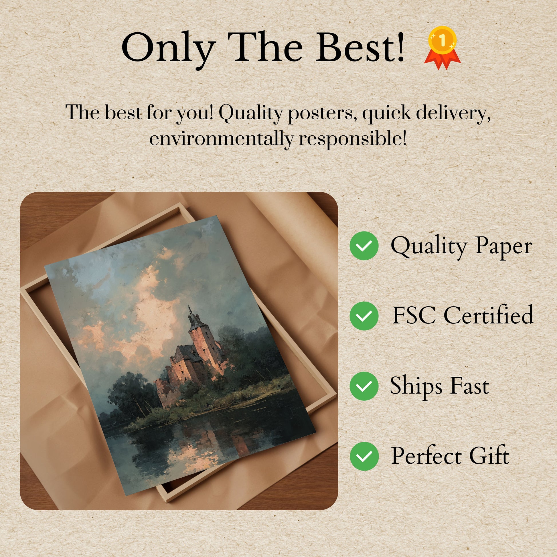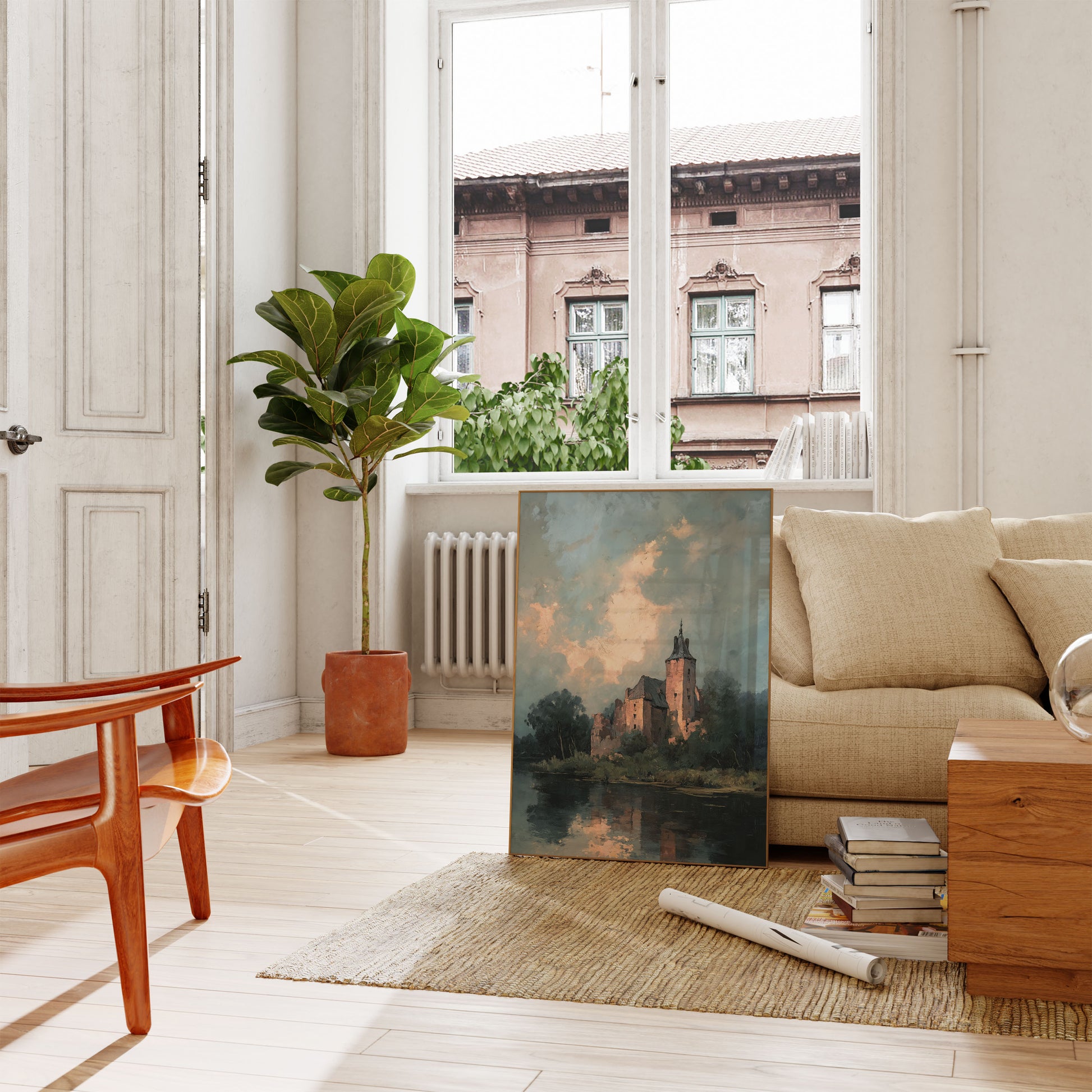 Immerse yourself in the haunting beauty of this atmospheric landscape painting, where a weathered medieval castle stands sentinel beside a tranquil lake. Soft amber and slate tones blend seamlessly in the dramatic sky, casting a warm glow on the stone fortress and creating a mesmerizing reflection in the still waters below. The painting captures a moment of ethereal quietude, where history and nature merge in a breathtaking tableau of romantic melancholy.