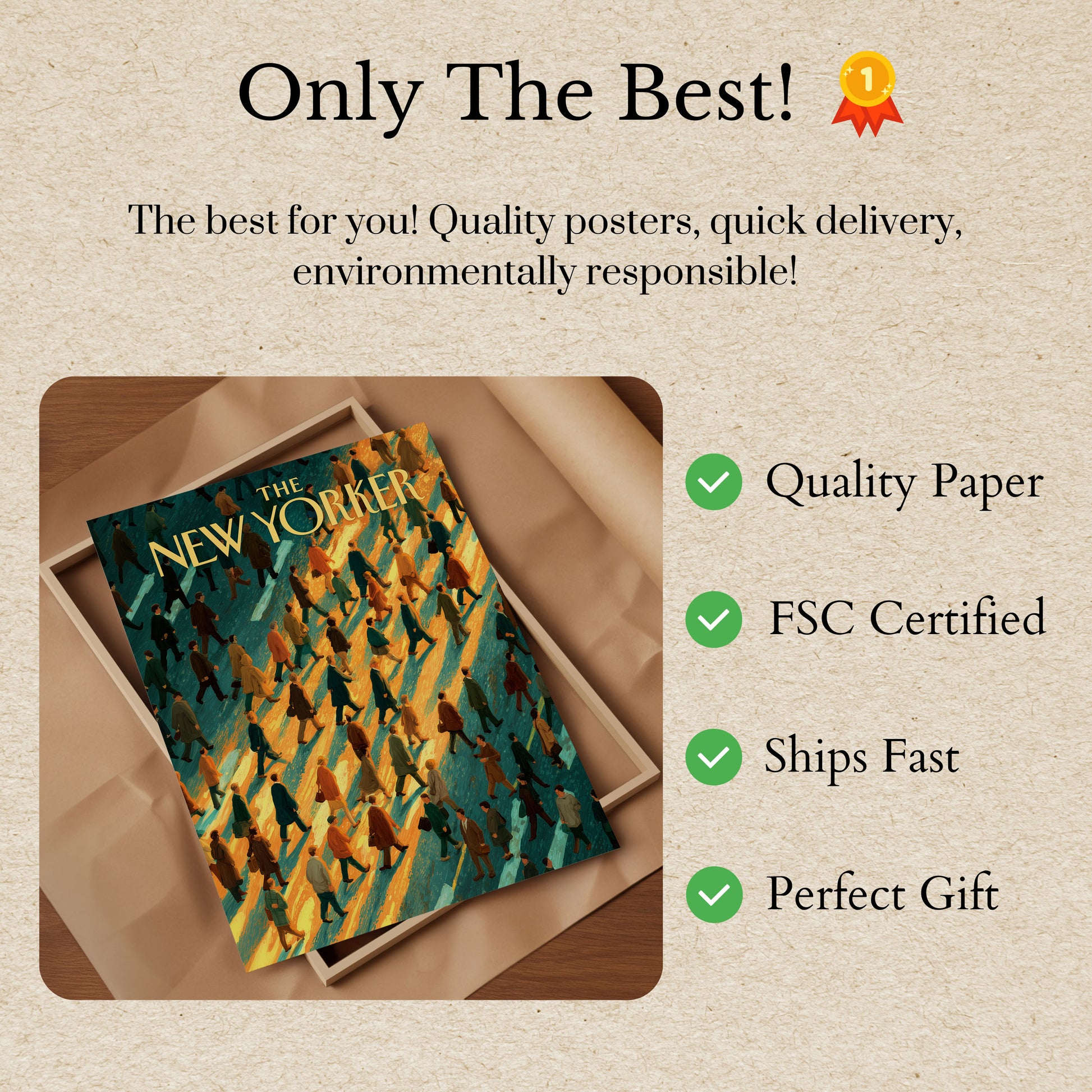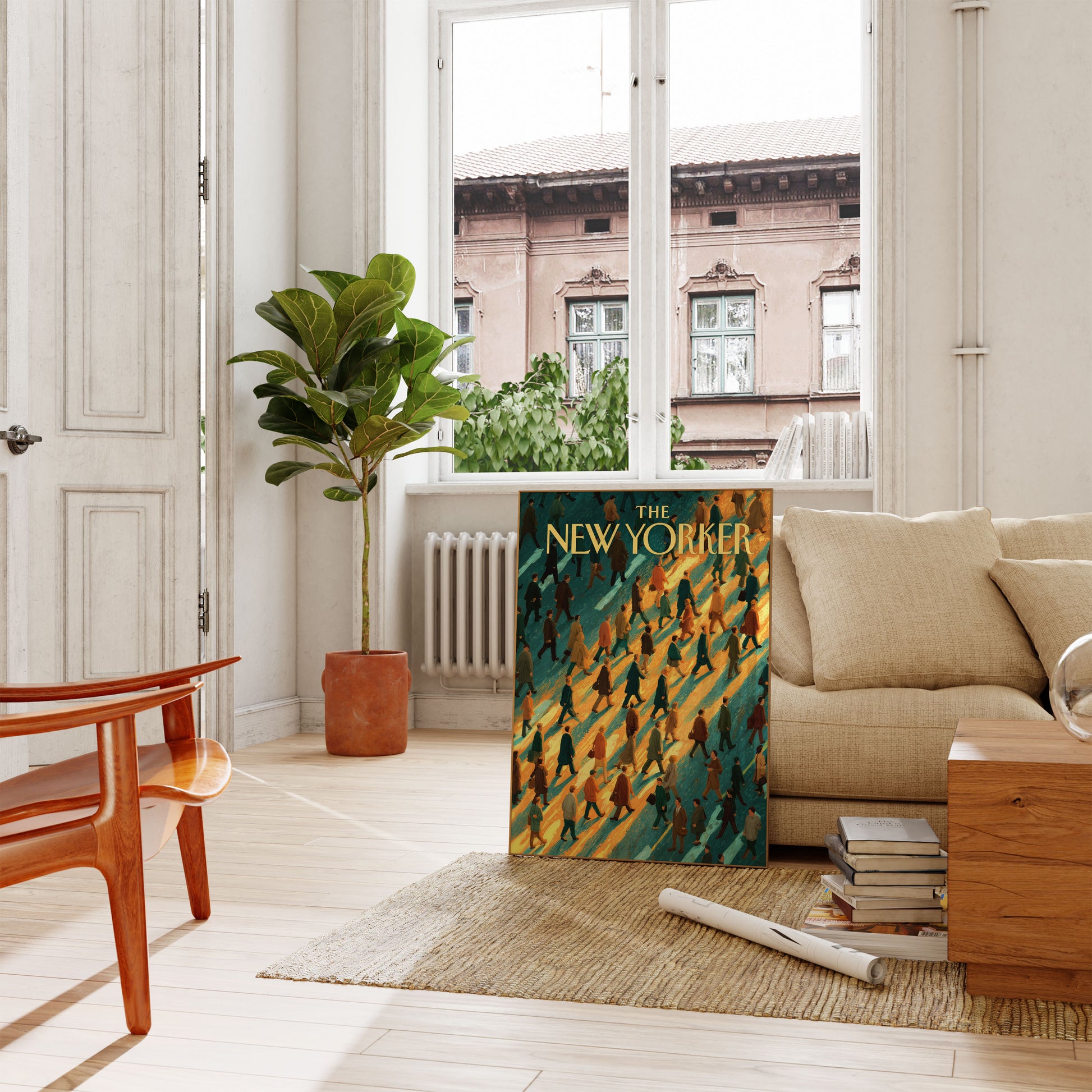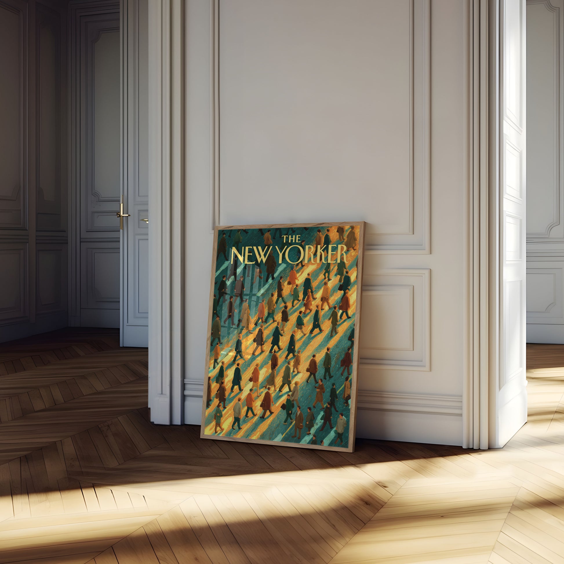 Dive into the mesmerizing world of urban movement with this stunning New Yorker magazine cover poster. Capturing the pulse of city life, the artwork features a dynamic crowd walking across diagonally lit streets in warm amber and cool teal tones. Each figure moves with purpose, creating a rhythmic dance of daily commute that speaks to the collective energy of metropolitan life.