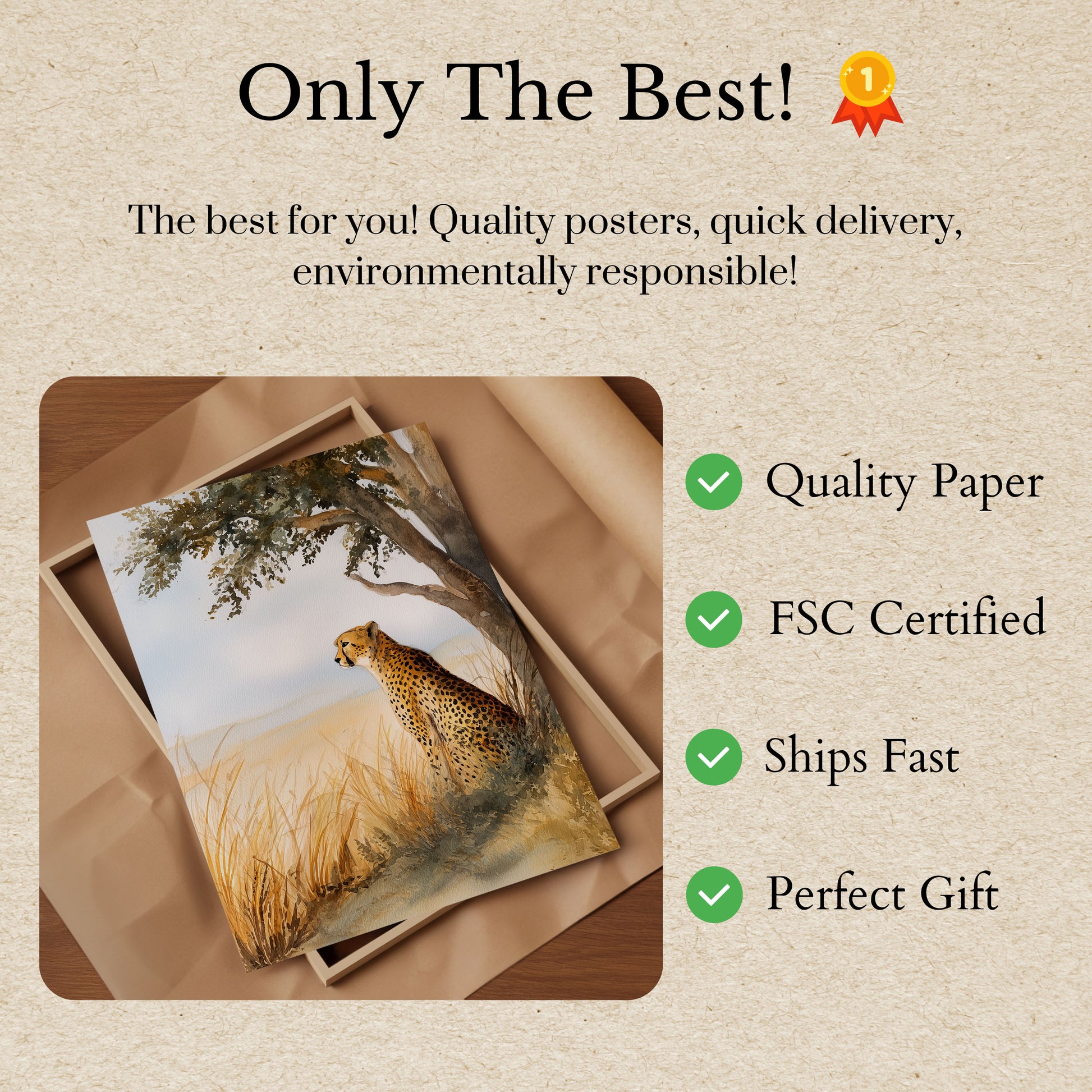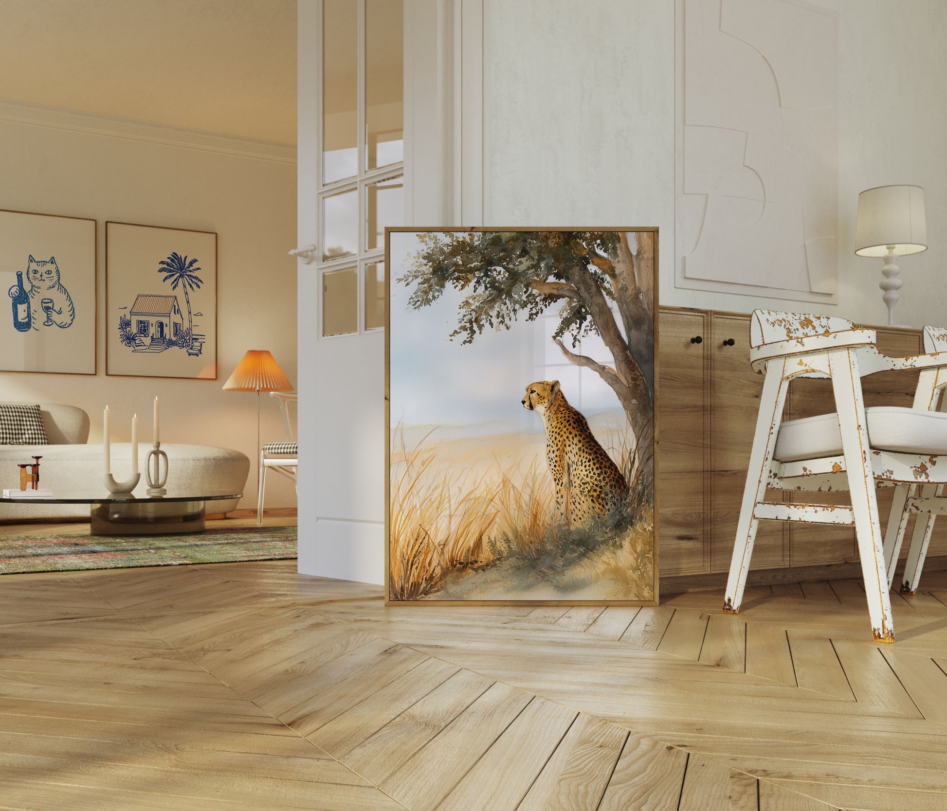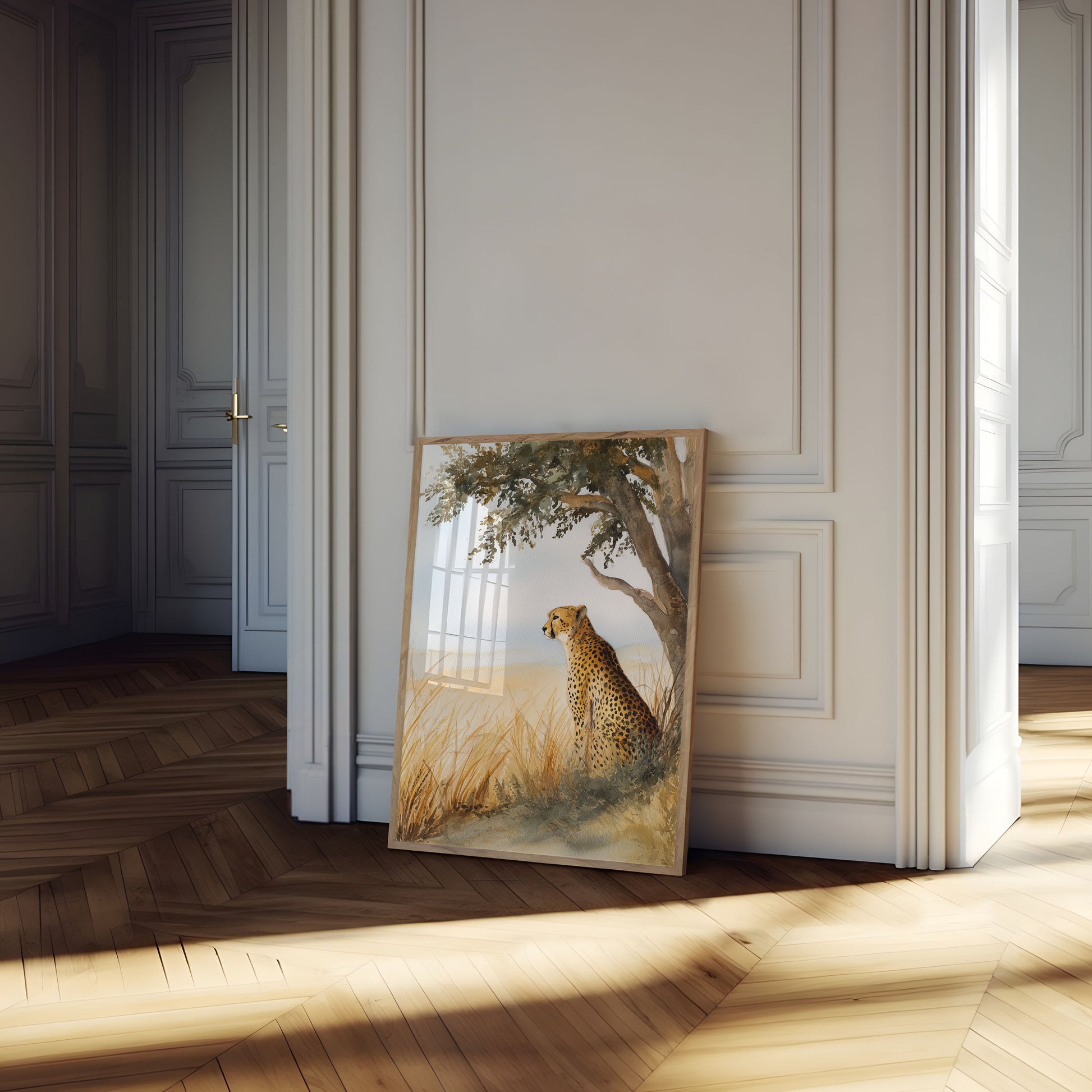 Una impresionante ilustración en acuarela captura un majestuoso guepardo posado bajo una imponente acacia, rodeado de praderas doradas. La obra retrata con belleza al elegante depredador en su hábitat natural, con suaves tonos tierra y delicadas pinceladas que dan vida al paisaje de la sabana. Cada detalle, desde el distintivo pelaje moteado del guepardo hasta la hierba ondulante y el árbol erosionado, crea una escena impresionante de belleza salvaje y serena contemplación.