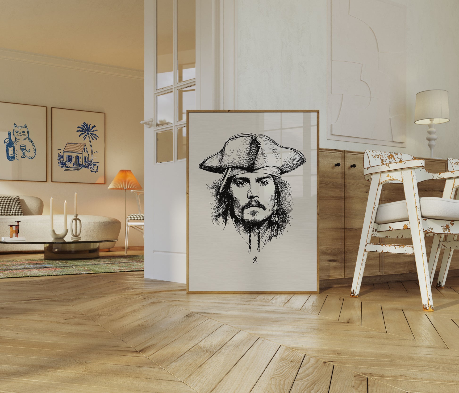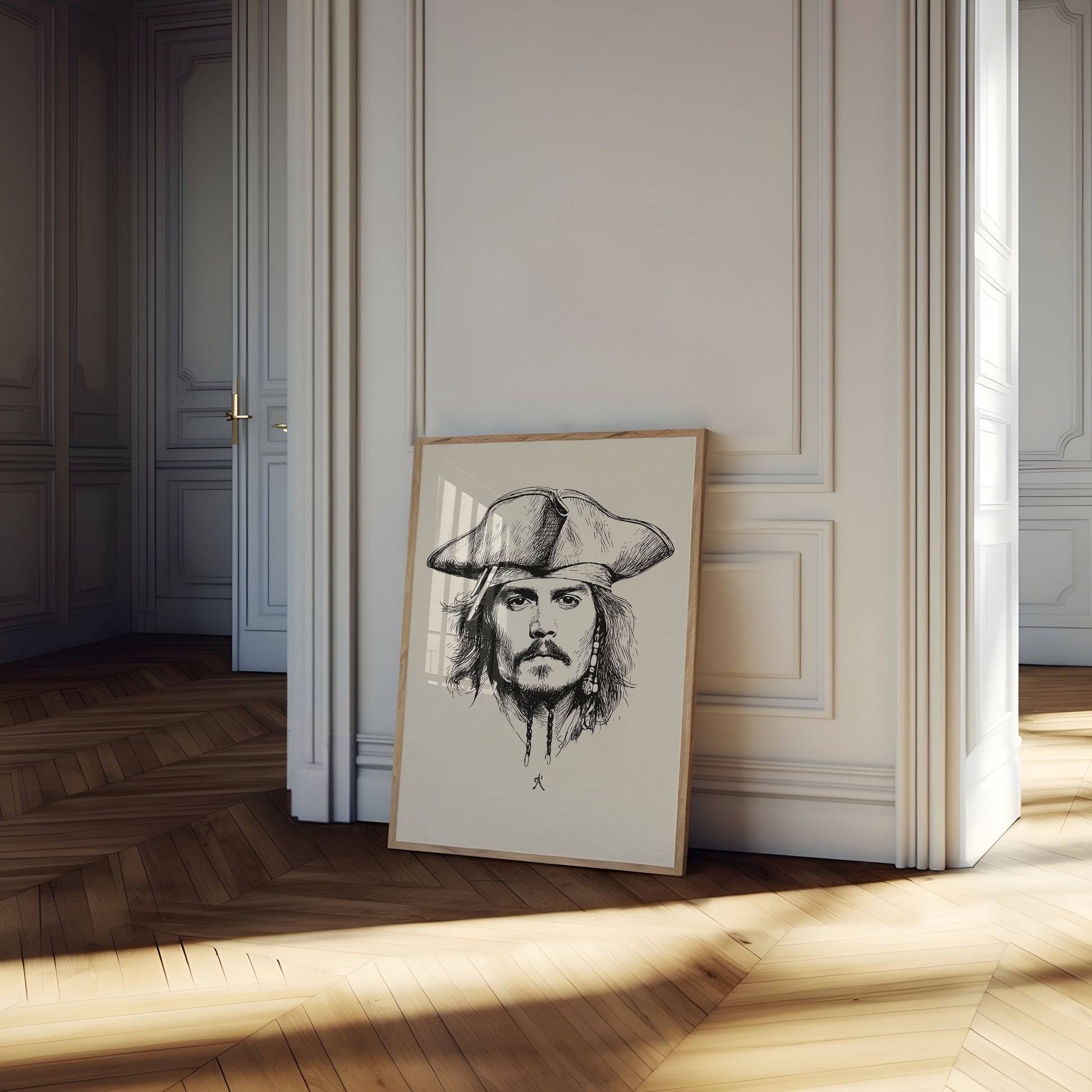 Un impresionante boceto en blanco y negro captura la esencia de un legendario capitán pirata, con un intrincado trazo que resalta cada detalle de la intensa mirada del personaje y su característico tricornio. El retrato muestra a un marinero robusto con cabello largo, barba trenzada y una mirada penetrante que evoca aventura y misterio marítimo.