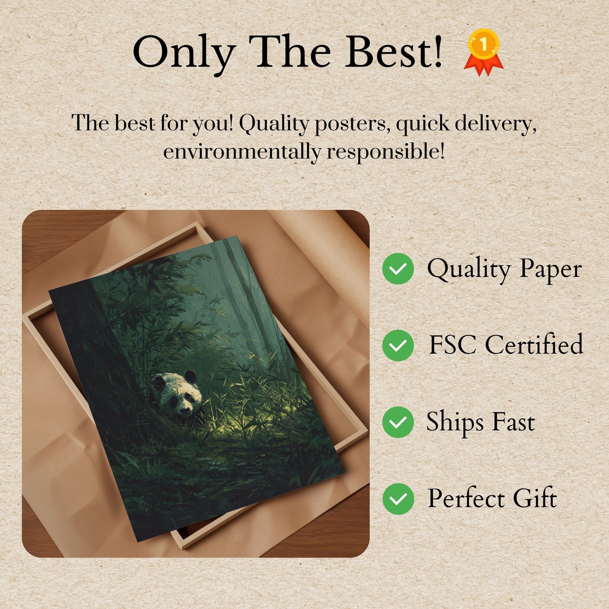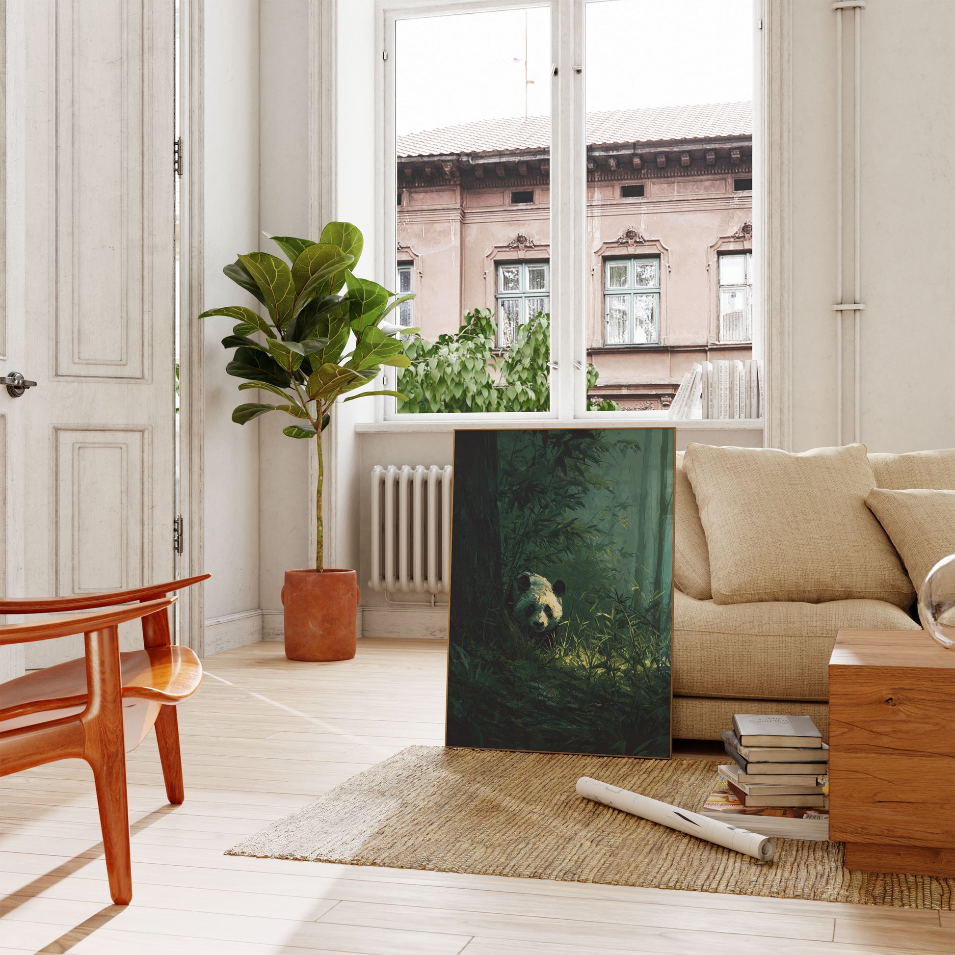 Discover a serene moment in the lush bamboo forest with this captivating panda artwork. Soft green hues and delicate brushstrokes capture the gentle spirit of a panda nestled among vibrant leaves and misty forest shadows. The painting evokes a sense of tranquility and connection with nature's hidden world.