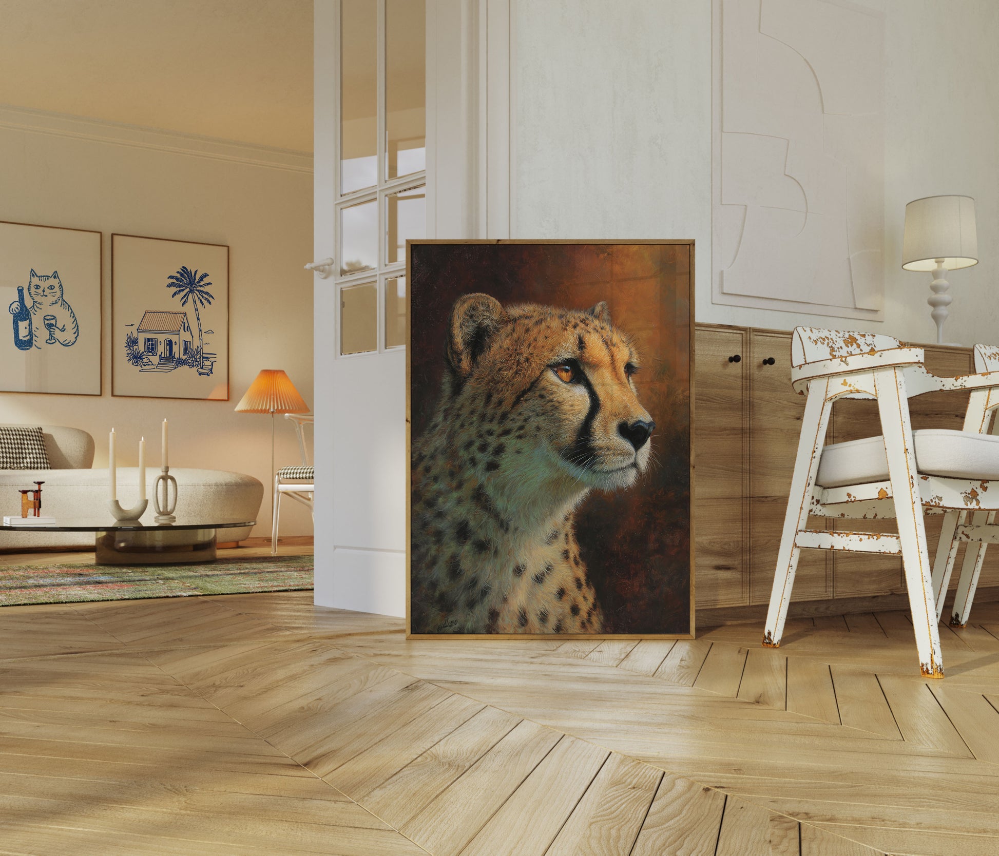 Sumérgete en la impresionante belleza de este impresionante retrato de guepardo, capturado con extraordinario detalle artístico y calidez. La obra muestra el perfil del magnífico felino sobre un fondo de tonos ámbar intensos, resaltando su distintivo pelaje moteado y su penetrante ojo dorado. Cada pincelada aporta una increíble profundidad e intensidad emocional a esta obra maestra de la vida silvestre, invitando al espectador a conectar con la presencia serena y a la vez poderosa del guepardo.