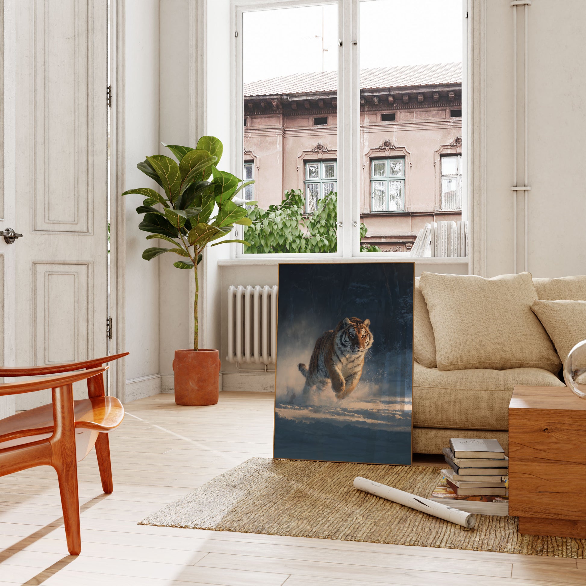 Witness the raw power and breathtaking beauty of a Siberian tiger exploding through a snow-covered landscape. This stunning wildlife art captures the intense movement and primal energy of a tiger in full sprint, with delicate snow crystals flying and a deep, misty forest backdrop creating a mesmerizing winter scene. Every brushstroke and detail brings the magnificent creature to life, showcasing the strength and grace of one of nature's most incredible predators.