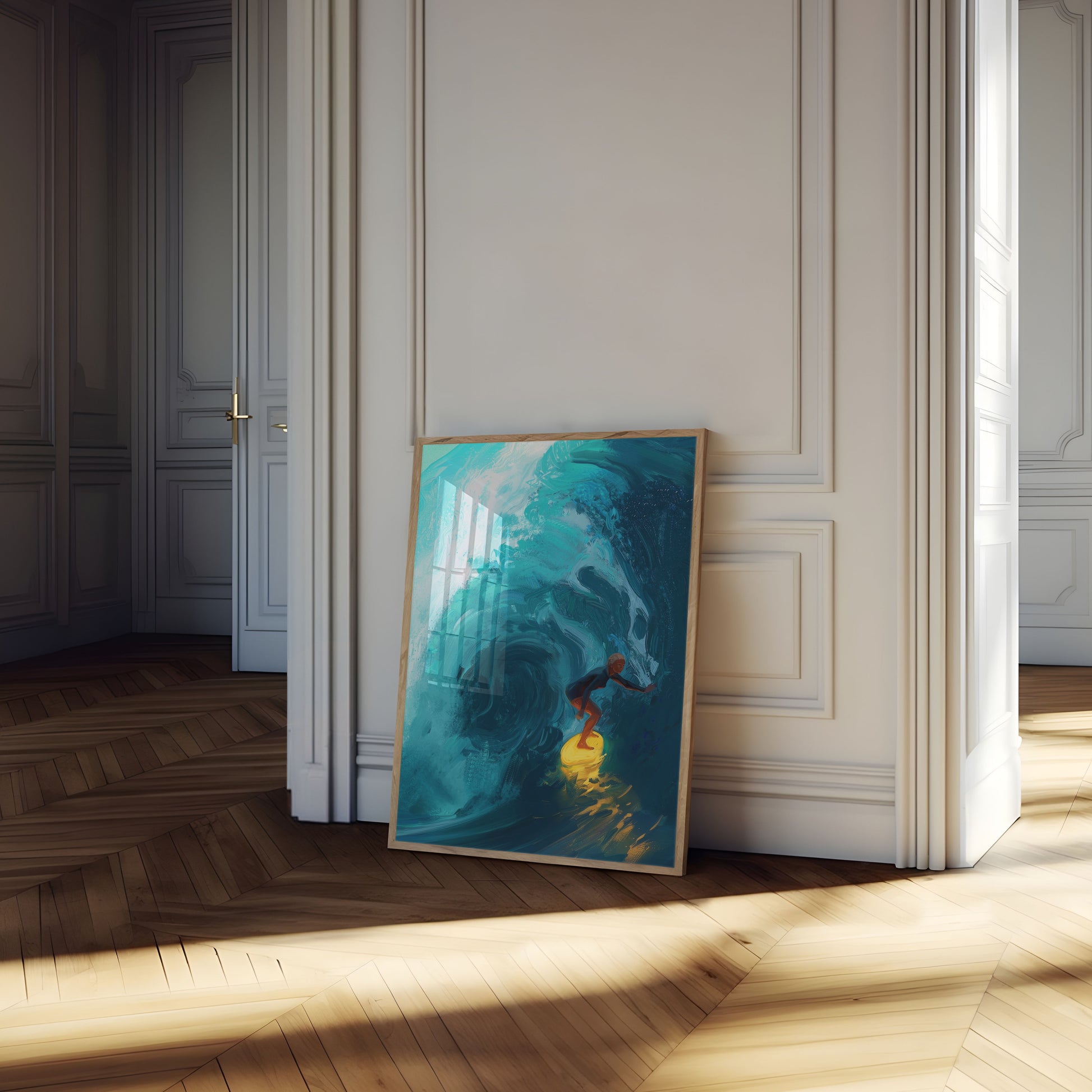 Dive into the breathtaking world of surfing with this stunning artistic representation of a surfer riding a massive turquoise wave. The dynamic artwork captures the raw power and beauty of the ocean, featuring a silhouetted surfer balanced on a glowing yellow focal point amidst swirling deep blue and teal waves. The intricate brushstrokes and vibrant color palette create an immersive experience that brings the intensity and magic of surfing to life.