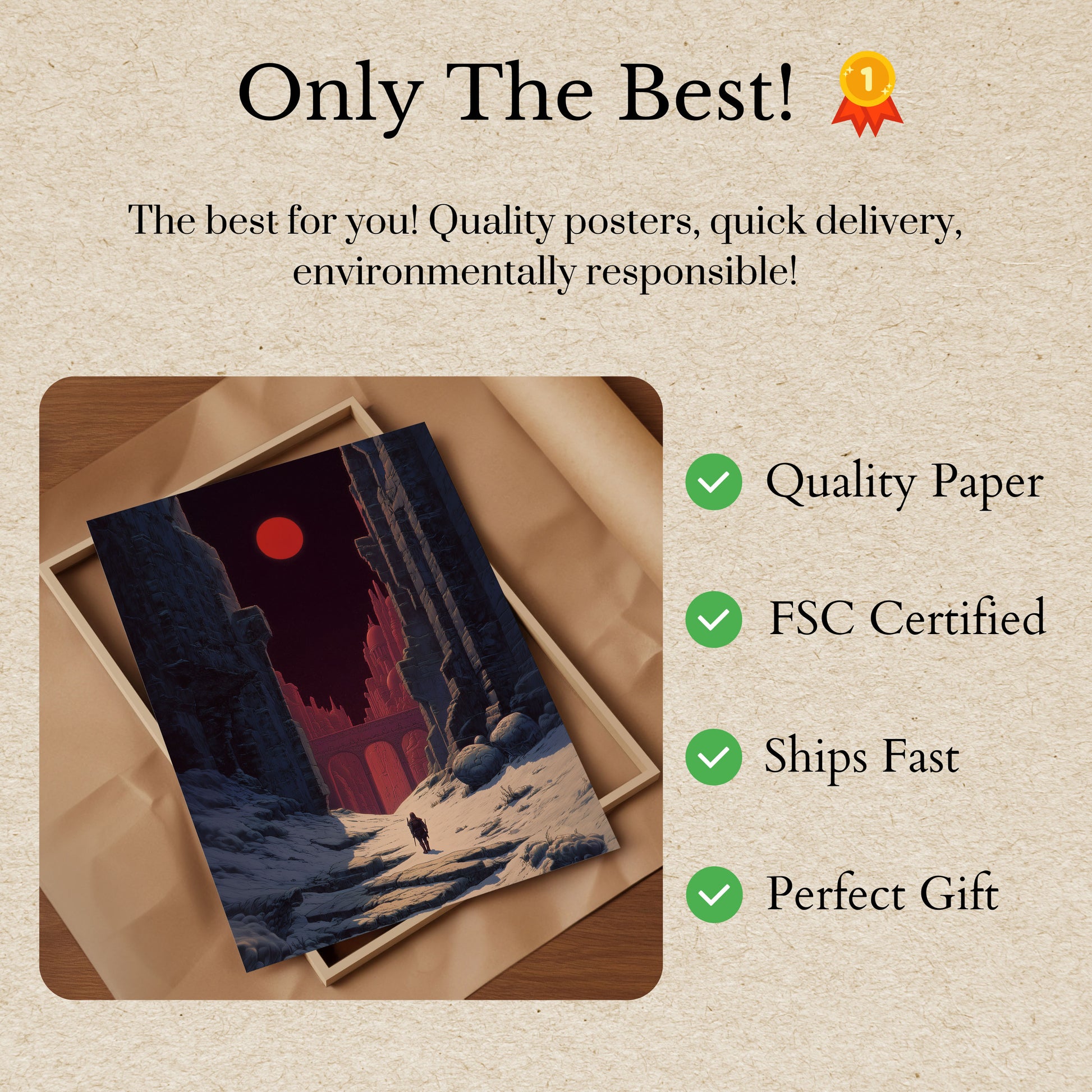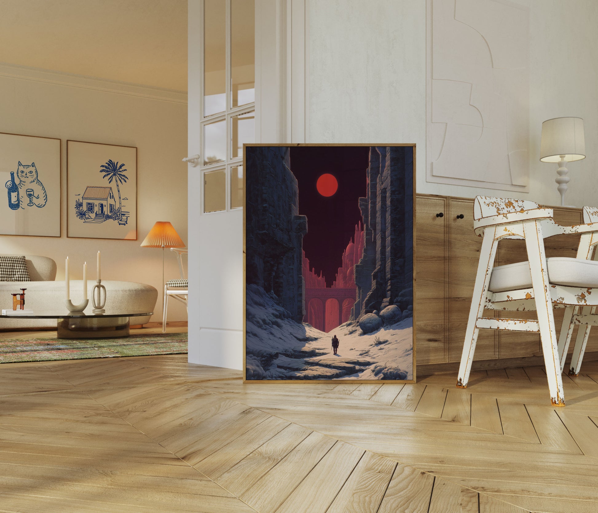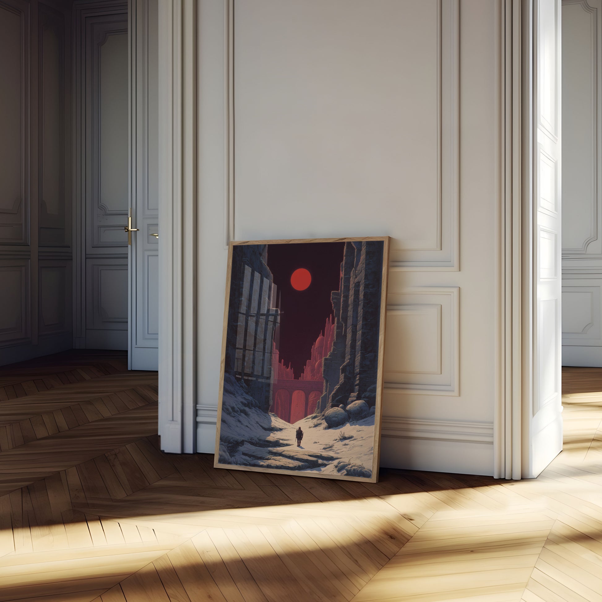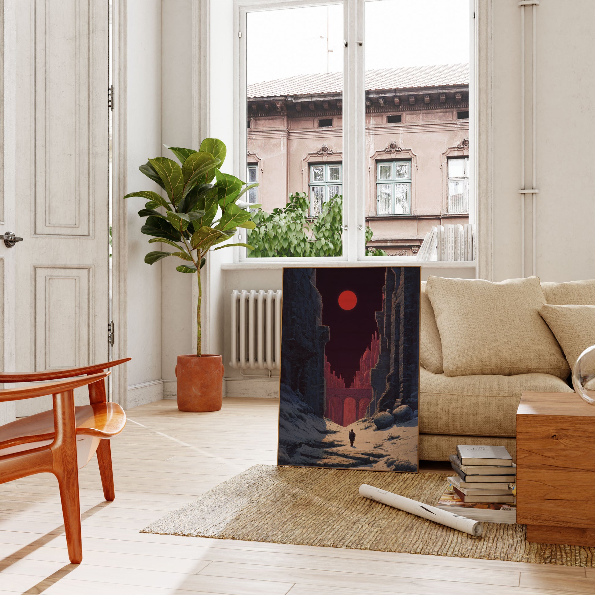 Adéntrate en un paisaje de ciencia ficción inquietante donde estructuras de piedra imponentes enmarcan un cielo carmesí de otro mundo. Un viajero solitario se encuentra en el vasto desierto debajo, empequeñecido por una arquitectura antigua bañada en el brillo inquietante de un sol rojo sangre. Esta obra de arte de fantasía impactante combina la grandeza de civilizaciones olvidadas con una atmósfera apocalíptica, creando una escena fascinante que evoca misterio, aislamiento y asombro. La interacción dramática de azules profundos, tonos cálidos del desierto y matices rojo vívidos te atrae hacia un mundo que se siente tanto alienígena como extrañamente familiar, perfecto para aquellos que aman mundos de fantasía imaginativos y paisajes dramáticos.