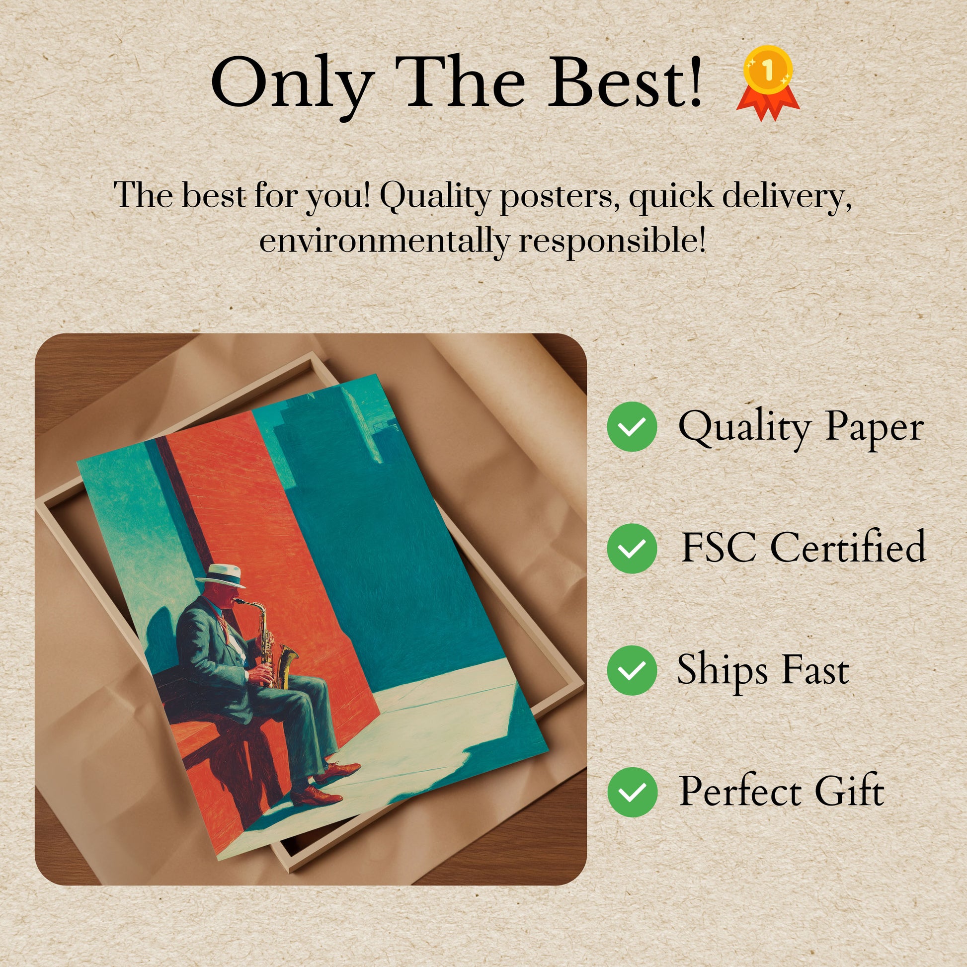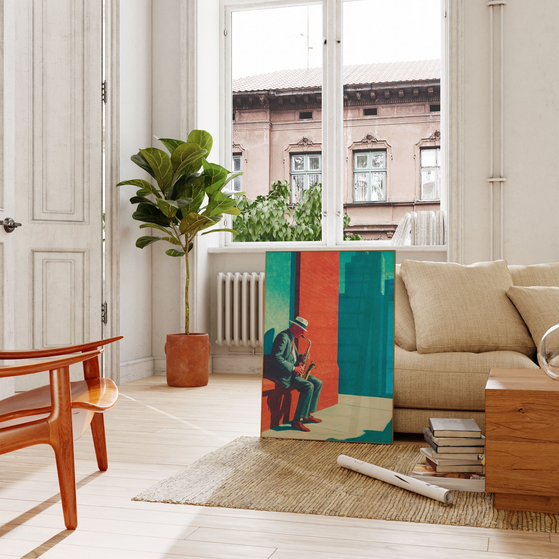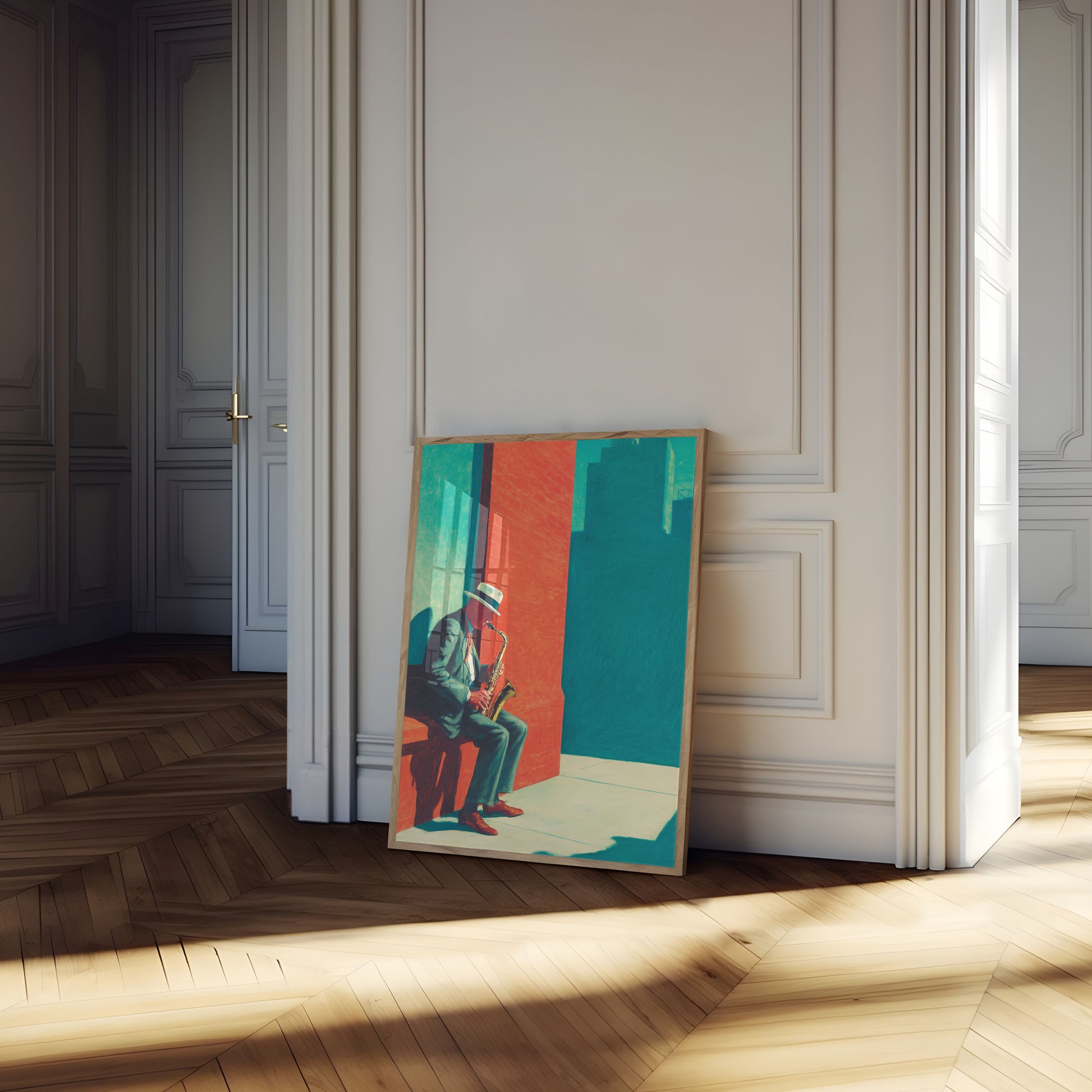 A mesmerizing urban scene captures a solitary saxophone player in a vibrant cityscape, blending the cool tones of Edward Hopper's signature style with the raw emotion of jazz. The musician sits pensively against a bold red wall, surrounded by deep teal urban shadows, creating a powerful visual narrative of solitude and musical expression. The poster evokes the timeless spirit of city life and the soulful soundtrack of urban rhythms.