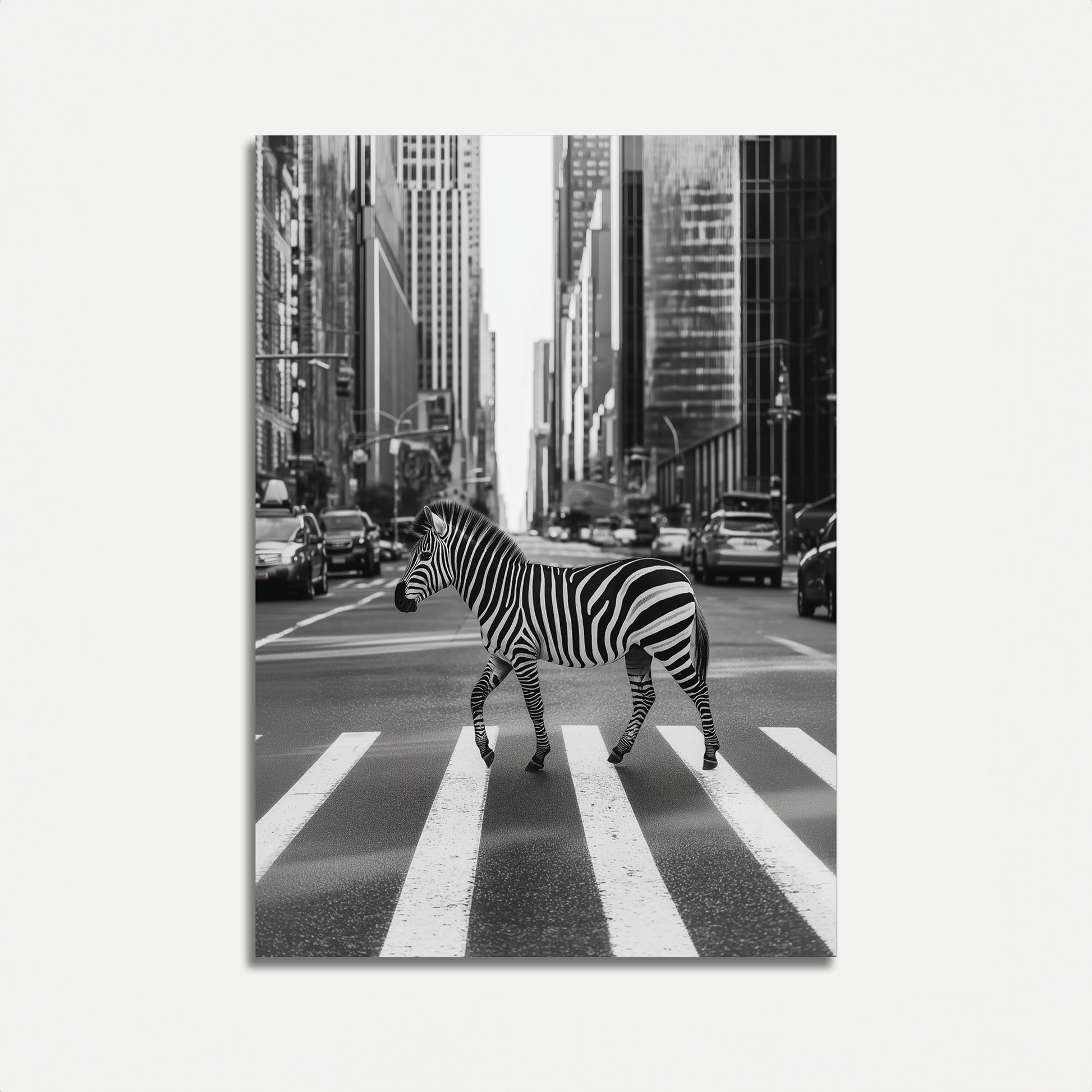 Step into a surreal urban landscape where nature meets metropolis. This striking black and white photograph captures a zebra boldly traversing a city crosswalk, its iconic stripes perfectly mirroring the zebra crossing lines. Towering skyscrapers create a dramatic backdrop, transforming an impossible moment into a breathtaking visual narrative of unexpected harmony.
