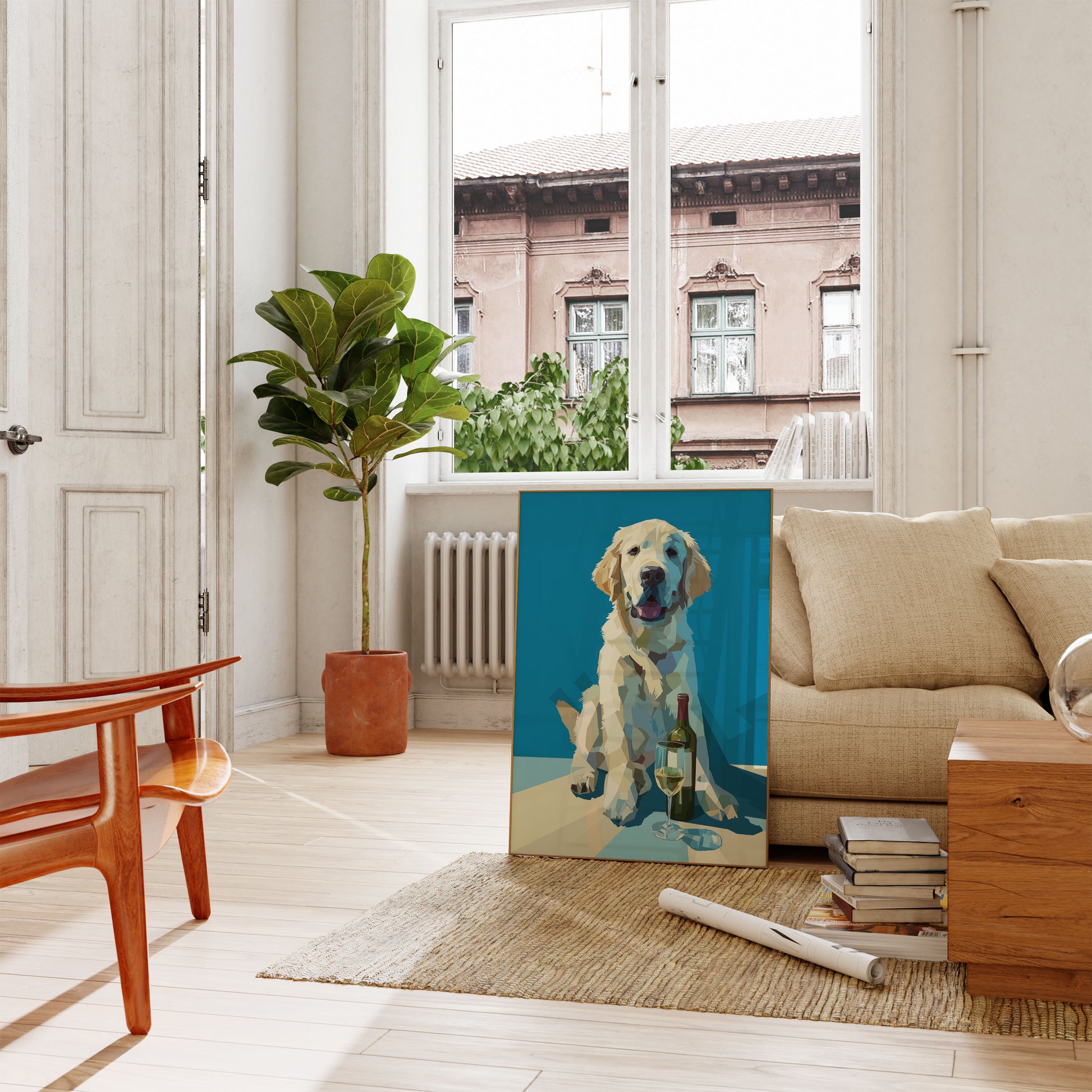 Una encantadora lámina geométrica que presenta a un encantador golden retriever sentado junto a una copa de vino blanco, en una impresionante paleta de colores azul y crema. Su estilo alegre y angular captura el rostro expresivo del perro y su pose relajada, creando una escena caprichosa que combina sofisticación con encanto canino.